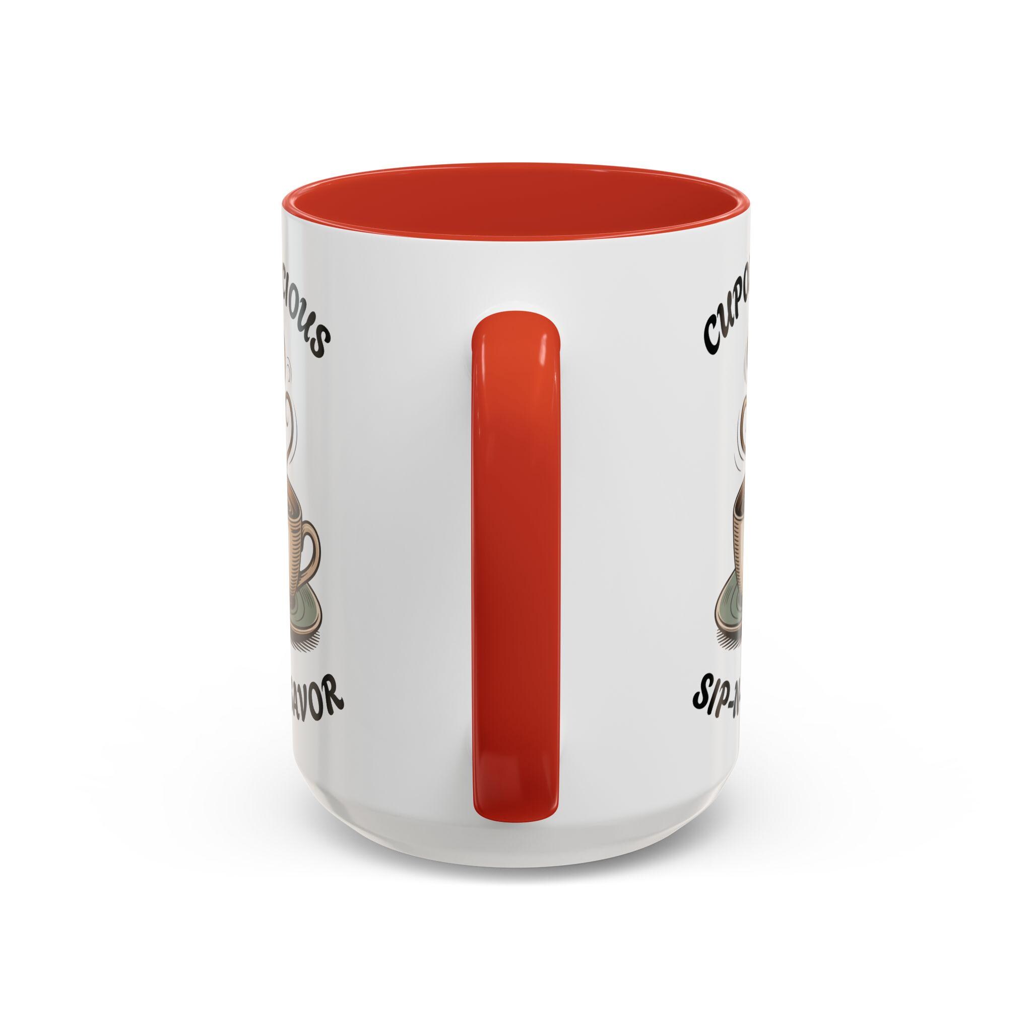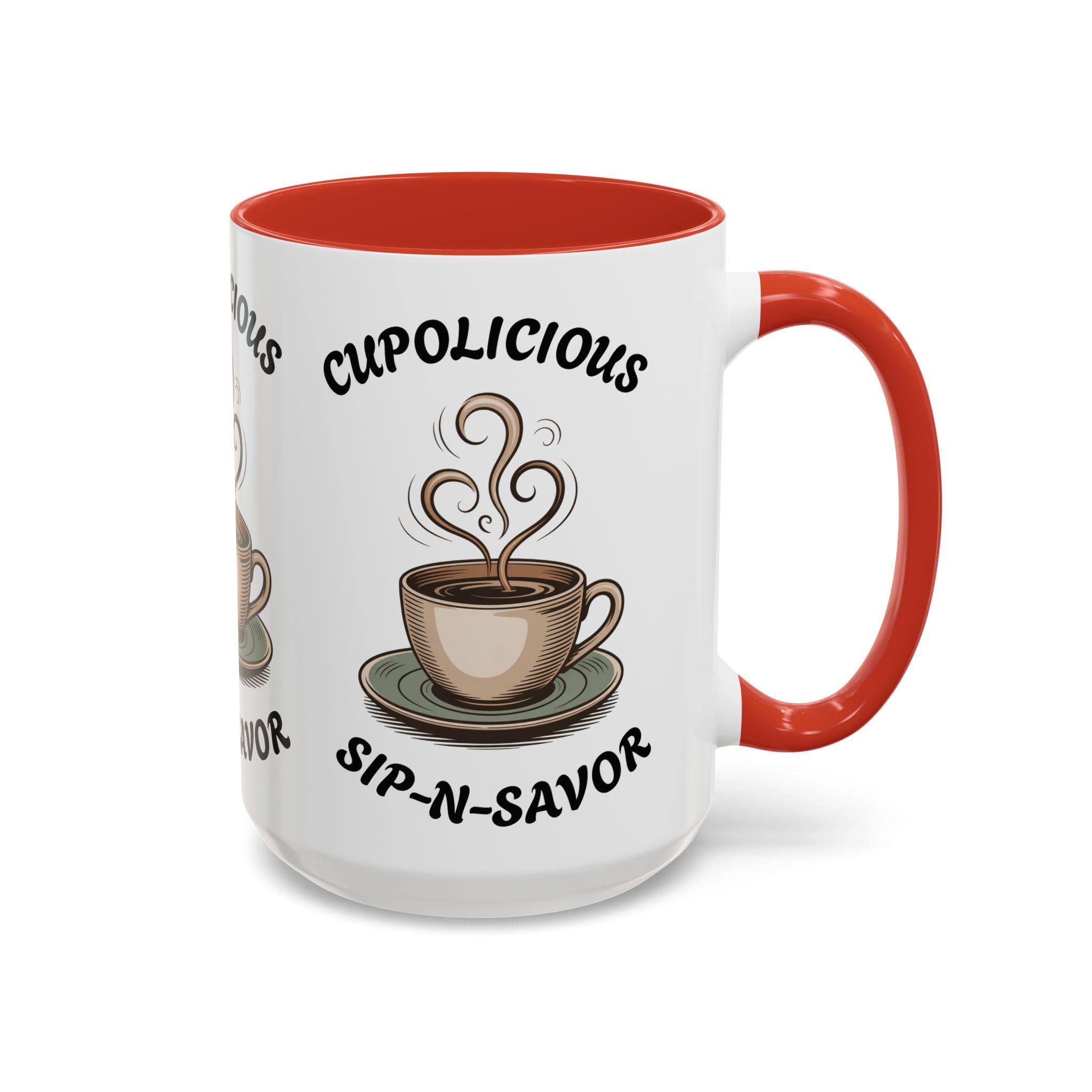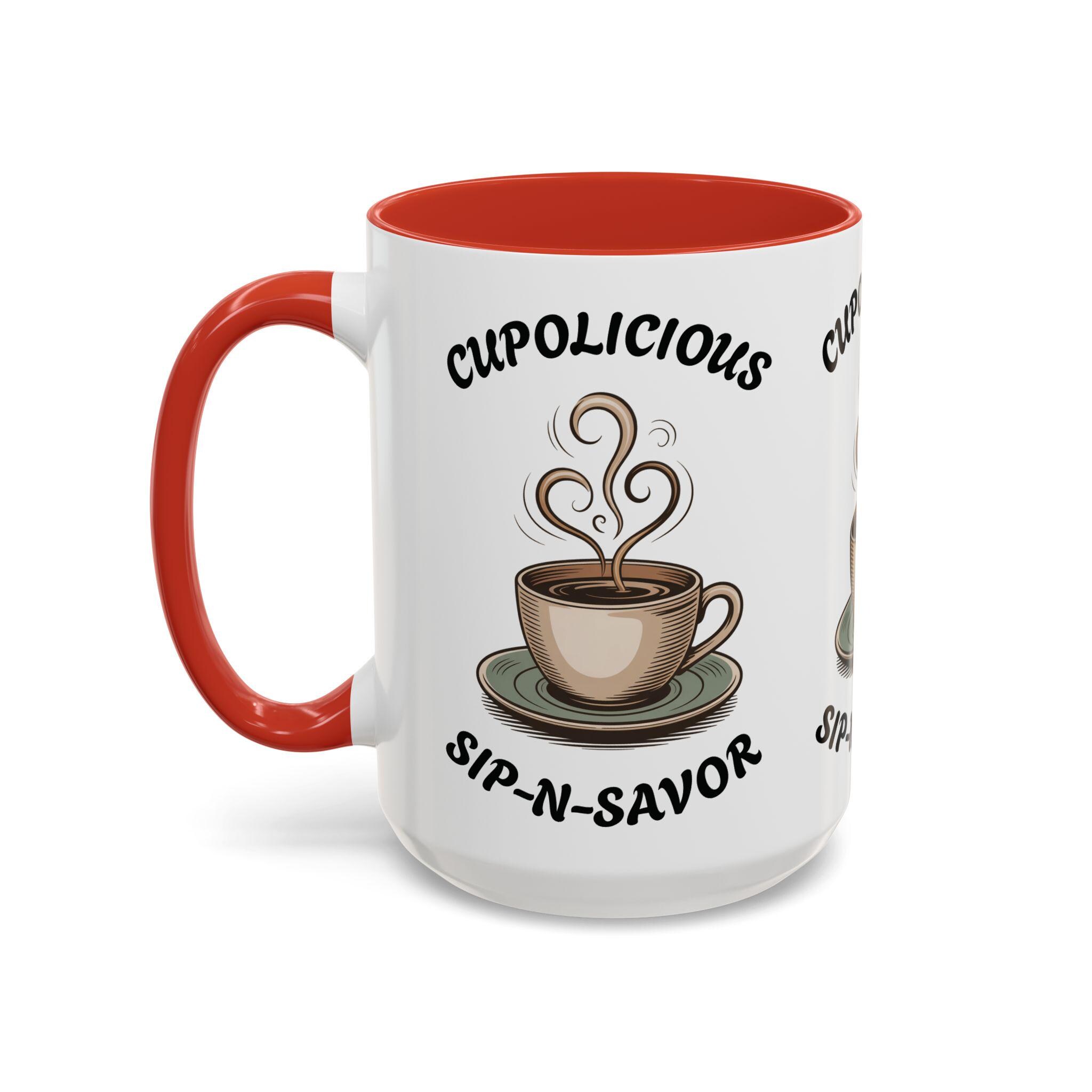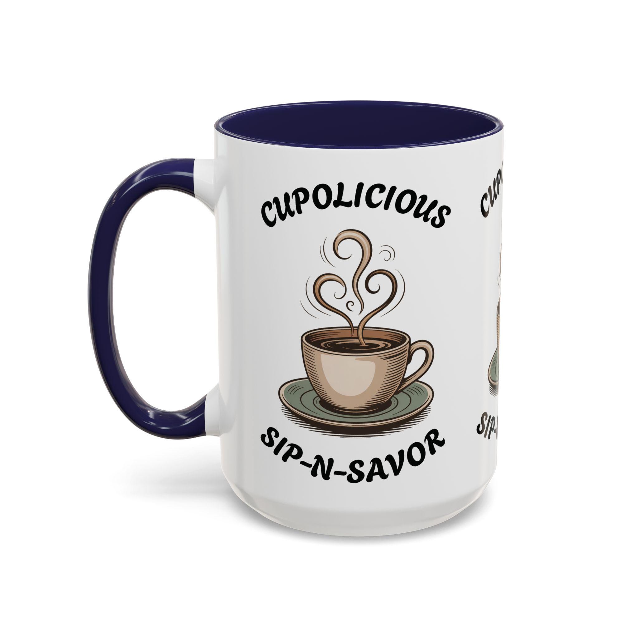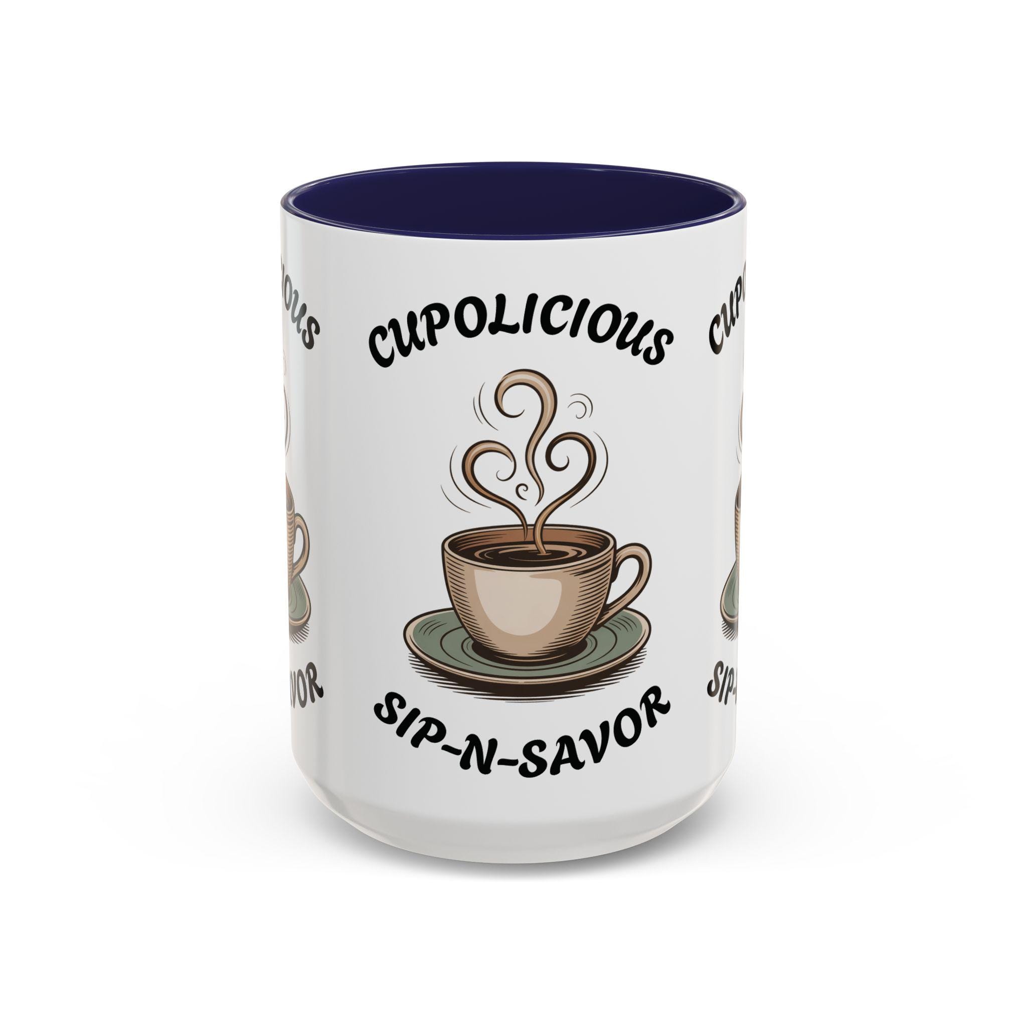 Indulge in the cozy vibes of this Cup-O-Licious Sip-N-Savor Accent Coffee or Tea Mug with a 15oz capacity and a vibrant red or navy blue interior. Whether it's a gift for a loved one or a little treat for yourself, this mug promises comfort with every sip. Perfect for those who enjoy a warm drink while relaxing at home or need a pick-me-up at the office. Ideal for birthdays, holidays, or just because.