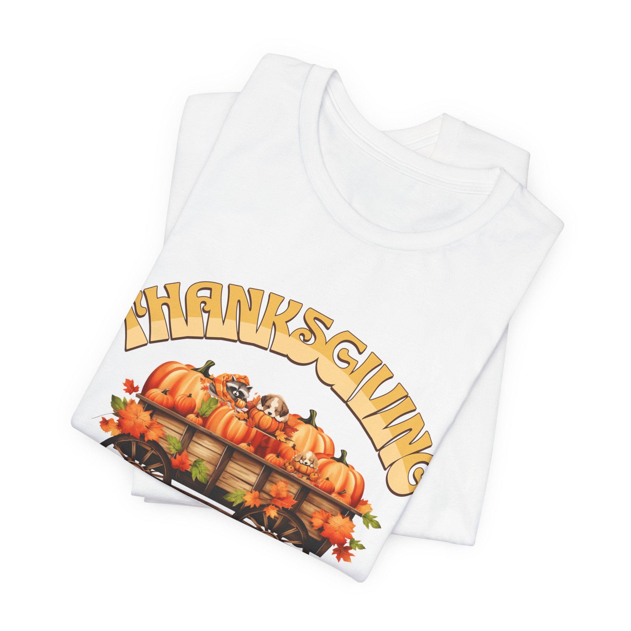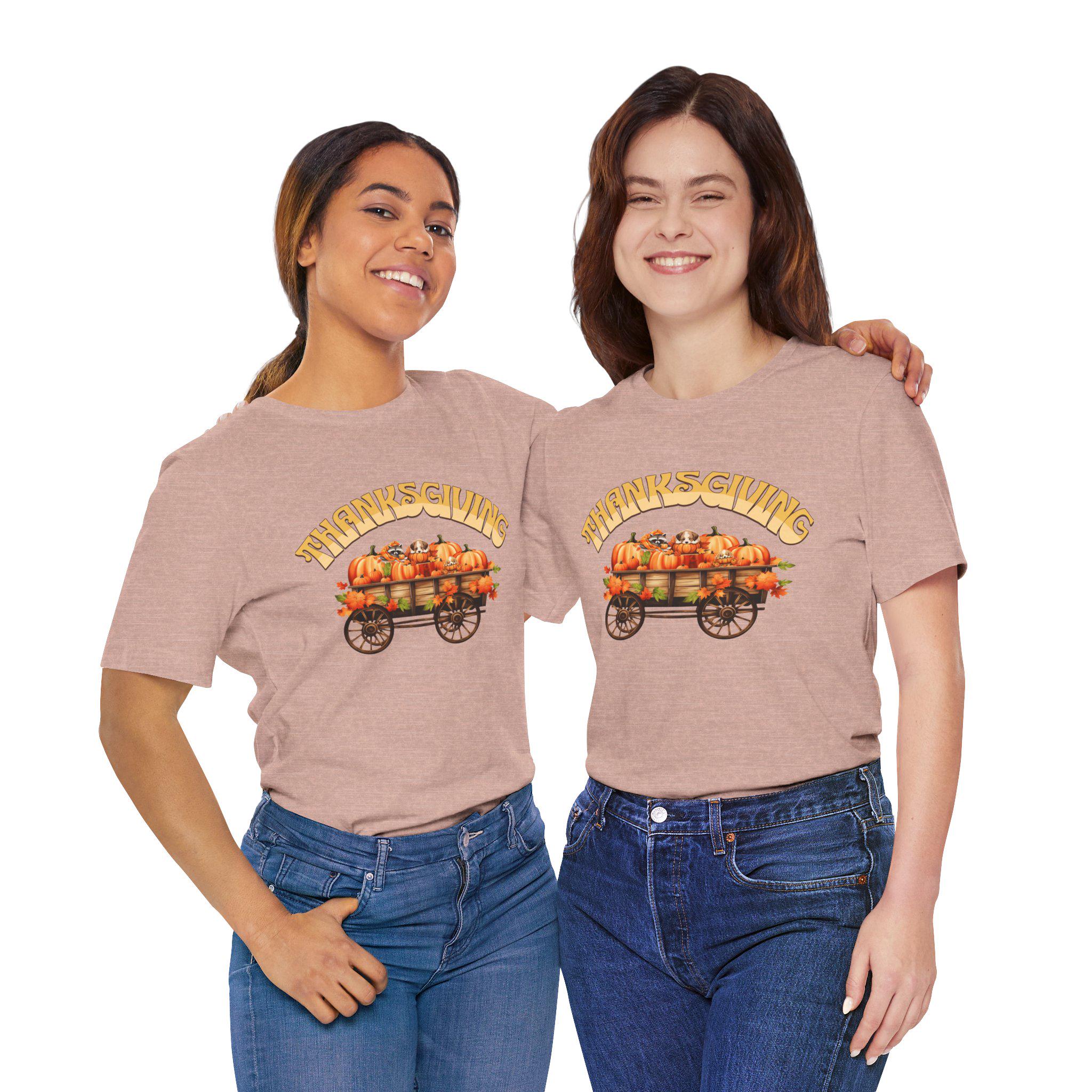 This Thanksgiving Pumpkin Wagon Tee embodies a cozy and festive vibe, perfect for autumn gatherings and celebrations. It is relevant to anyone looking to add a touch of seasonal flair to their wardrobe.