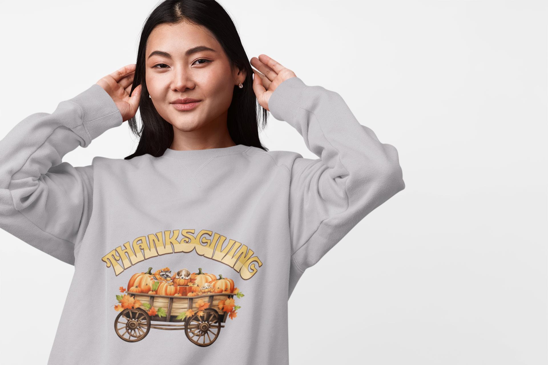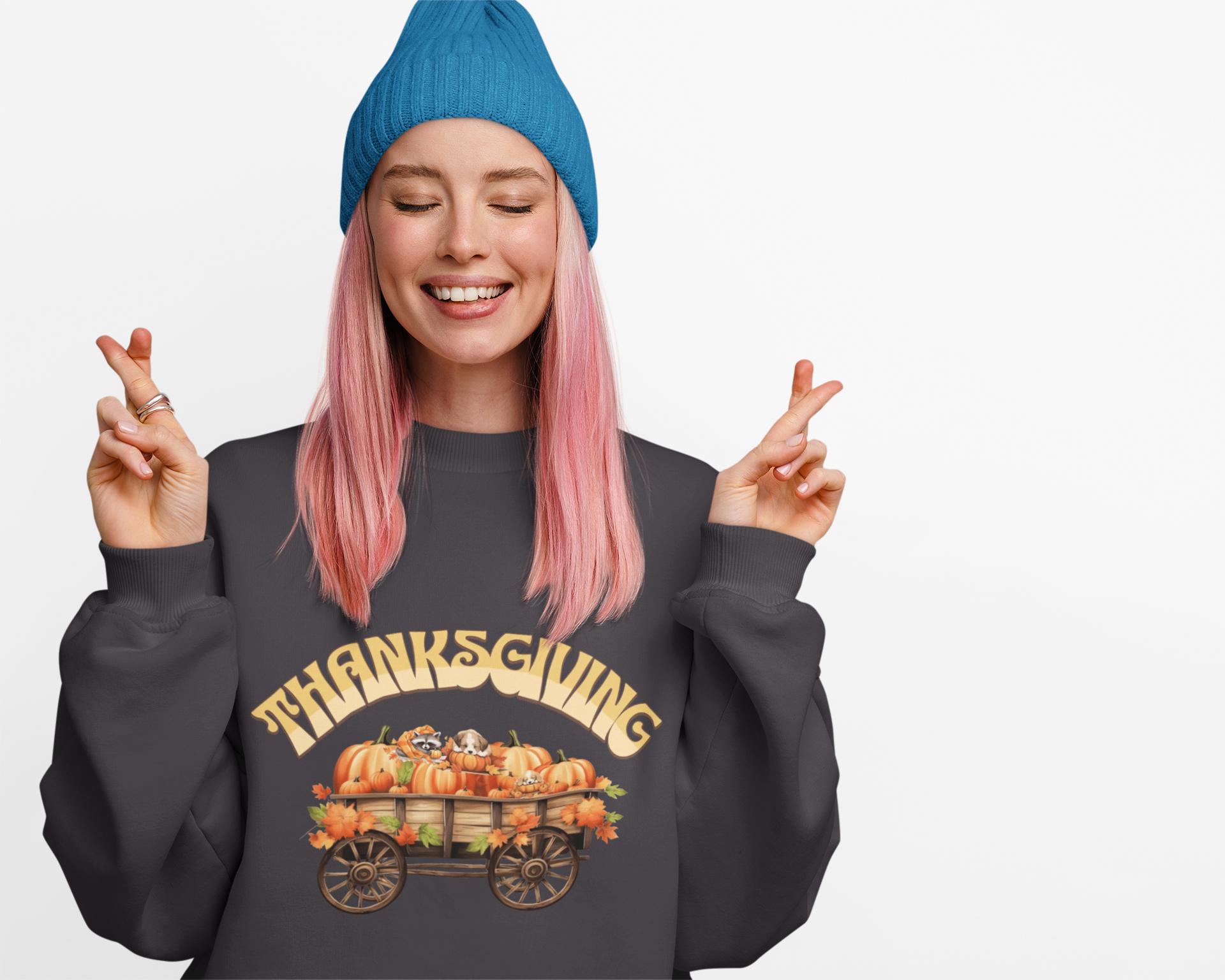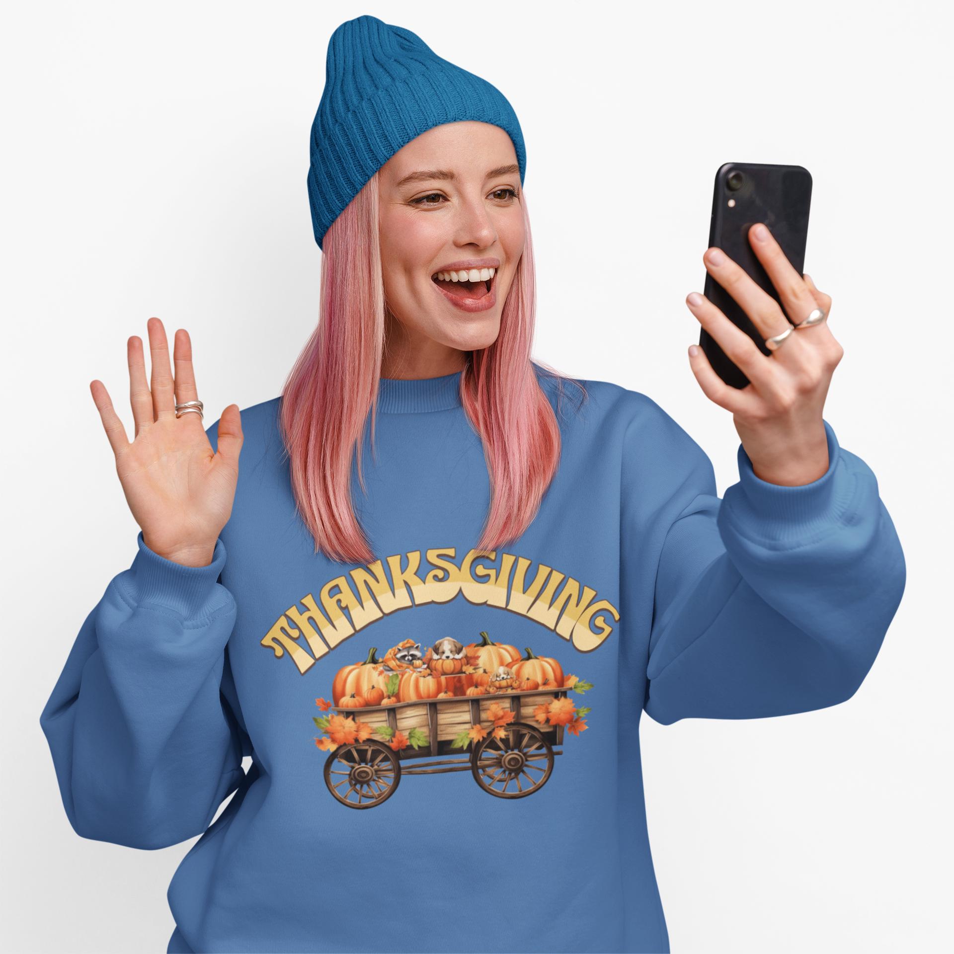 Thanksgiving Pumpkin Wagon Sweatshirt, Puppies and Raccoon, Fall Harvest