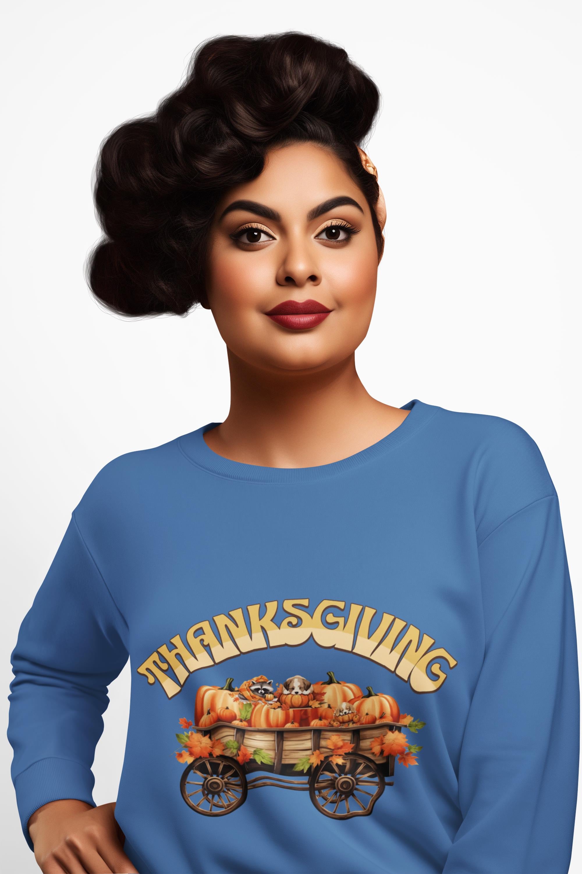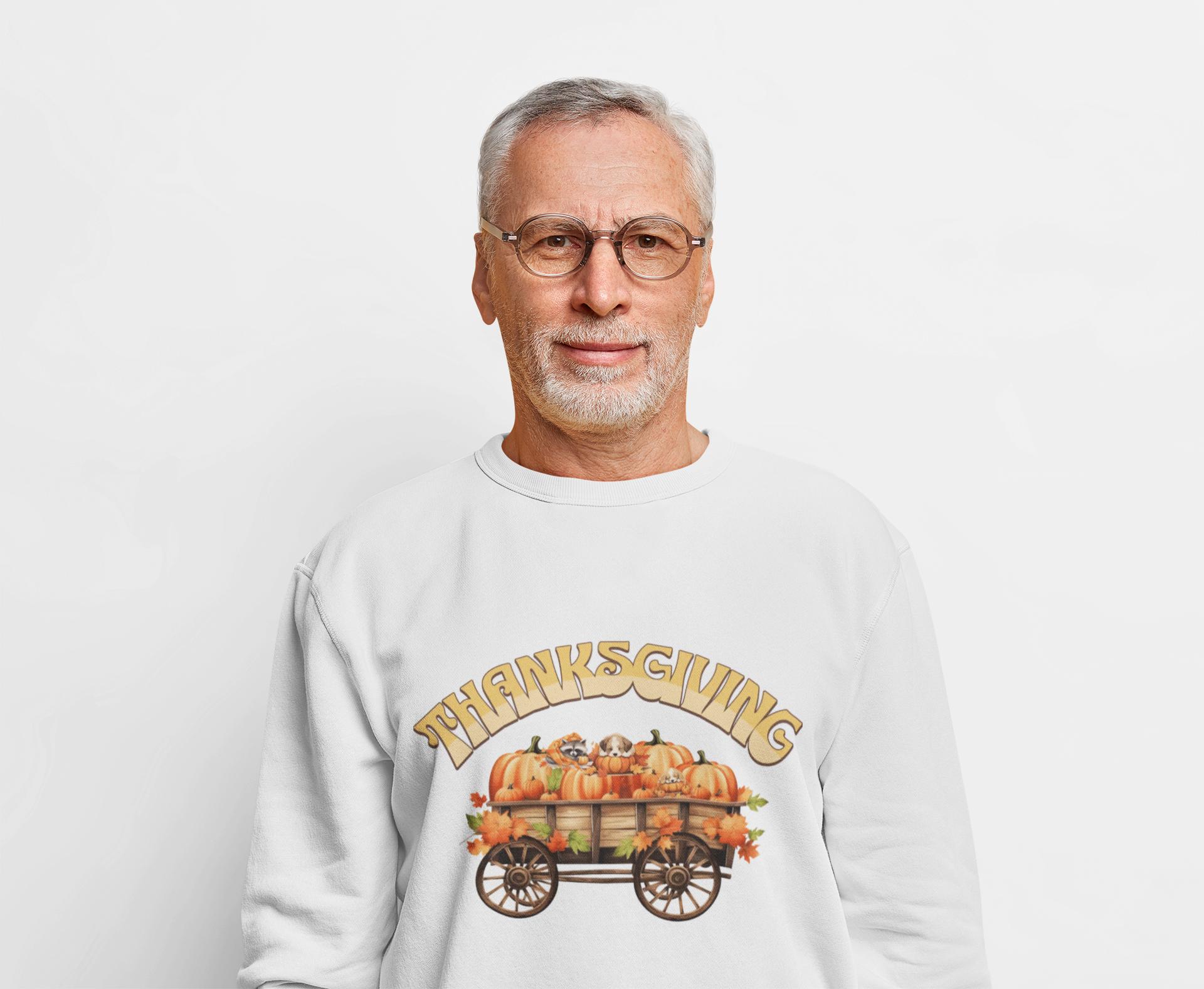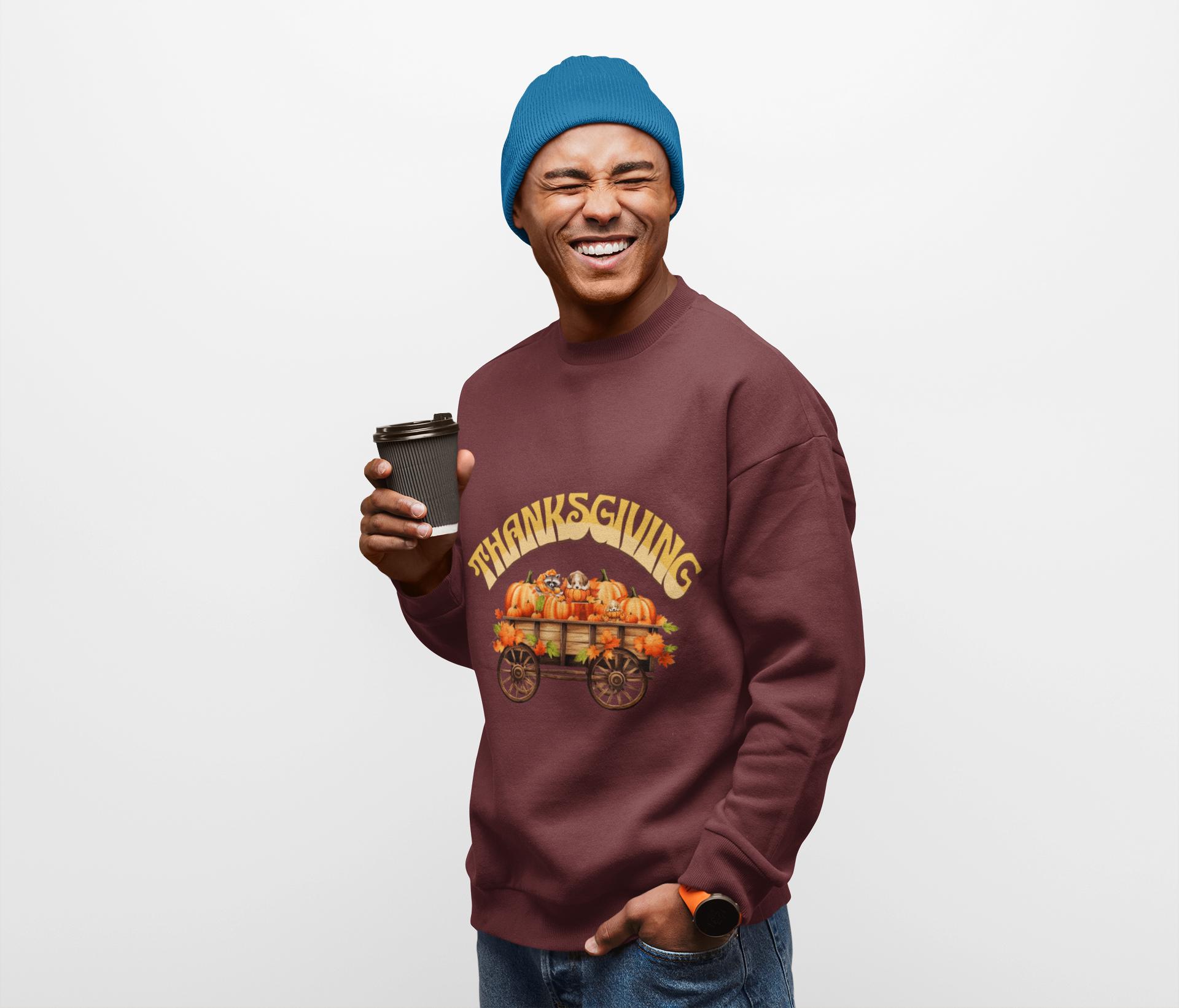 This Unisex Crew Neck Sweatshirt features an adorable Thanksgiving Pumpkin Wagon design with puppies and raccoon, perfect for the fall season. The medium-heavy fabric and regular fit provide comfort and warmth, making it ideal for casual wear during family gatherings or Thanksgiving celebrations. The fiber composition and double needle stitching ensure durability and long-lasting quality. This sweatshirt is perfect for animal lovers and anyone looking to add a festive touch to their wardrobe.
