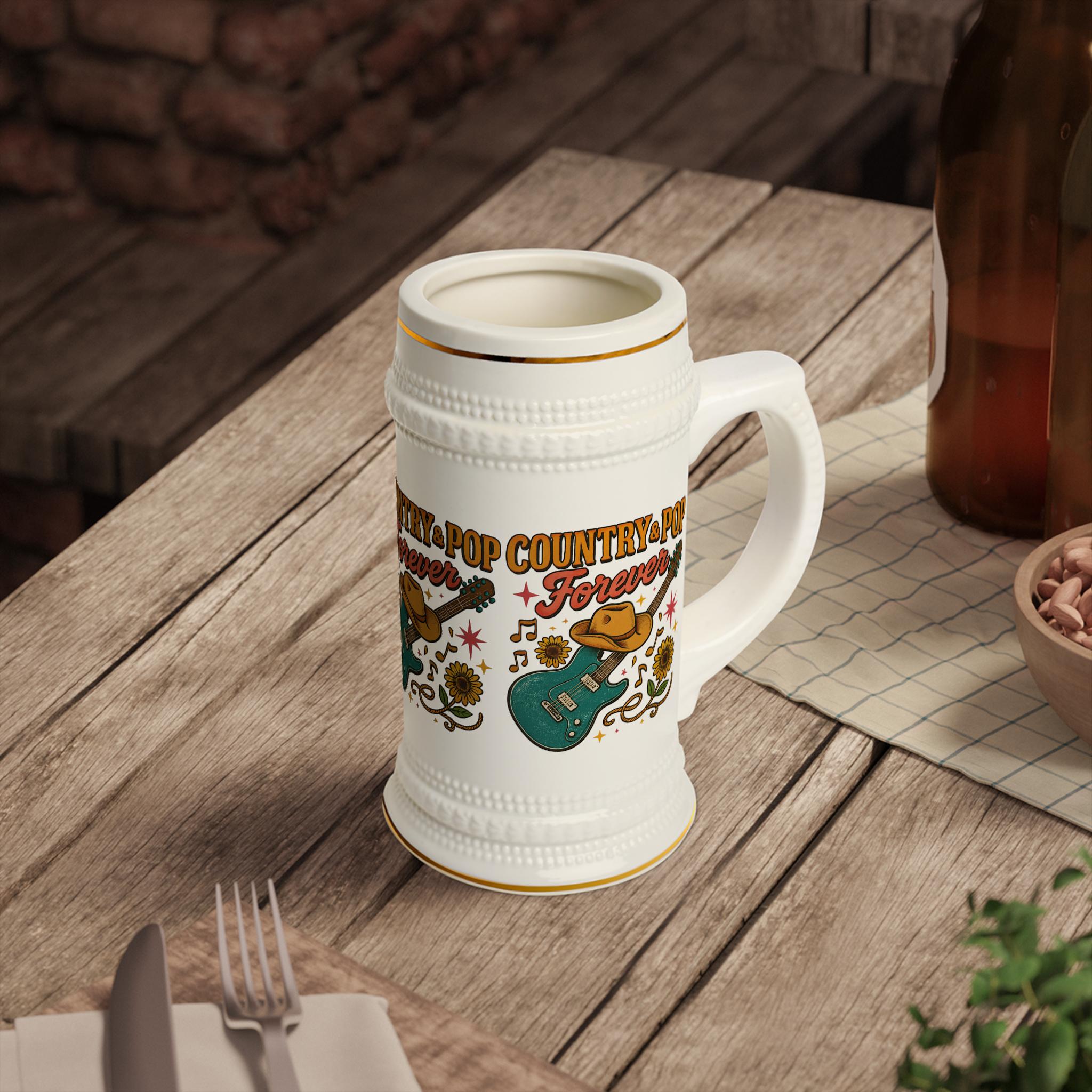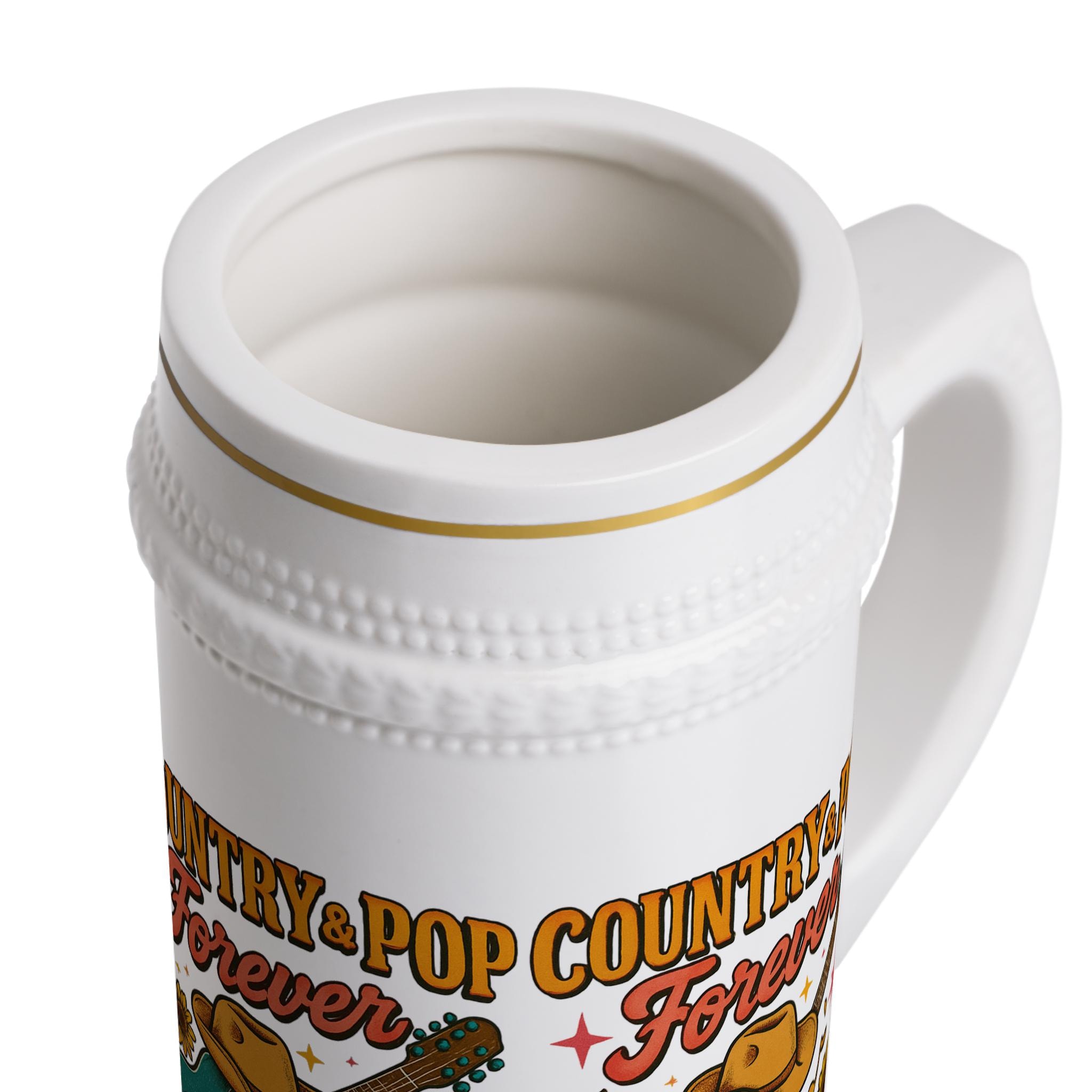 Raise a glass to long drives, late-night lyrics, and backyard singalongs. This 22oz beer stein radiates country-pop charm with its glossy white ceramic body and warm gold trim. It feels hefty and honest in your hands — the large handle lets you hold steady during a toast or a chorus. The vibrant print is locked in with a durable ORCA coating so the design stays bright through nights of use and many dishwasher cycles. Skip the microwave and keep it as your go-to mug for cold drinks, porch hangs, and playlist-driven evenings.