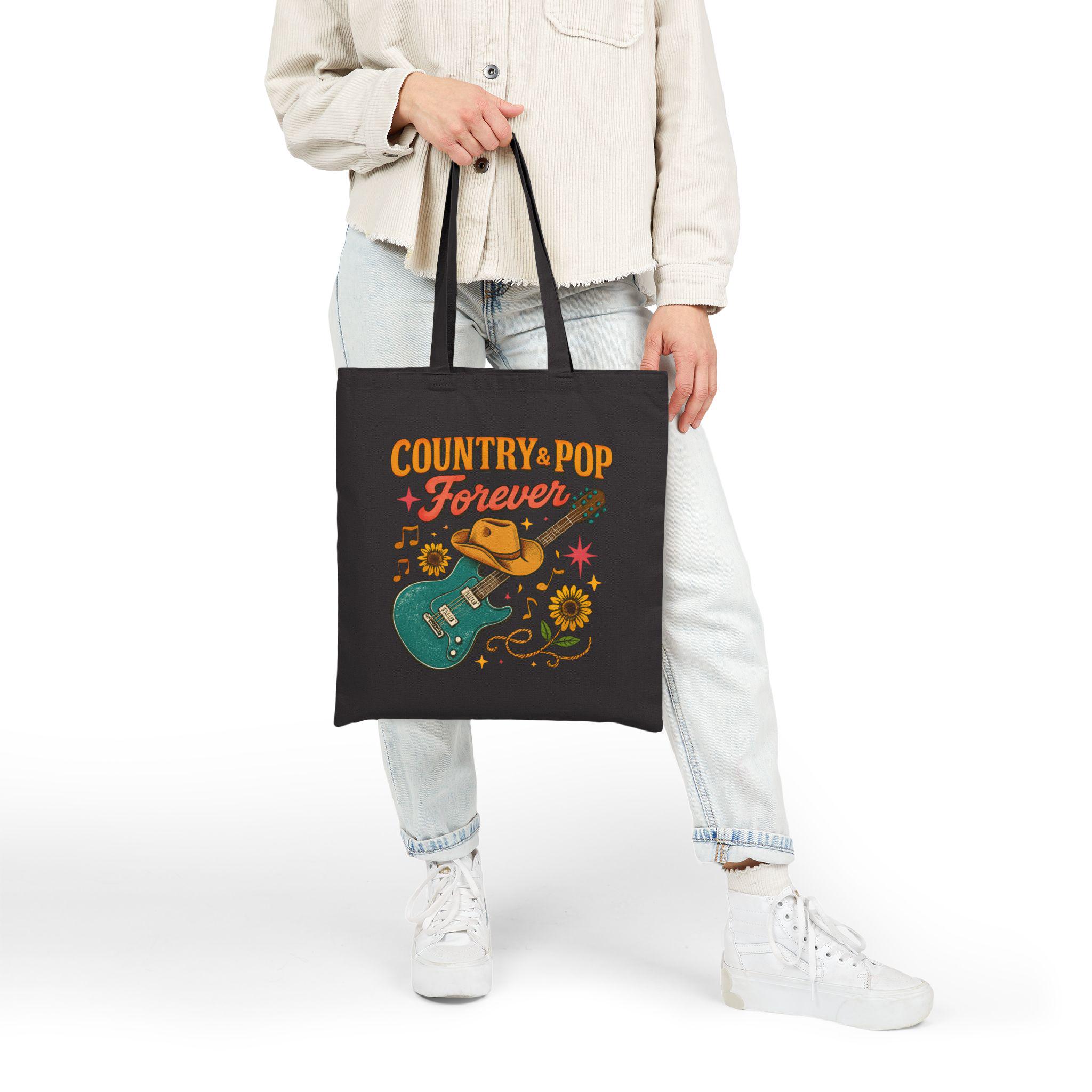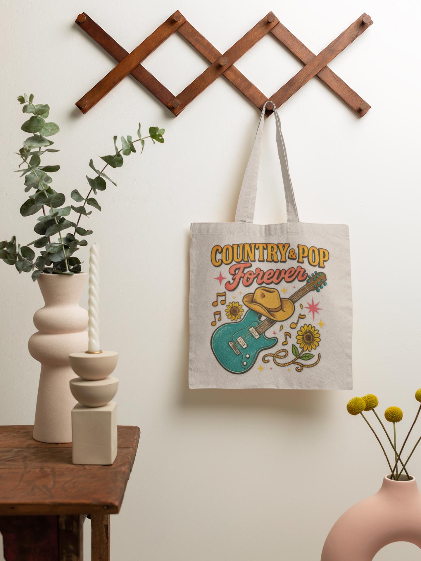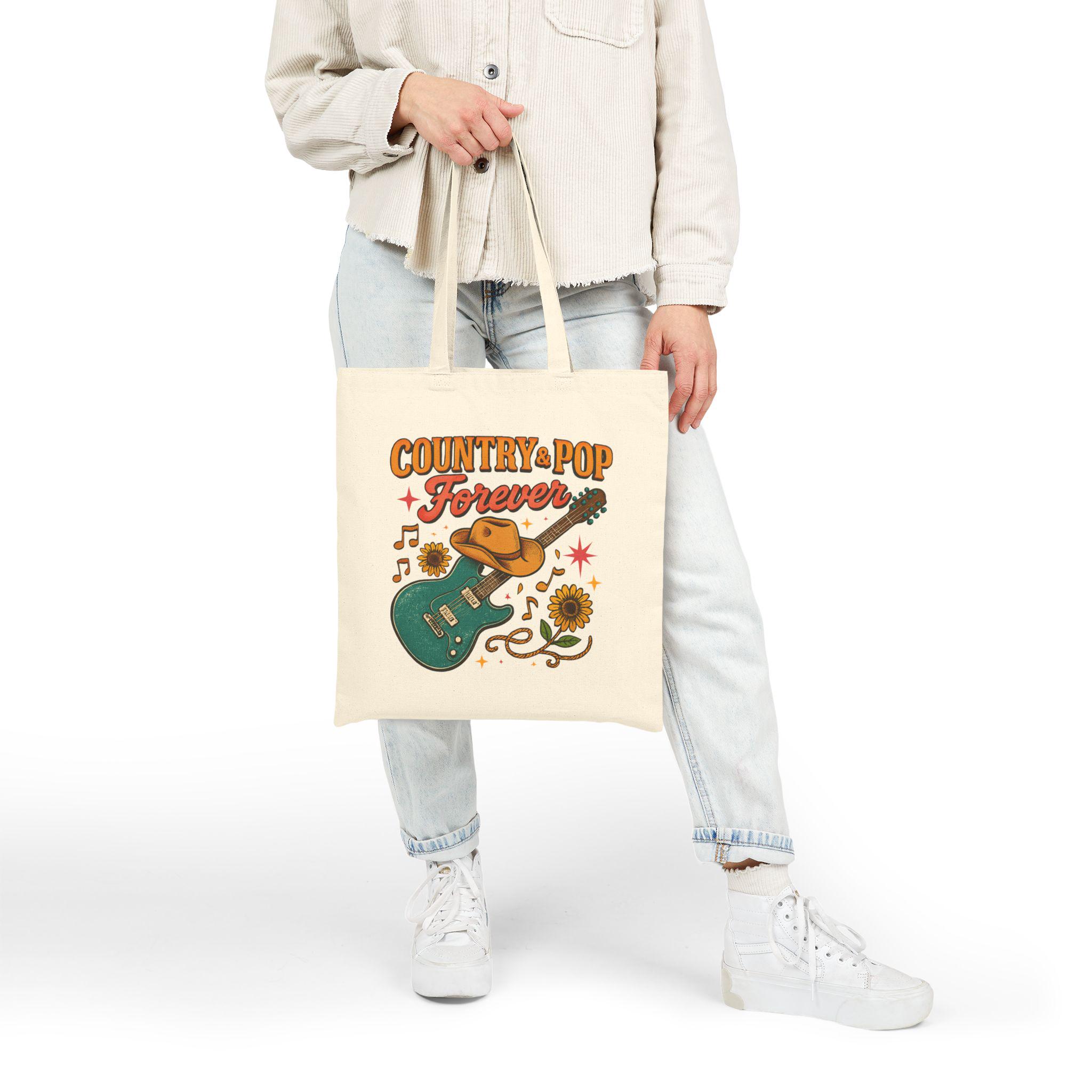 Warm sunlight pours through a late-summer field. A retro guitar silhouette rests against a burst of sunflowers — worn-in, acoustic, homegrown. This sturdy cotton canvas tote carries that mood with you: market mornings, open-air concerts, or a slow drive down a country road. The heavy weave feels substantial in hand and won’t sag under a stack of records or a crate of tomatoes. Handles sit comfortably on your shoulder; the flat-sided construction keeps the art visible and the goods organized. Bring a little country-pop nostalgia into everyday runs, picnics, and music nights — the kind of bag that ages into stories.