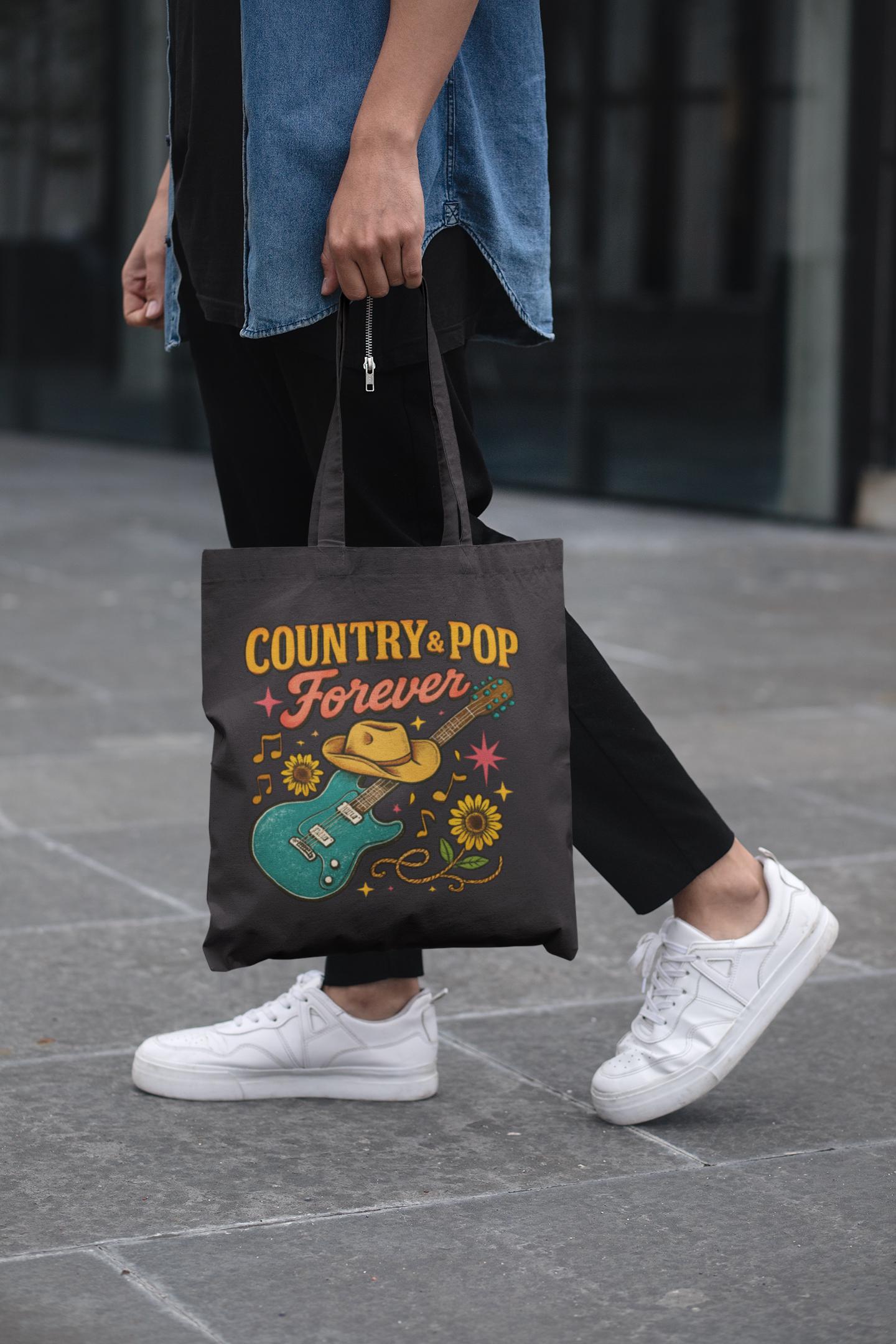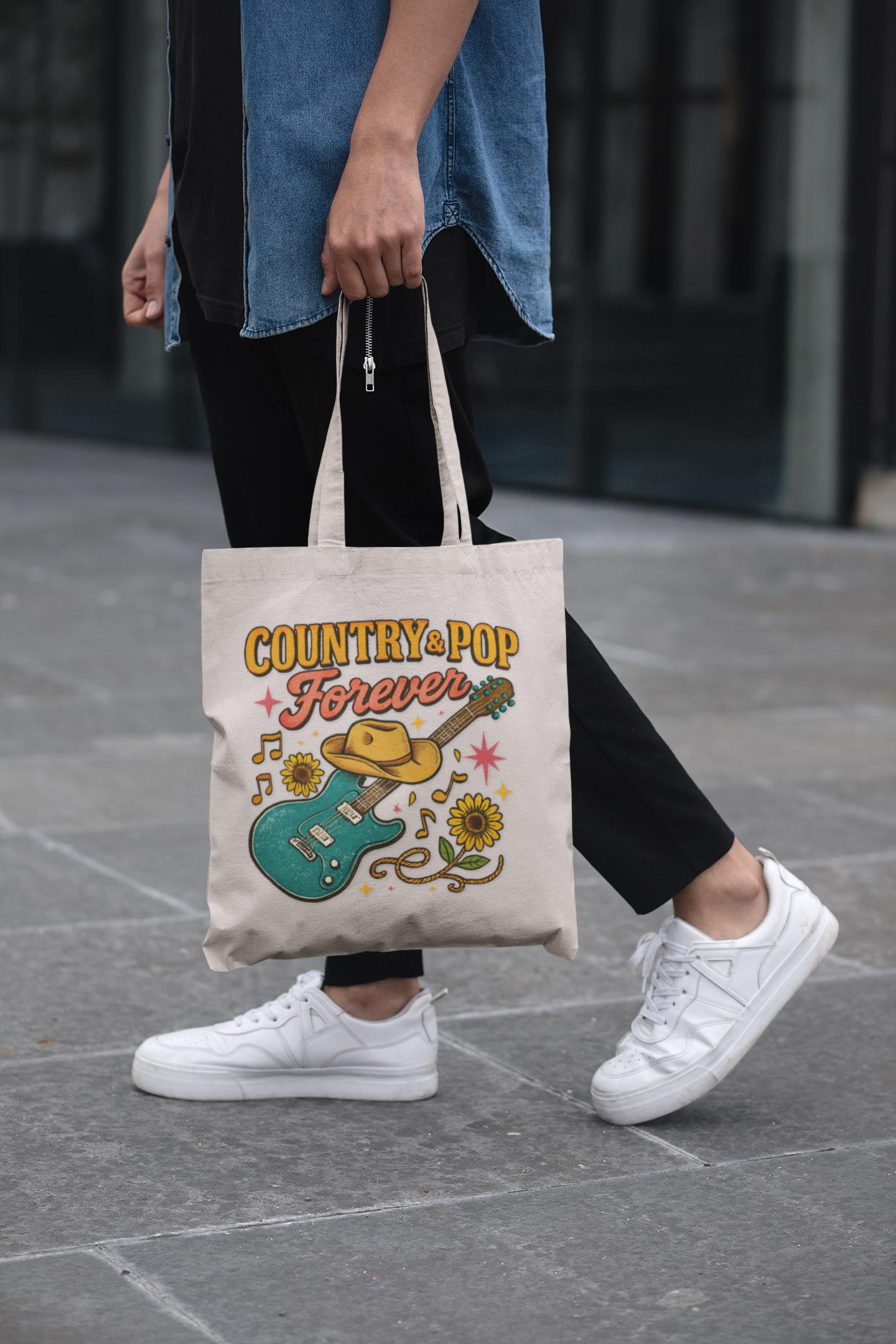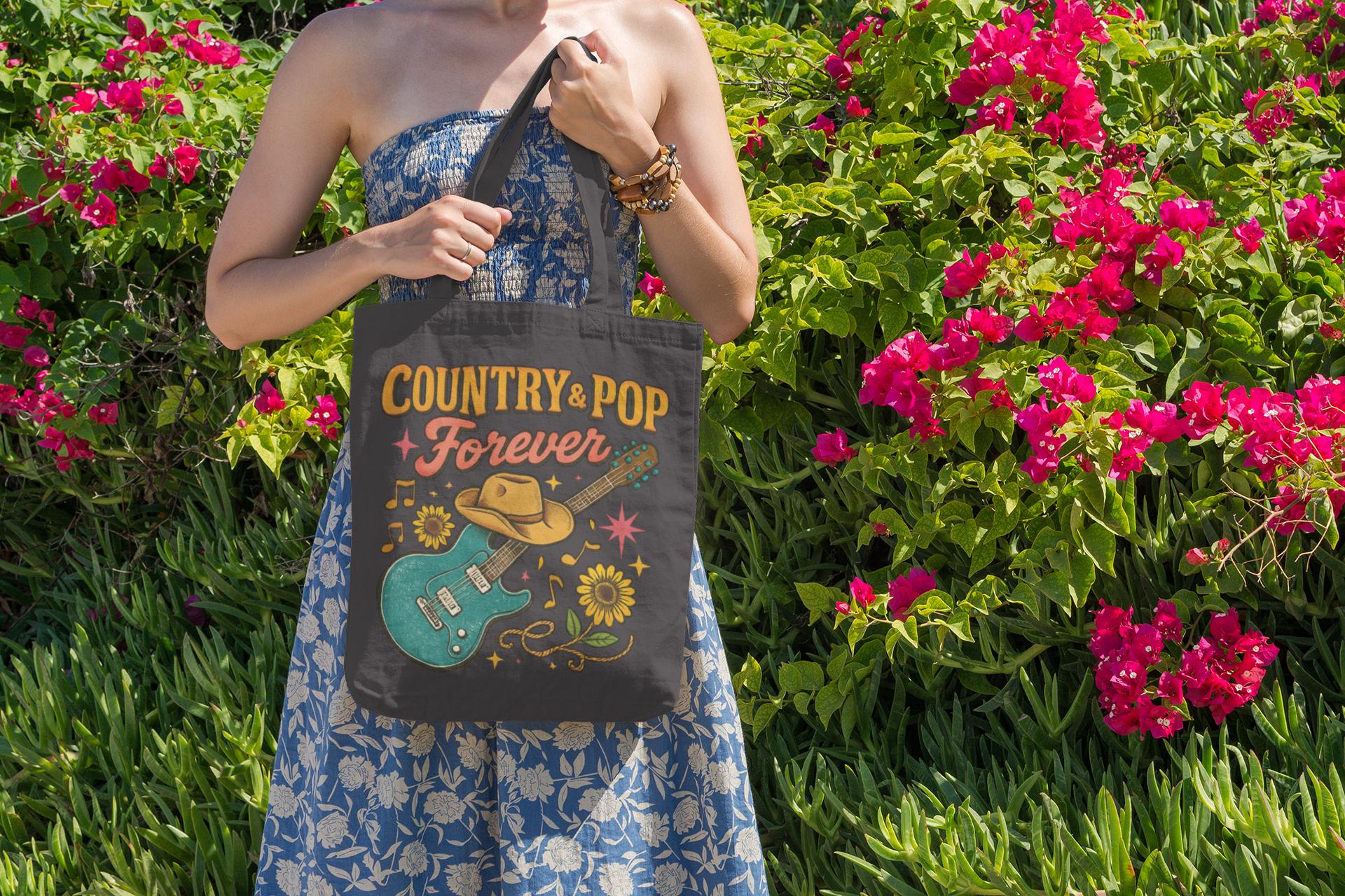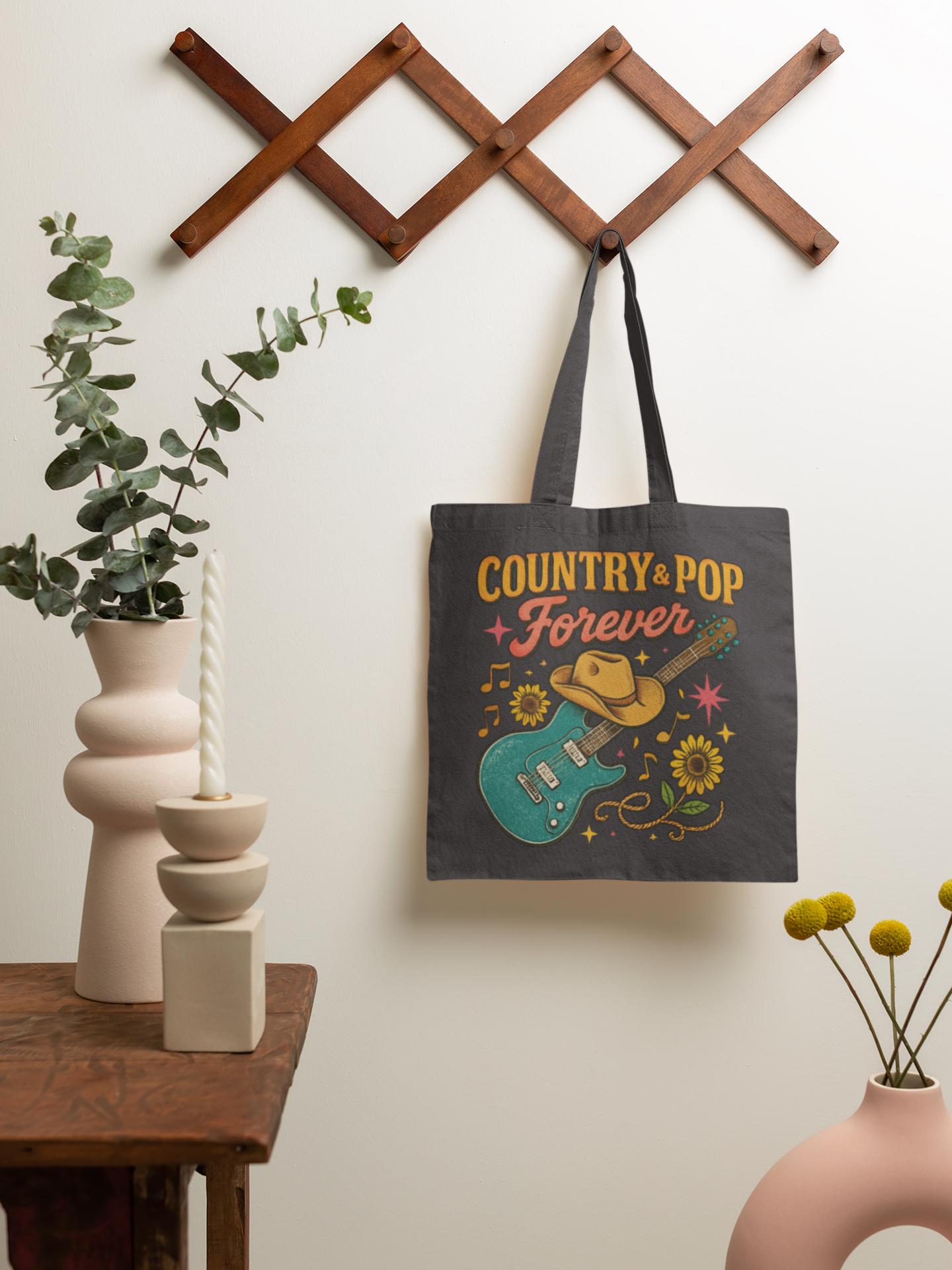 Warm sunlight pours through a late-summer field. A retro guitar silhouette rests against a burst of sunflowers — worn-in, acoustic, homegrown. This sturdy cotton canvas tote carries that mood with you: market mornings, open-air concerts, or a slow drive down a country road. The heavy weave feels substantial in hand and won’t sag under a stack of records or a crate of tomatoes. Handles sit comfortably on your shoulder; the flat-sided construction keeps the art visible and the goods organized. Bring a little country-pop nostalgia into everyday runs, picnics, and music nights — the kind of bag that ages into stories.