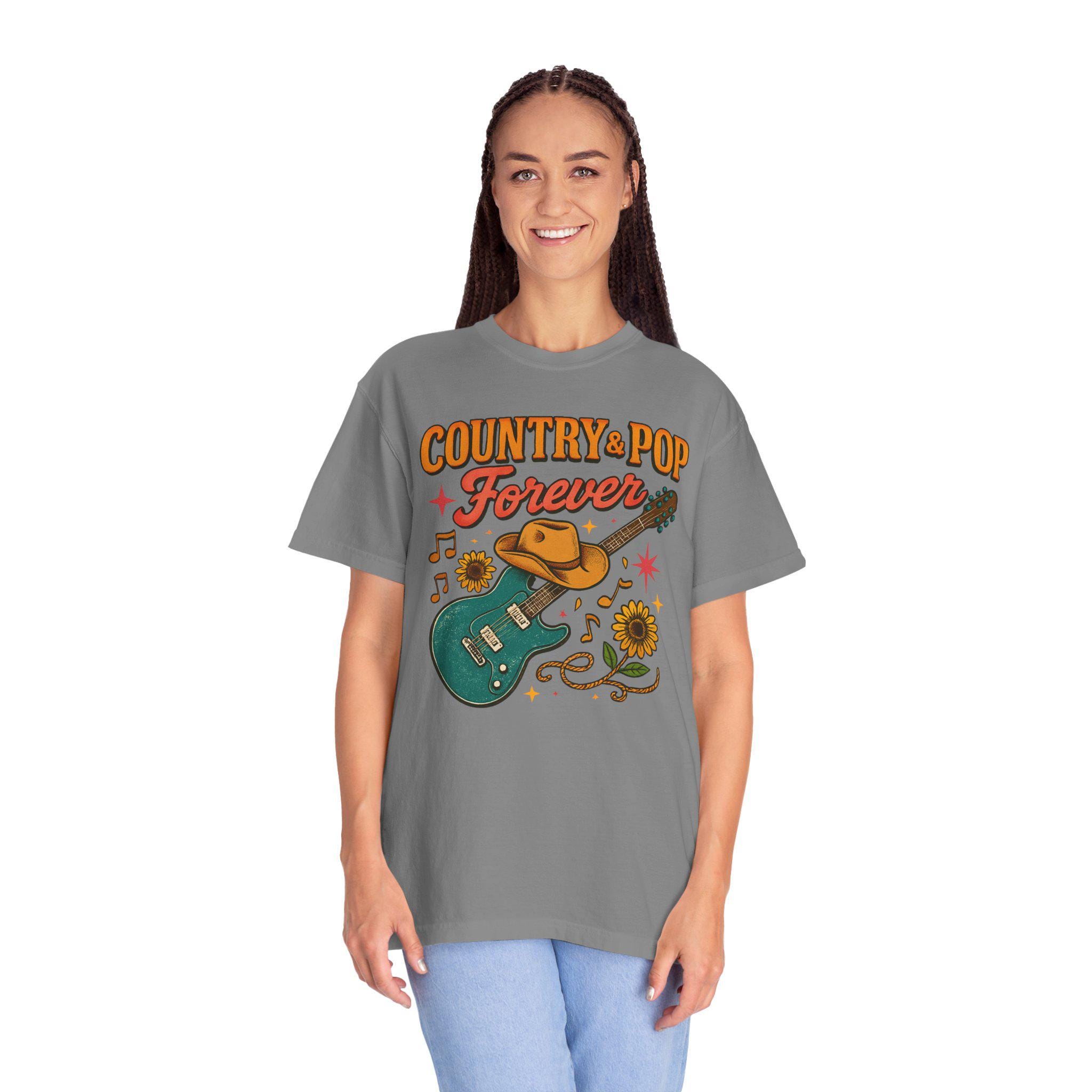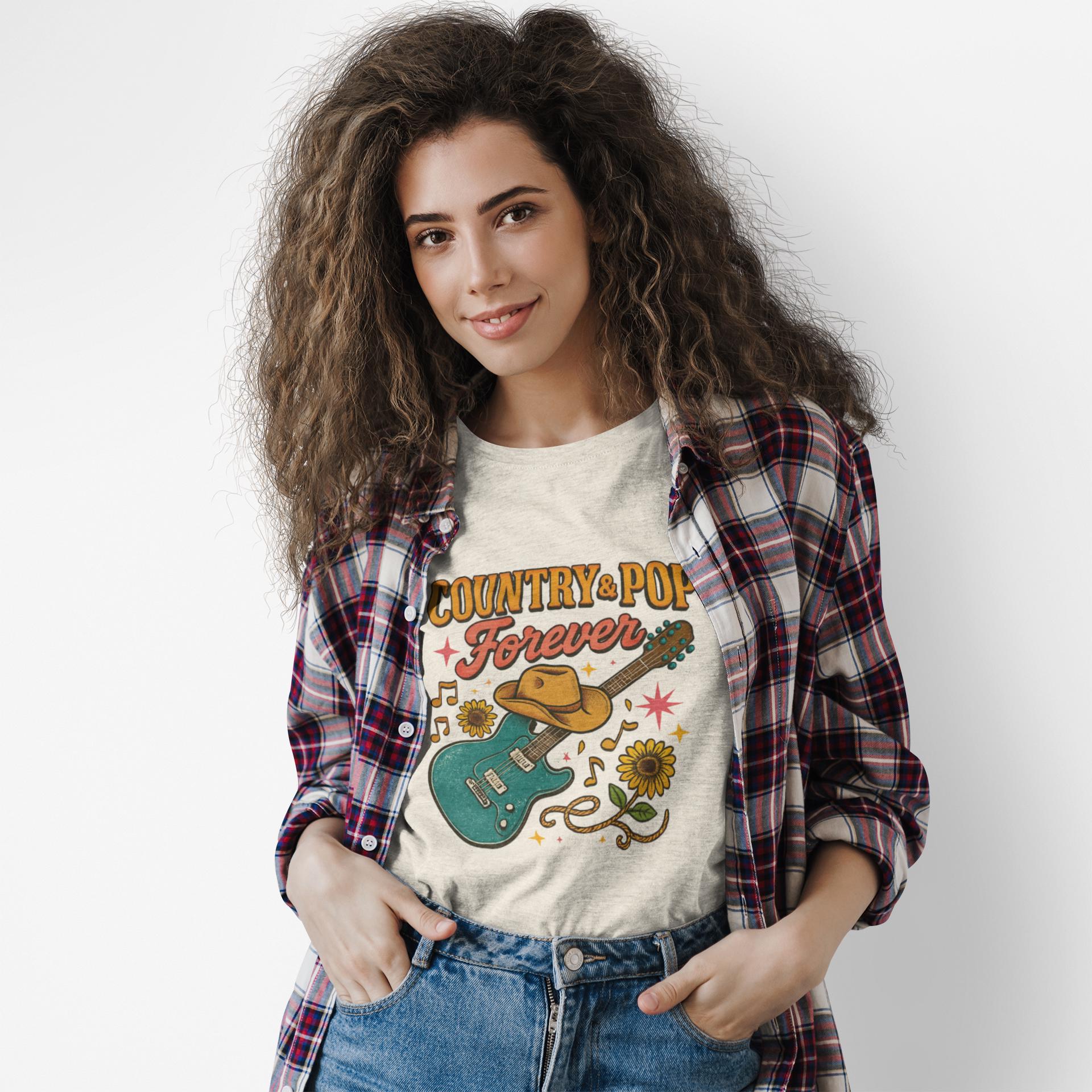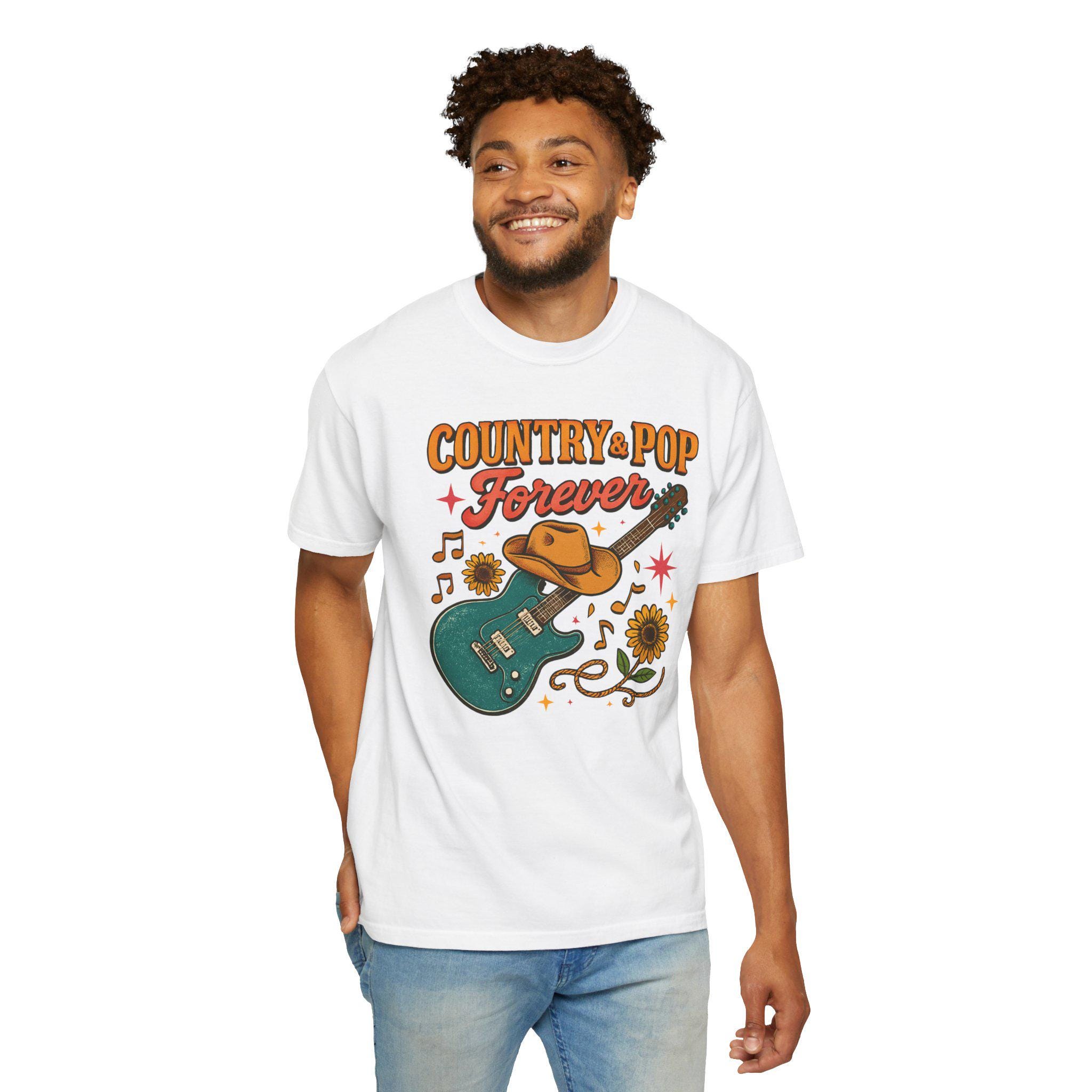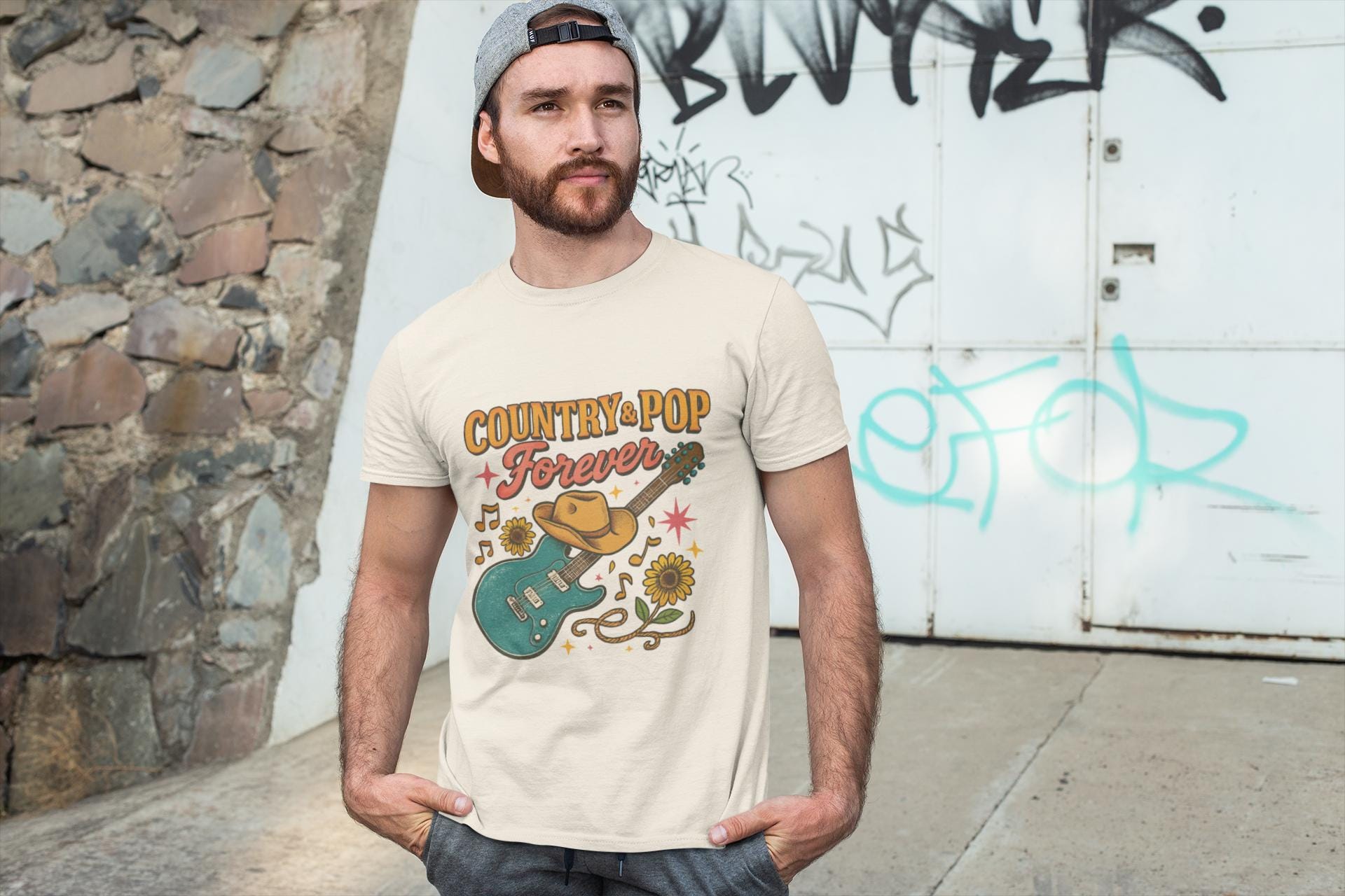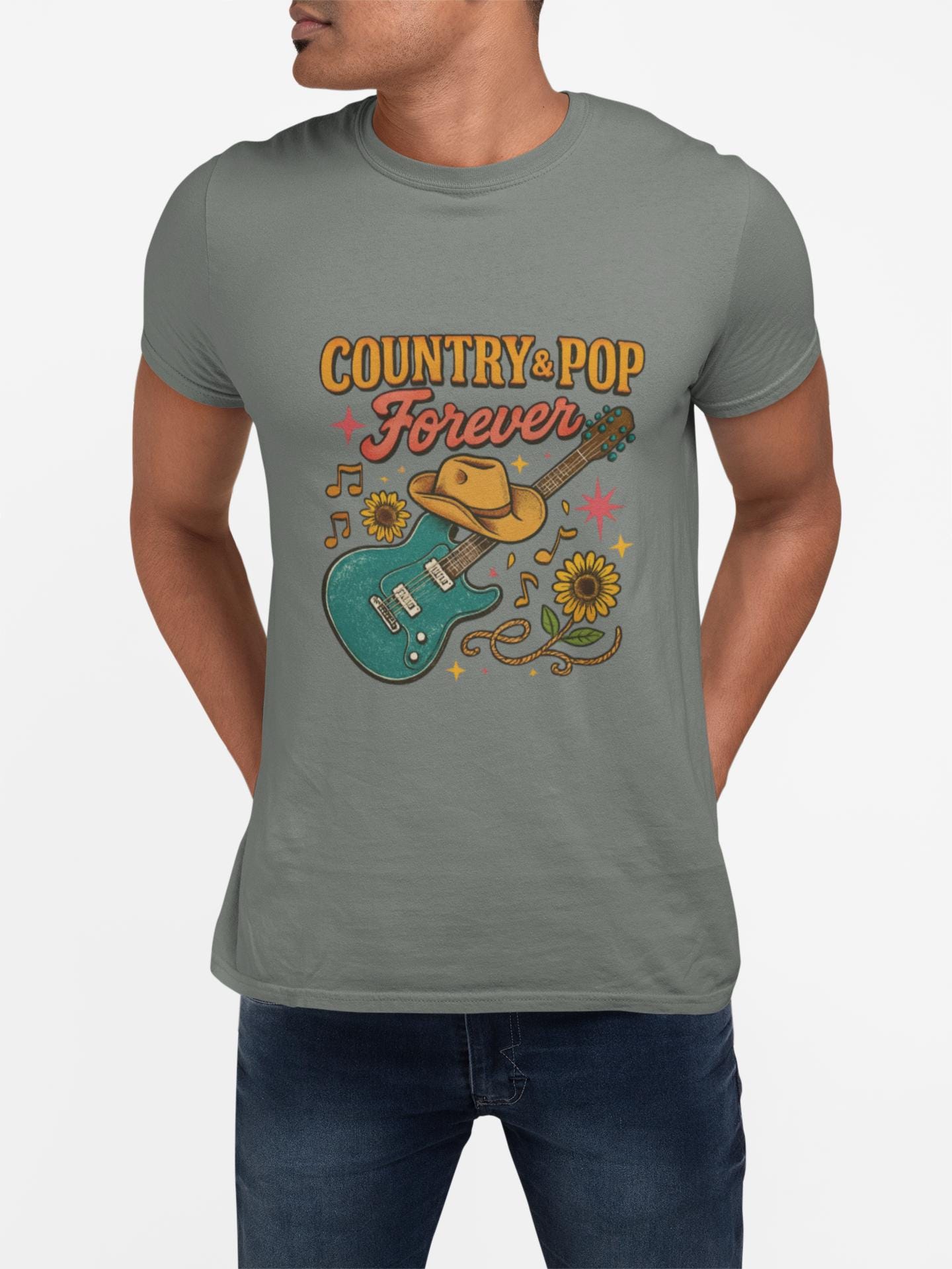 This lightweight-but-sturdy tee carries a retro country energy—worn-in sun-bleached color, a vintage guitar silhouette, a tilted cowboy hat, and a bright sunflower that feels like a roadside memory. It sits loose and easy on the body, the garment-dyed fabric softening with every wash so the print looks lived-in, not new. Slip it on for dusk drives with the windows down, local shows under string lights, or mornings wandering a farmers’ market. The design reads like a small story: music, wide skies, and the patient optimism of late summer. For people who collect nights by the bonfire and playlists that smell like hay and gasoline, this tee slides into that rotation and becomes one of those reliably comfortable pieces you reach for first.