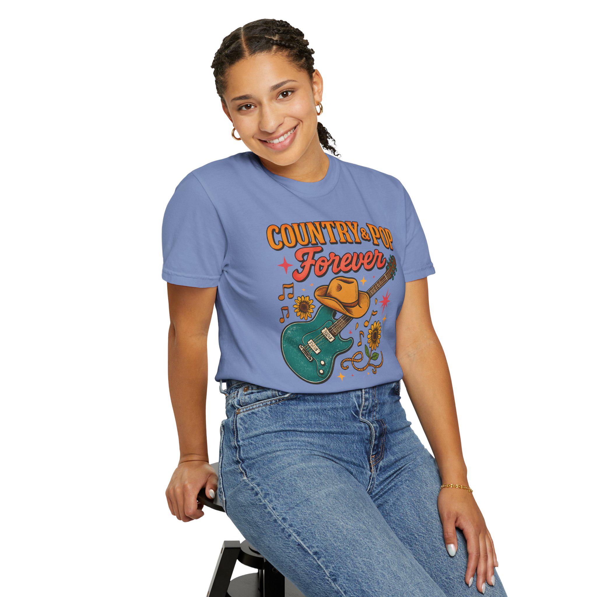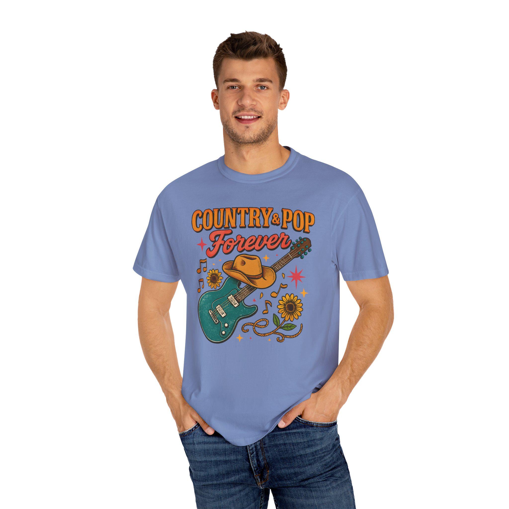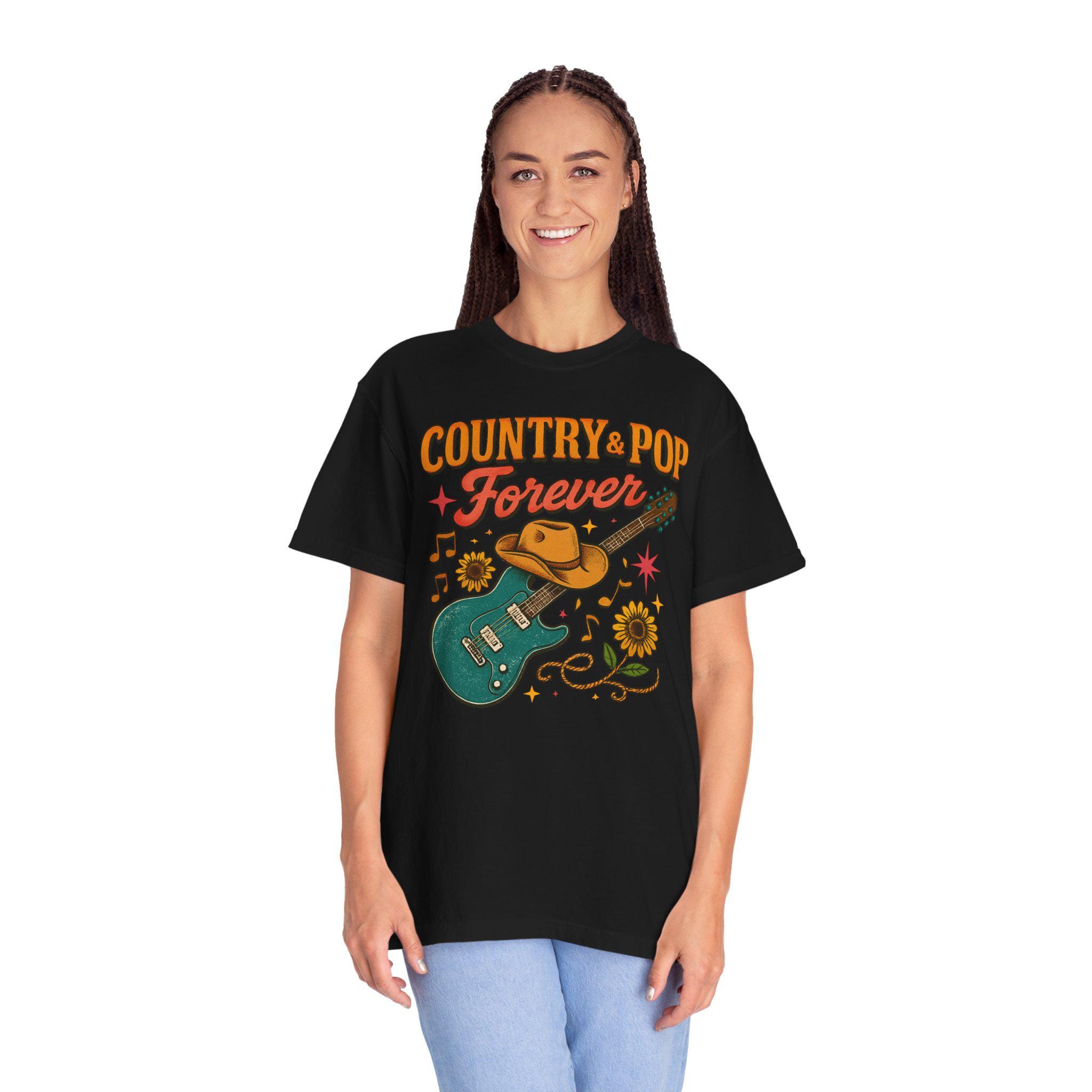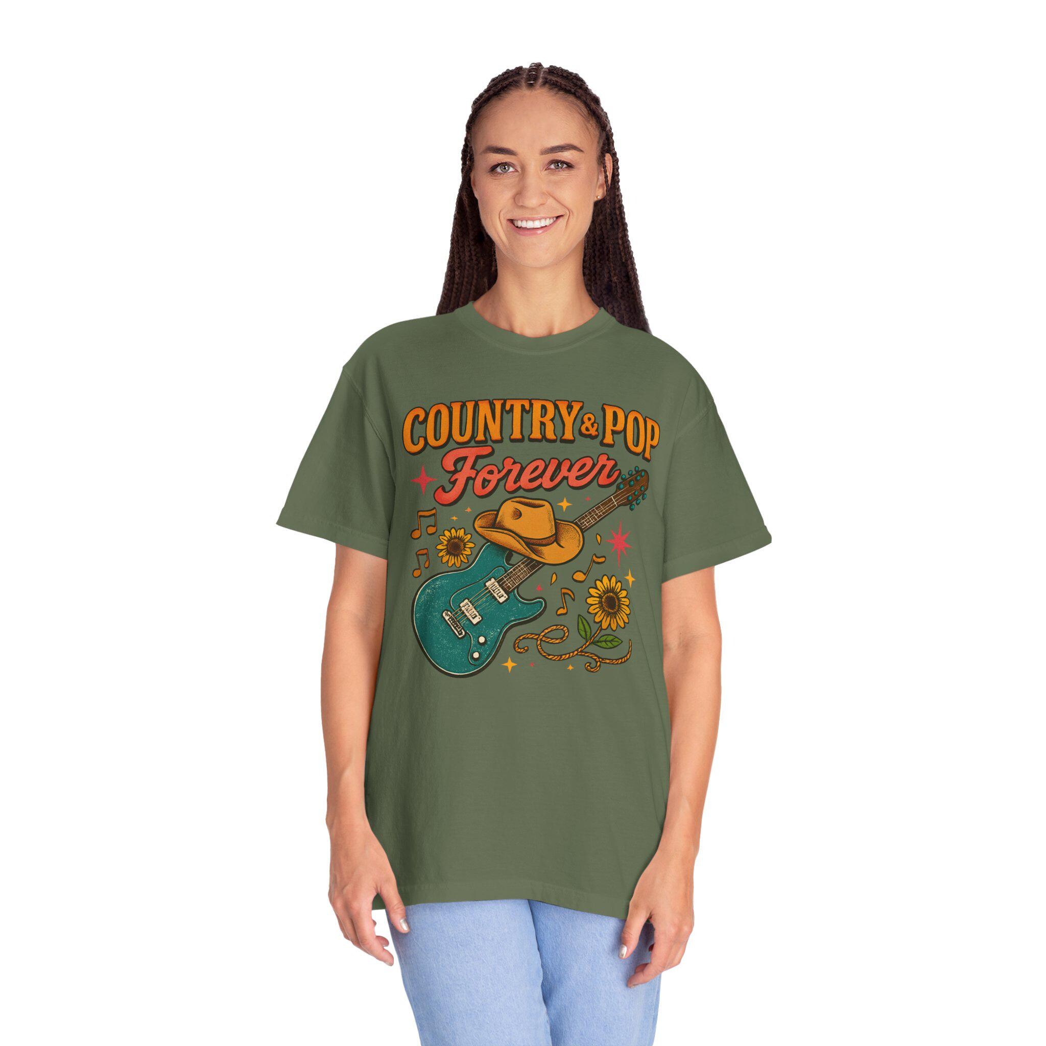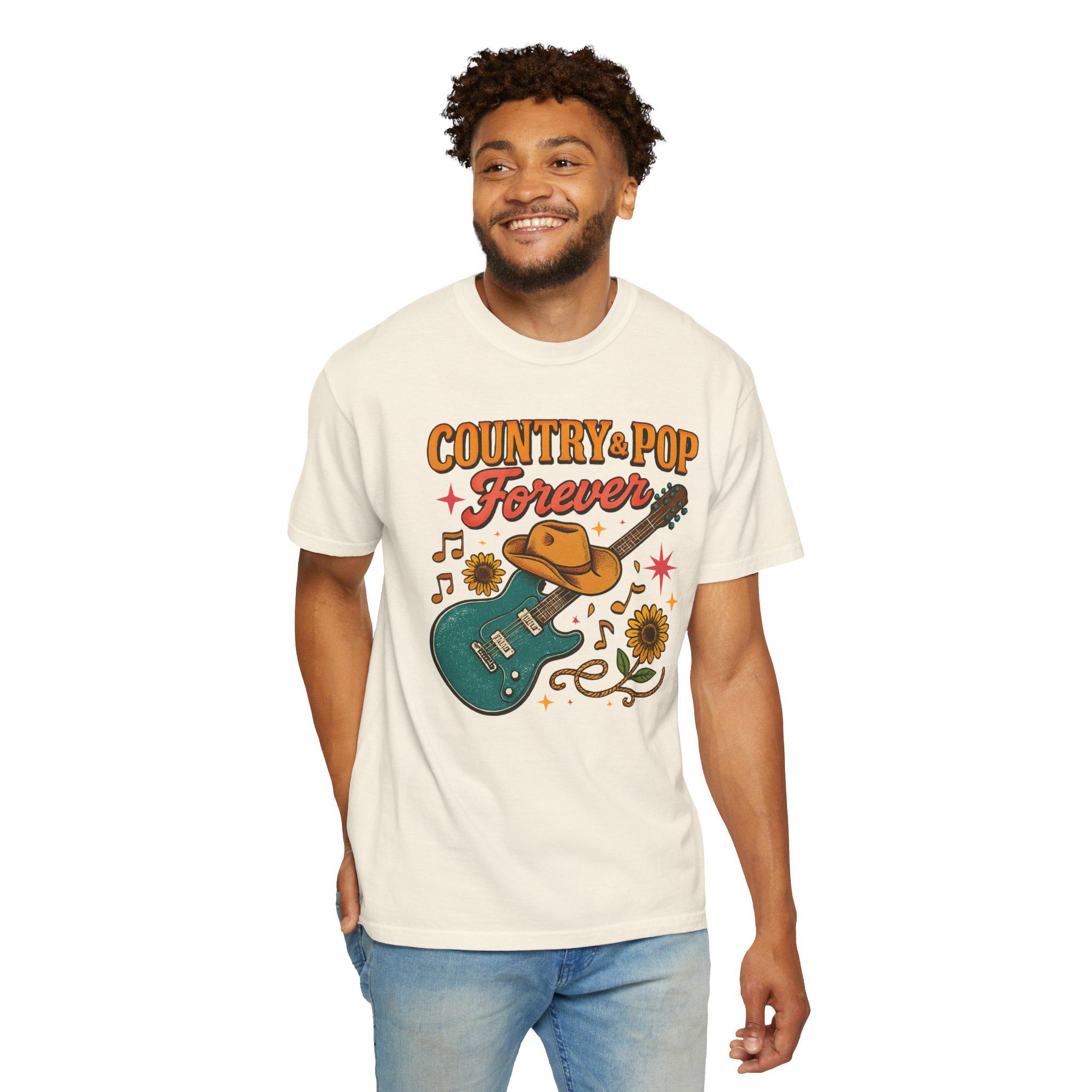 This relaxed-fit garment-dyed tee carries a warm, lived-in feel and a playful heart. The front art — a teal electric guitar draped with a worn cowboy hat, sunflowers, and fluttering music notes beneath the phrase “Country + Pop Forever” — evokes backyard shows, late-summer drives, and the blend of twang and catchy hooks that soundtrack small-town nights. The fabric softens with every wash, the tubular knit keeps a clean silhouette, and the medium-weight cotton holds the print while staying comfortable year-round. Wear it to outdoor jams, record-store runs, or while strumming on the porch; it sits easily in the rotation of anyone who loves the meeting point of country warmth and pop melody.