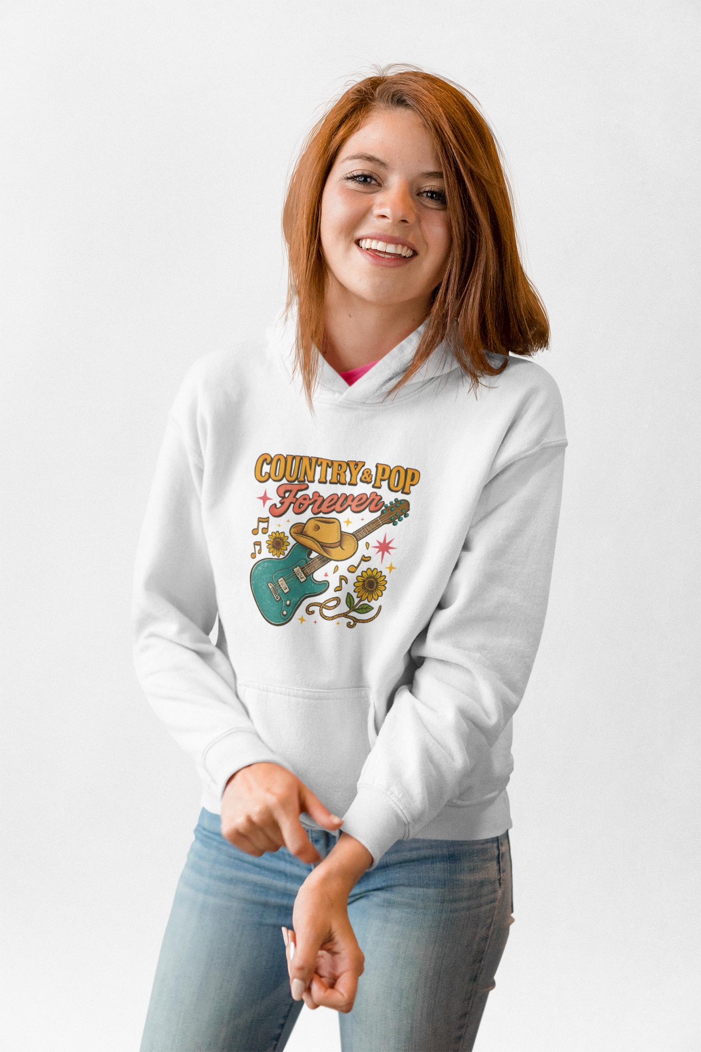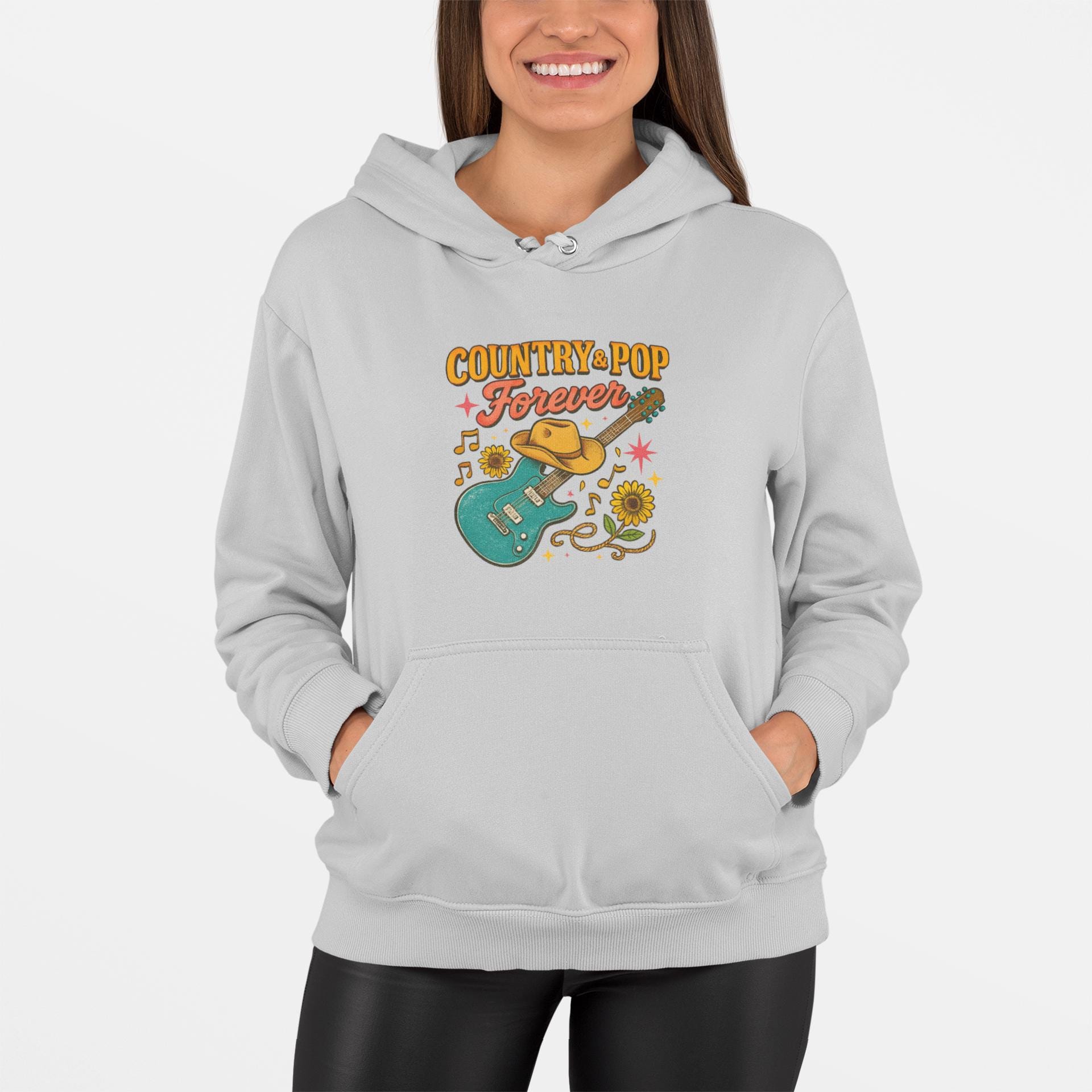 Country and Pop Folk Forever Guitar-Sunflower Hoodie - Graphic Sweatshirt that exudes a bohemian vibe, perfect for music lovers and nature enthusiasts. This warm and cozy hoodie features a kangaroo pouch pocket, adjustable hood, and is made from a strong, smooth fabric blend. Ideal for adults who enjoy casual and laid-back style, suitable for music festivals, concerts, and outdoor gatherings.