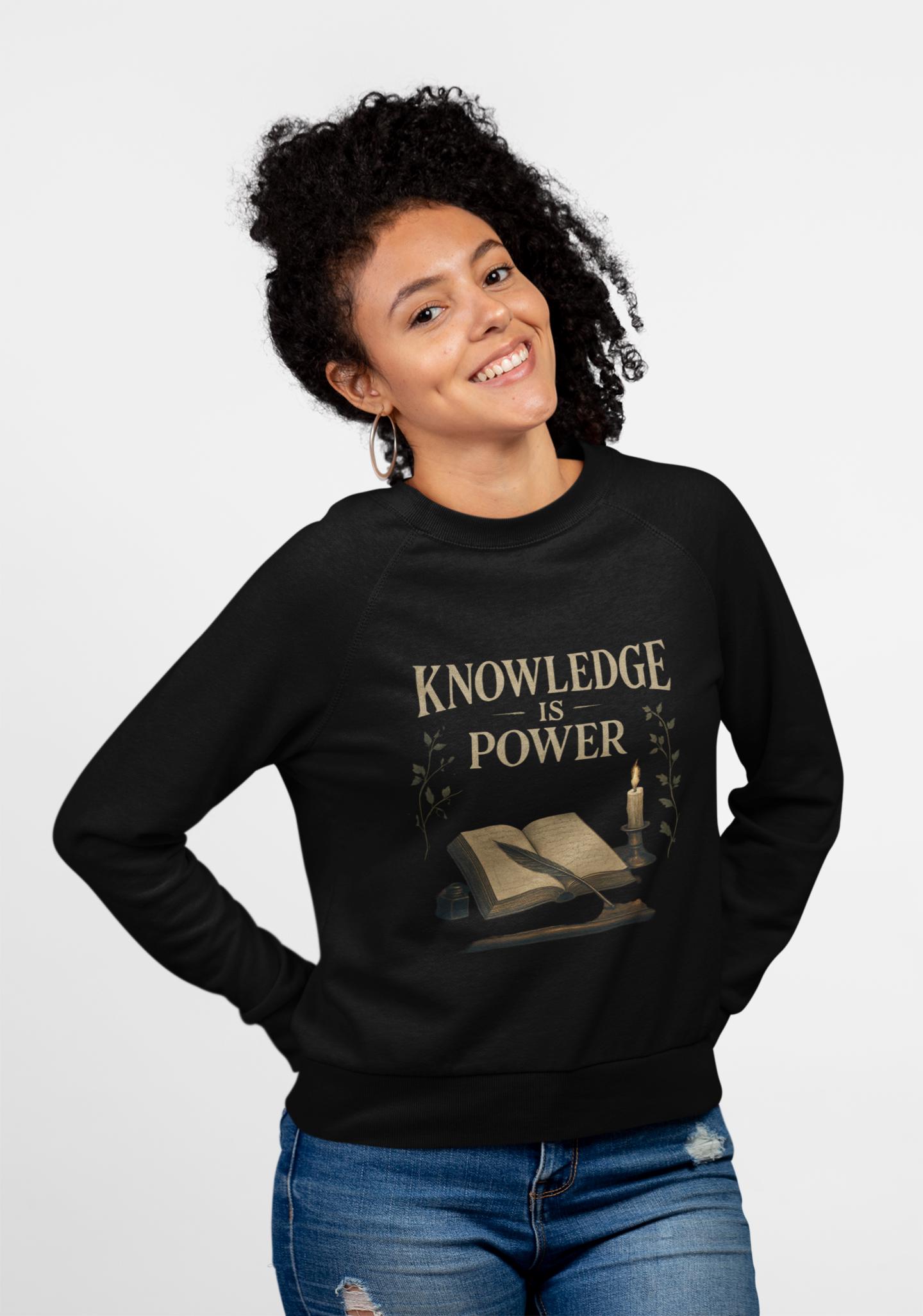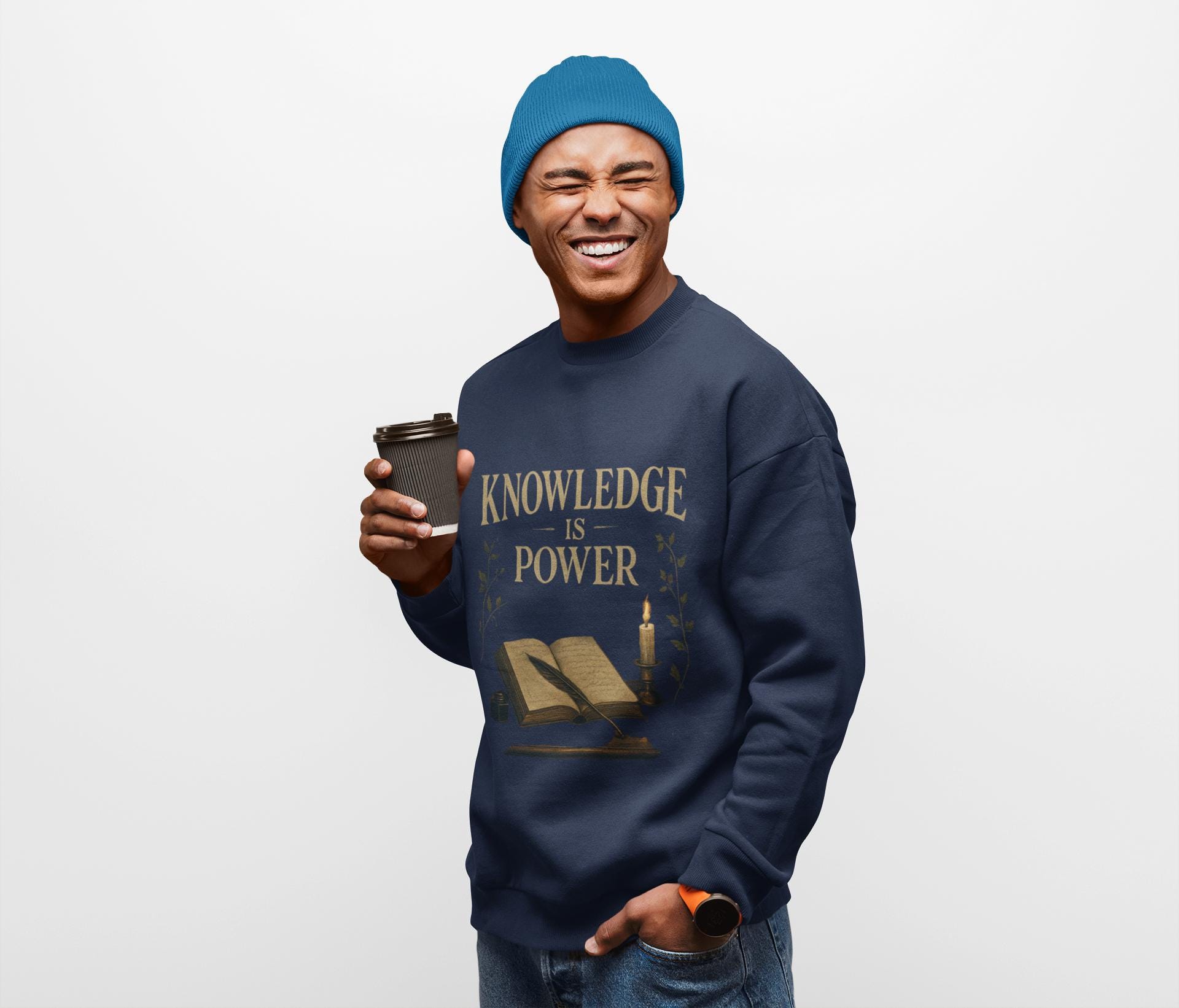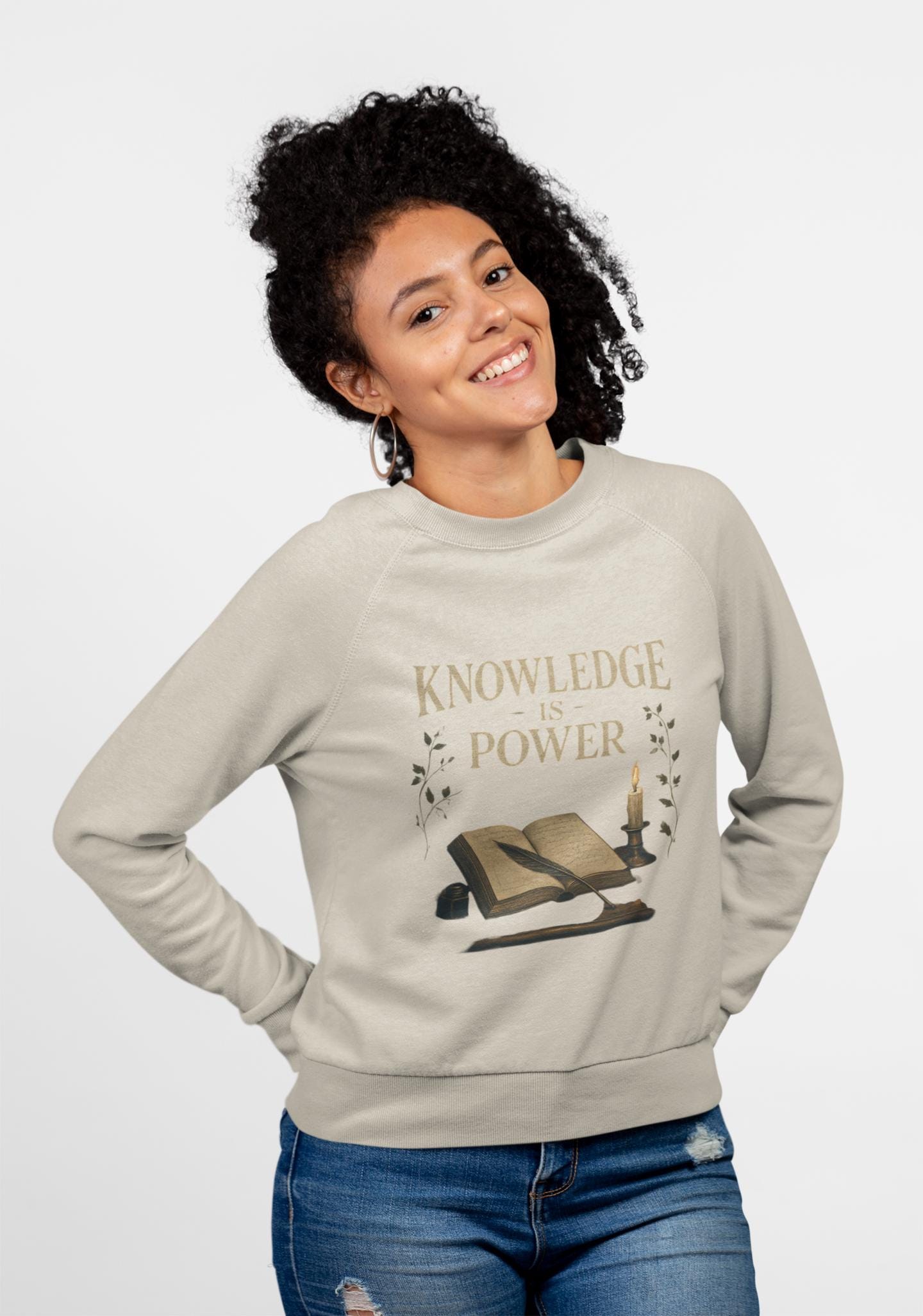 Soft, warm, and quietly confident — this crewneck wraps you in a calm that says you value thoughtfulness. Creamy off-white fabric and a muted gold-and-brown design show an open book, candlelight, and the words “KNOWLEDGE IS POWER.” Wear it while curled up with late-night reading, grading papers, or walking to a small town cafe. The classic fit and medium-heavy 50/50 cotton-poly blend keep the shape while the ribbed collar and double-needle stitching stand up to repeated wear. It’s for people who prefer quiet strength — scholars, teachers, students, and lifelong learners who want clothing that reflects an inner life without shouting. Subtle enough for daily wear, it carries an autumnal, study-night mood whenever you put it on.
