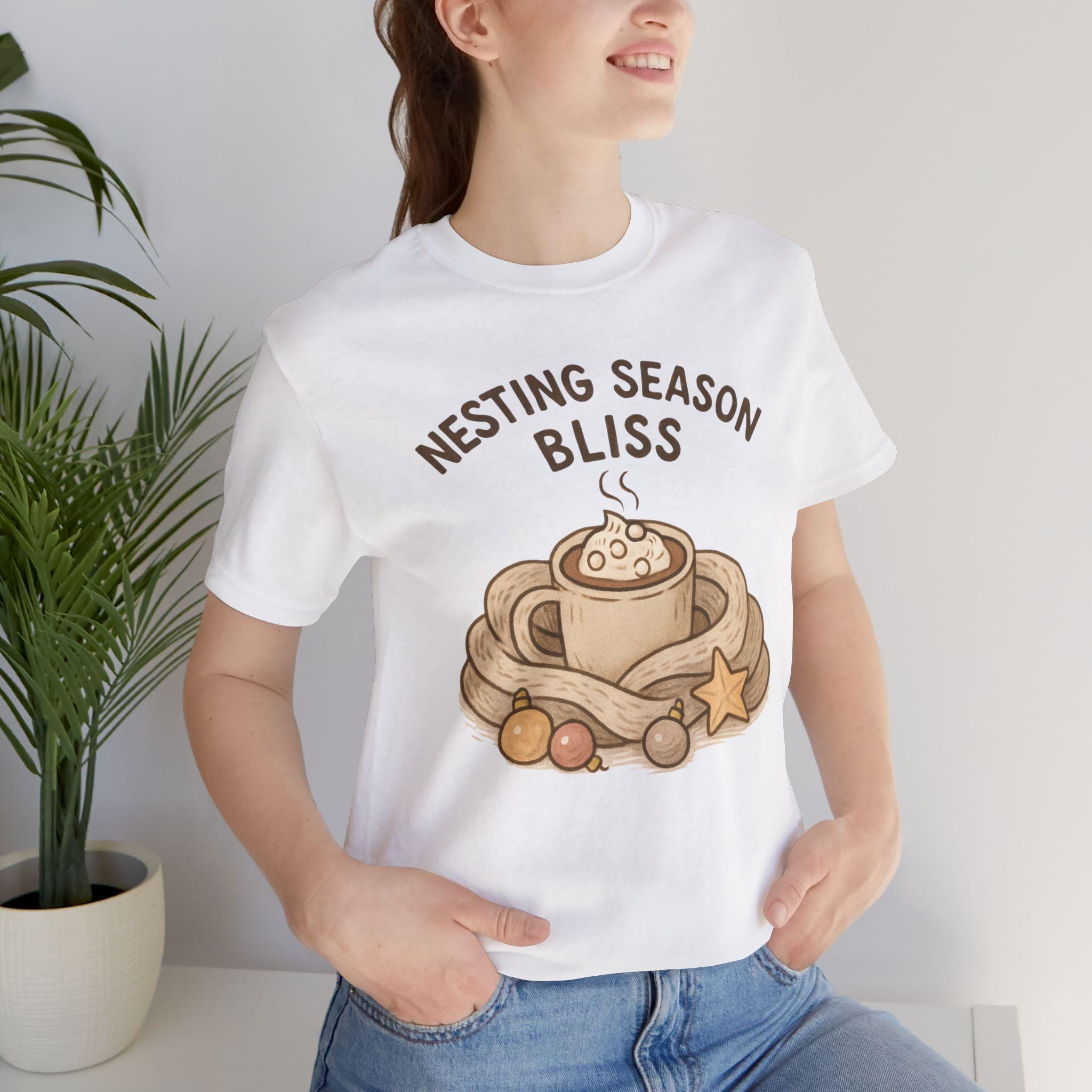 Wrap yourself in a soft, cozy vibe with this lightweight jersey tee featuring a warm, hand-drawn “Nesting Season Bliss” illustration. A steaming mug cradled in a knitted nest, scattered with tiny ornaments and a star, evokes quiet evenings indoors, candlelight, and slow mornings with a mug that feels like a hug. The retail fit and crew neckline layer easily under cardigans or wear solo for an effortlessly lived-in look. Breathable Airlume combed cotton keeps you comfortable whether you’re whipping up holiday baking, arranging a cozy corner, or settling in with a book. Thoughtfully made with sustainable practices, this tee blends simple comfort with seasonal charm for anyone who treasures home-centered, hygge-style moments.