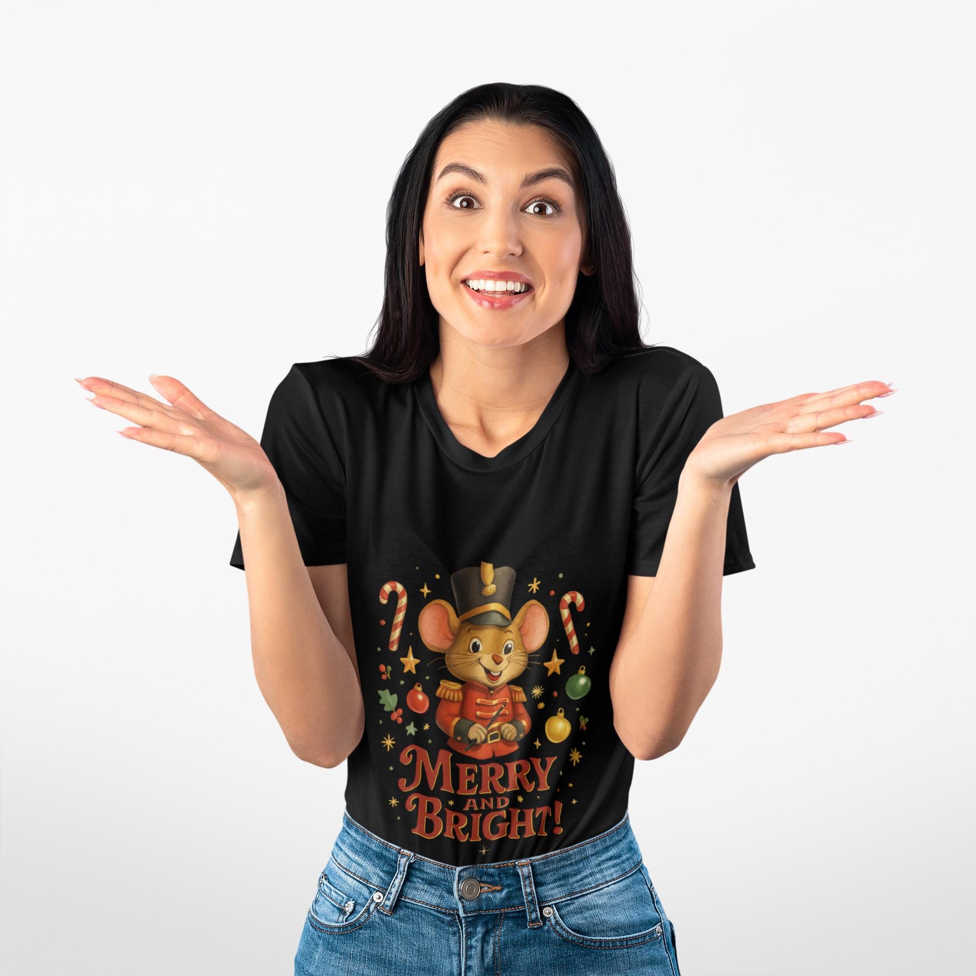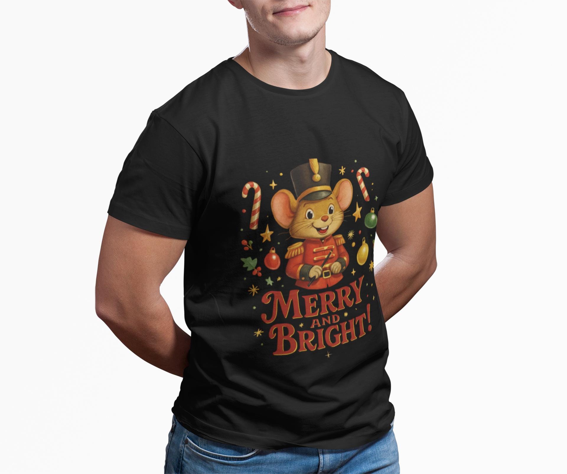 Soft, cheerful holiday tee that feels like a warm cup of cocoa and a crackling fire. A smiling toy-mouse in a tiny nutcracker hat holds a present amid candy canes, holly and ornaments — the words “Merry and Bright!” curl beneath in hand-drawn lettering. Lightweight Airlume cotton keeps the shirt breathable for busy family days, while the retail crew neckline and neat side seams give a tidy, wearable silhouette. Wear it to morning tree-decorating, cozy movie nights, or neighborhood caroling to carry a little playful nostalgia and festive sparkle wherever you go.