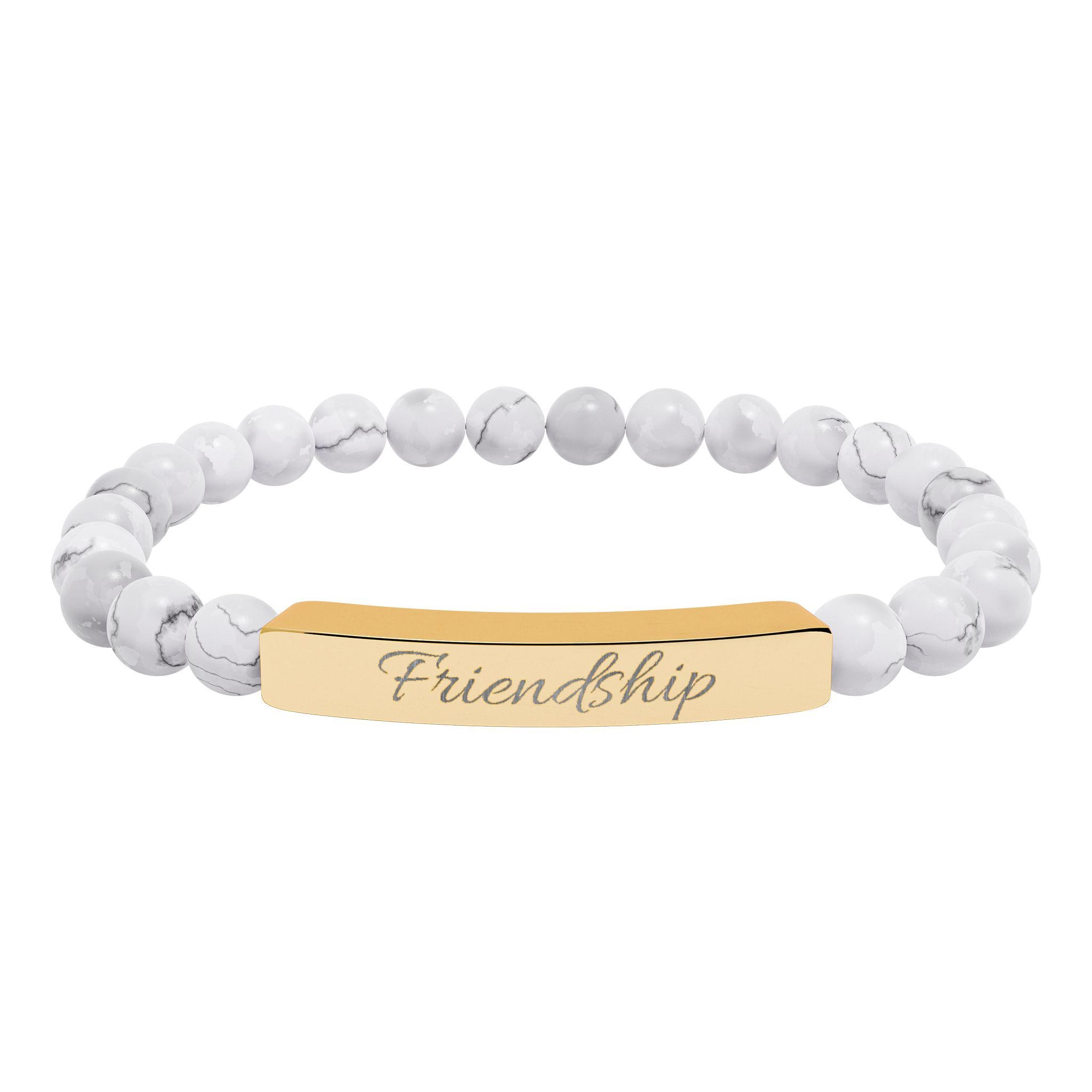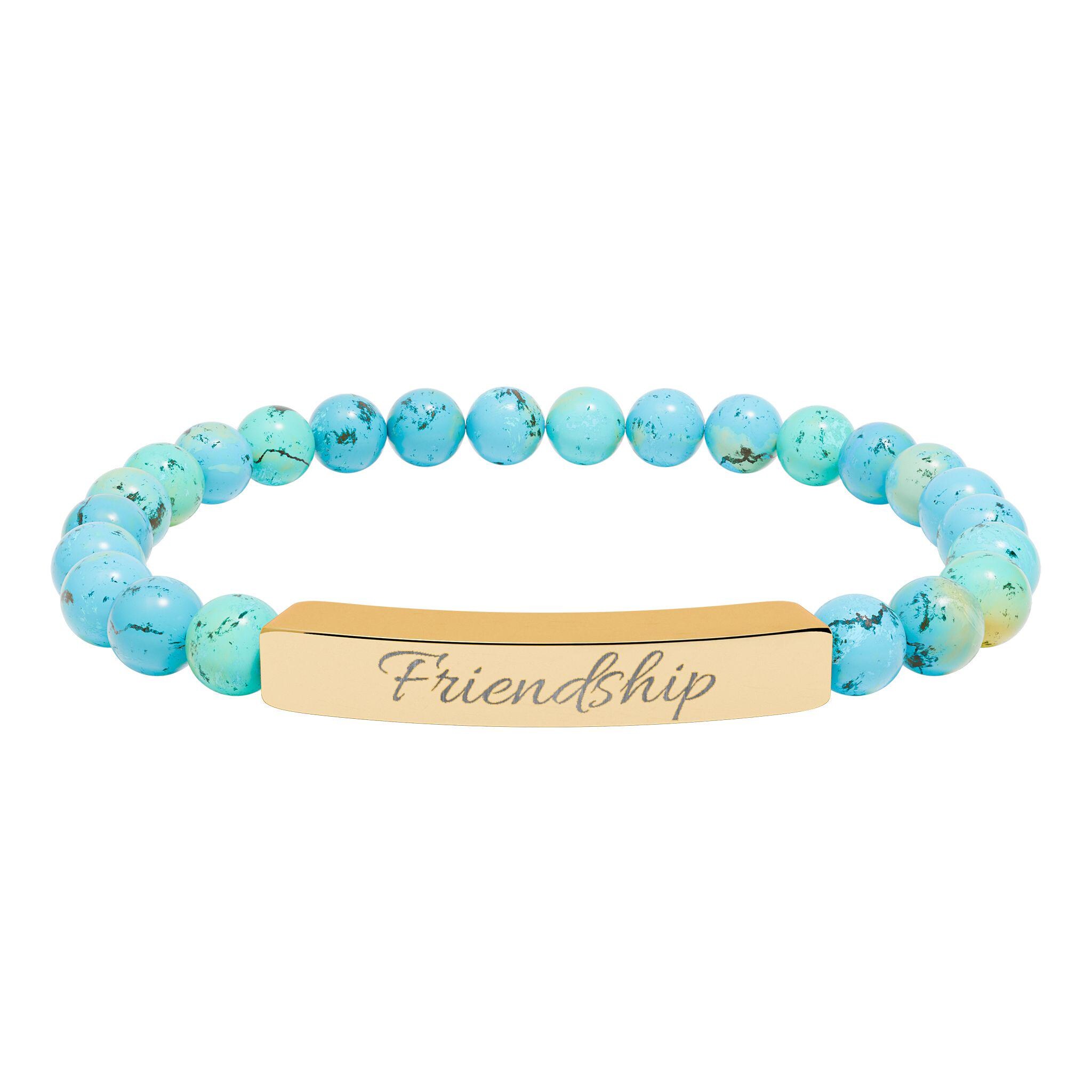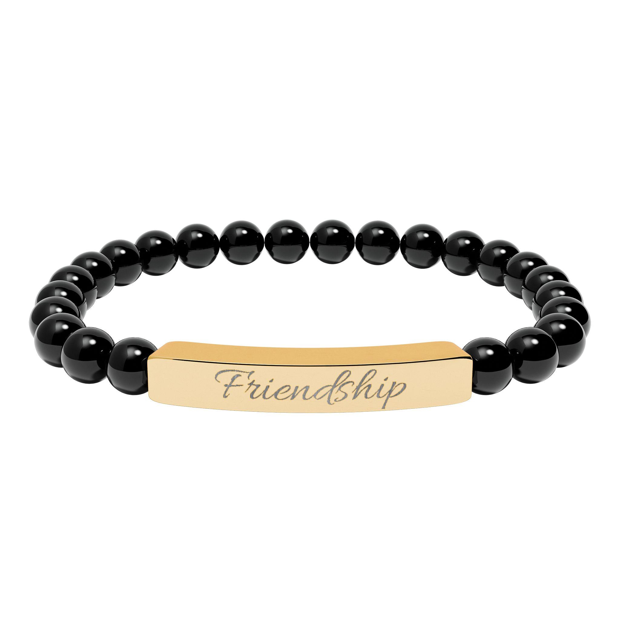 This natural stone stretch bar bracelet speaks quietly of lasting bonds. Smooth, polished beads slip comfortably underskin, the engraved stainless-steel bar carrying a message that stays sharp with time. It settles into everyday wear — worn at coffee catch-ups, long walks, or late-night calls — a small, tactile reminder of friendship. The cool weight of surgical-grade stainless steel pairs with warm stone tones for a balanced, grounded look. Gifted in a white gloss jewelry box lined with non-tarnish cotton, it arrives ready to be kept close and worn often.