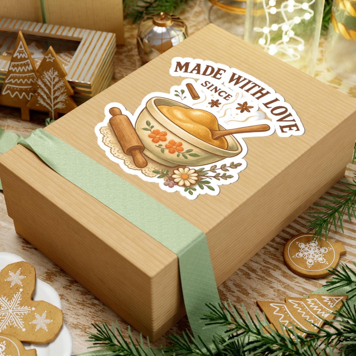 A warm, homey sticker that celebrates the slow, comforting craft of cooking. Soft, vintage-inspired colors and hand-drawn details — a mixing bowl, rolling pin, cinnamon stick and little flowers — create a nostalgic scene that feels like an afternoon in a cozy kitchen. It clings smoothly to laptops, journals, recipe boxes or pantry jars, adding a touch of handmade charm and a gentle reminder that some things are "made with love." The glossy finish brings out the artwork’s rich tans and warm creams while protecting the surface from light scratches. Comes in white or transparent backing and multiple sizes so you can place it exactly where the story belongs.