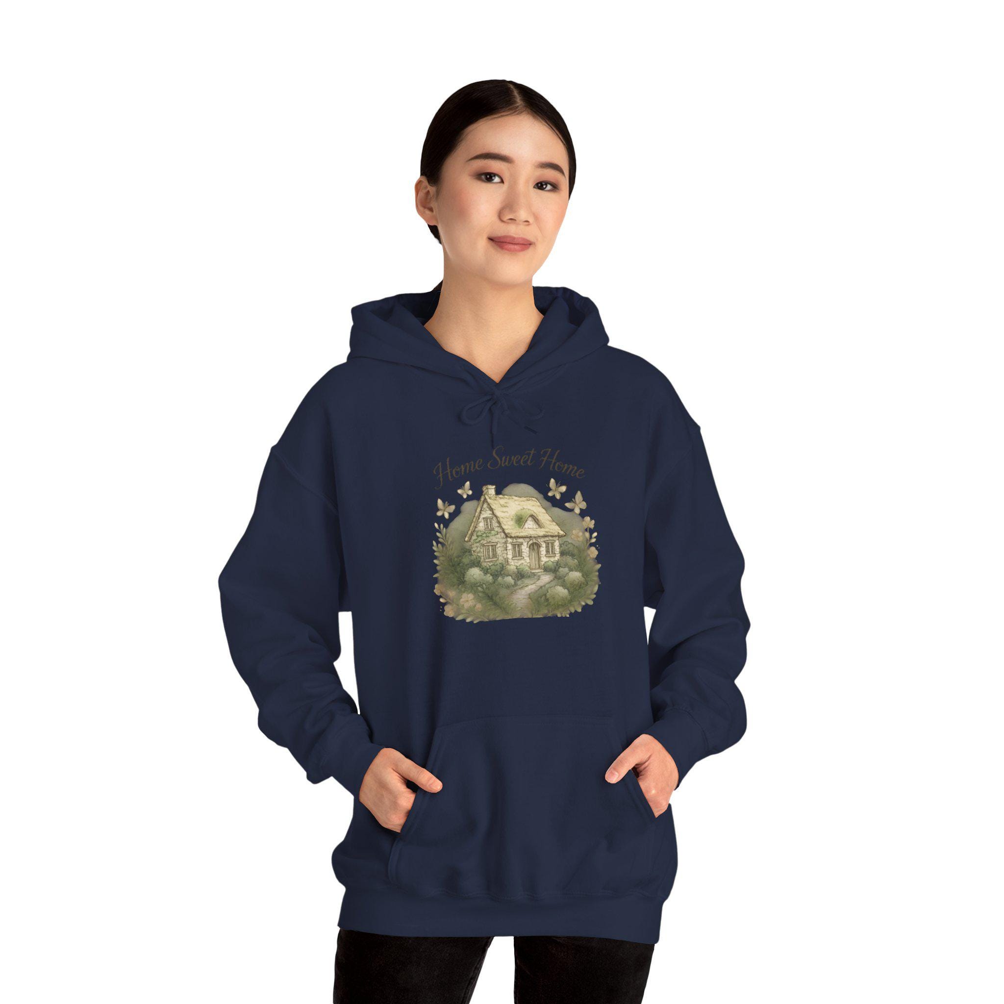 Wrap yourself in a quiet, cozy moment with this soft hooded sweatshirt. A gentle watercolor cottage sits at the chest, framed by muted foliage and the words "Home Sweet Home," evoking slow mornings, snowfall on the eaves, and warm mugs passed between friends. The roomy kangaroo pocket and double-lined hood make it easy to slip into comfort when running errands or settling in for a movie night. Neutral tones and subtle artwork let the piece blend into everyday life—layer it over a tee for a brisk walk, or pull it on after a day of unpacking a new place. It’s understated, warm, and designed to feel familiar from the first wear.
