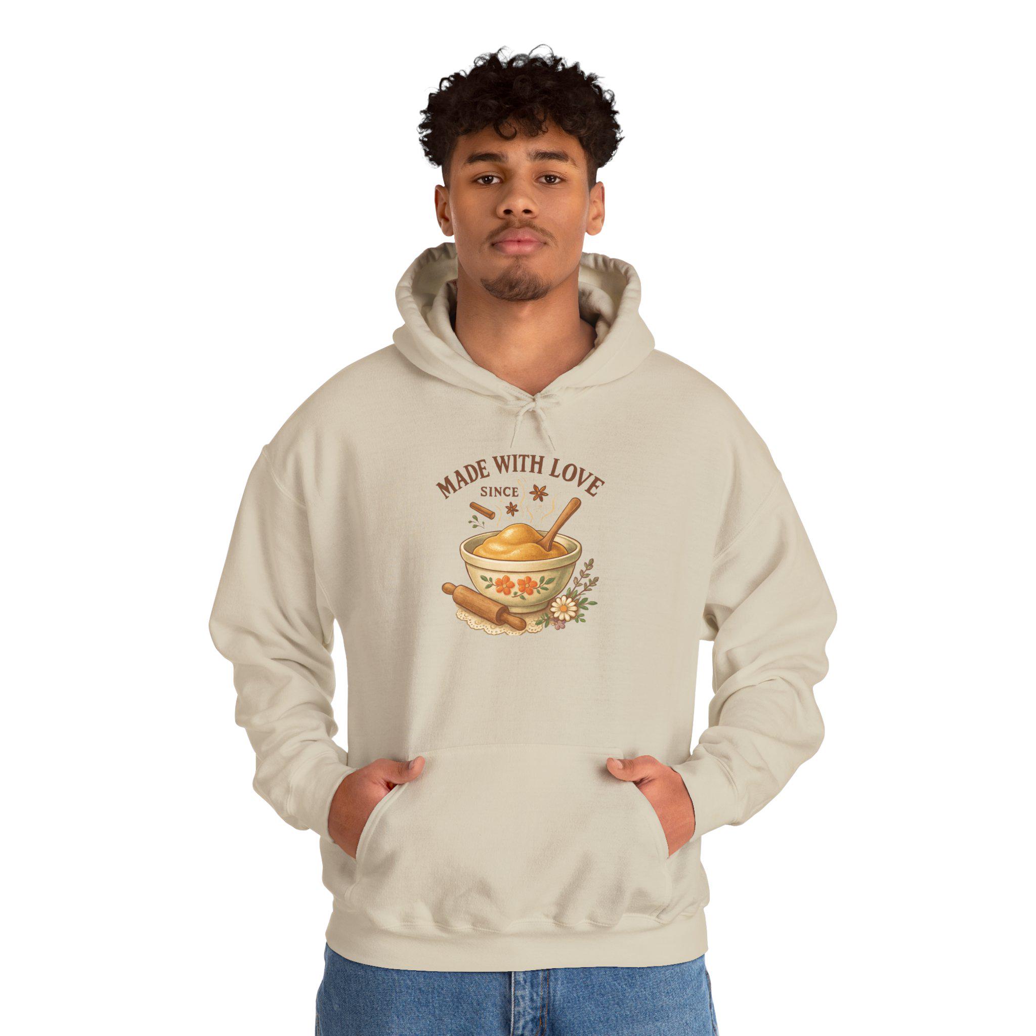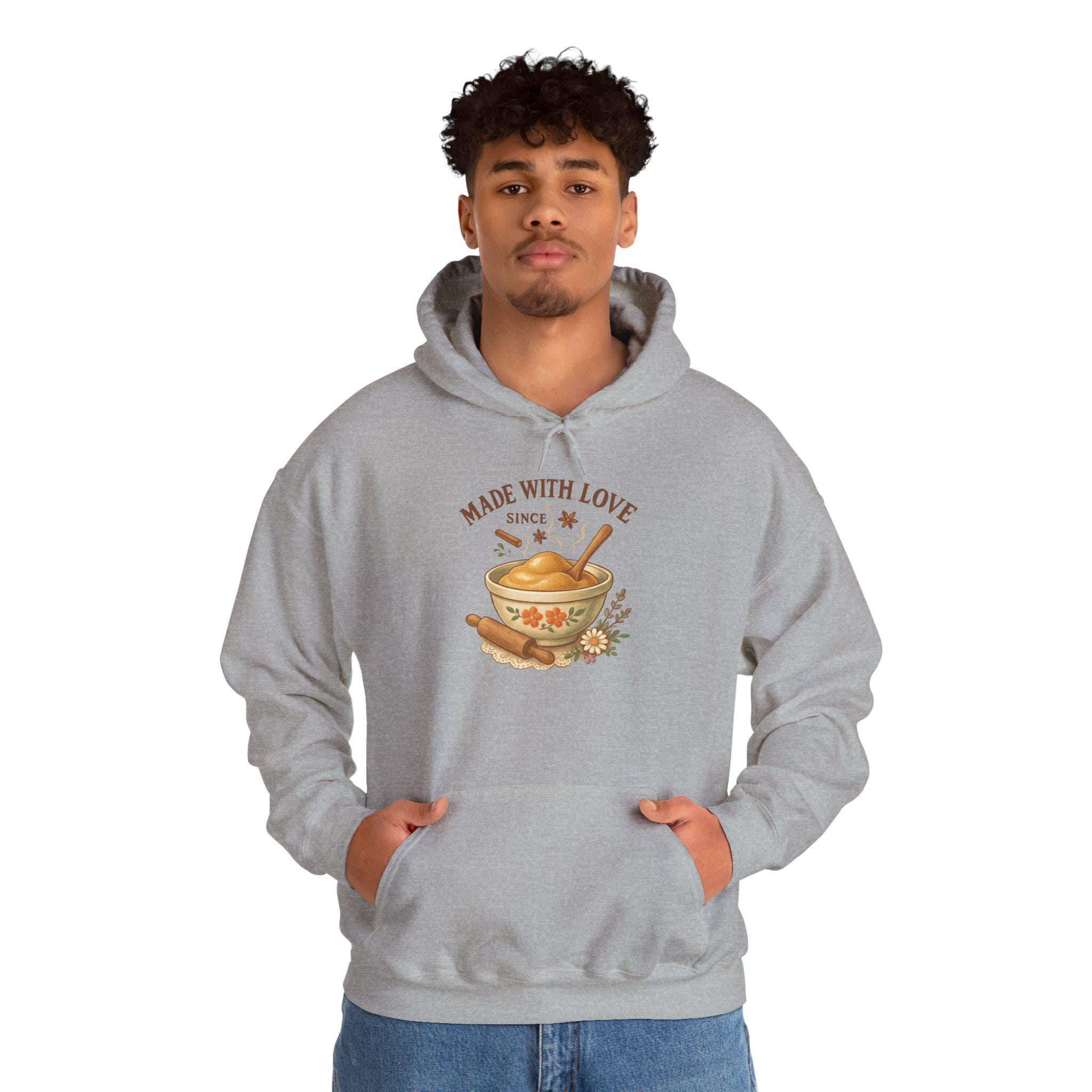 Warm, cozy, and quietly charming — this hooded sweatshirt carries the comfort of a home-cooked meal into your everyday. A soft white canvas frames a rustic illustration of a steaming bowl, rolling pin, and sprigs of herbs with the words “Made With Love” above. It feels like a family kitchen on a slow Sunday: gentle, nourishing, and a little nostalgic. Wear it while baking, sipping tea, or wrapping yourself in comfort after a long day. The roomy pouch pocket and double-lined hood keep you snug; the subtle artwork nods to anyone who cooks with care or remembers the scent of fresh bread. This sweatshirt slips easily into the life of someone who values warmth, simple rituals, and handmade moments.