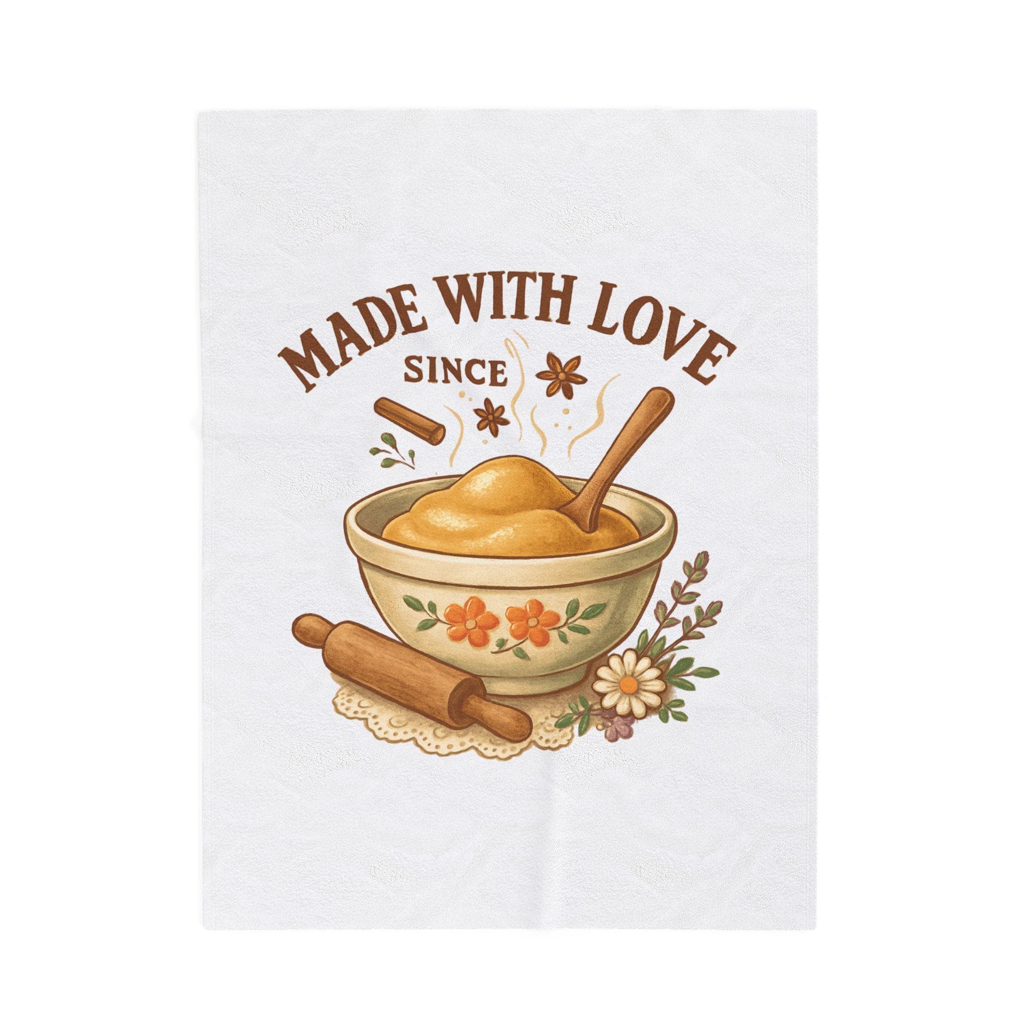 Wrap yourself in a quiet kitchen morning. This velveteen plush blanket carries a warm, vintage baking illustration—soft golds, cinnamon browns, and tiny floral details—that feels like a handwritten recipe passed down through generations. It lands lightly over your lap while you sip tea, cushions a chilly chair during cookie season, or becomes the go-to cuddle layer for evenings spent reading by lamplight. The texture is plush against skin but drapes neatly over a sofa or footstool, adding a handcrafted, homey touch to a small kitchen nook or farmhouse-style living space. Its single-sided, high-detail print keeps the artwork vivid while the reverse stays clean and cozy. For people who bake with intention, collect vintage kitchenware, or curate warm, lived-in spaces, this blanket quietly signals care and comfort.