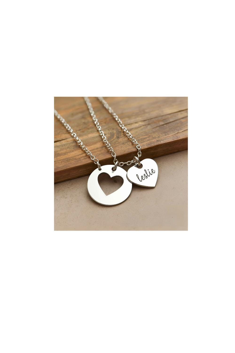 - Linked double-pendant design with engraved heart detail