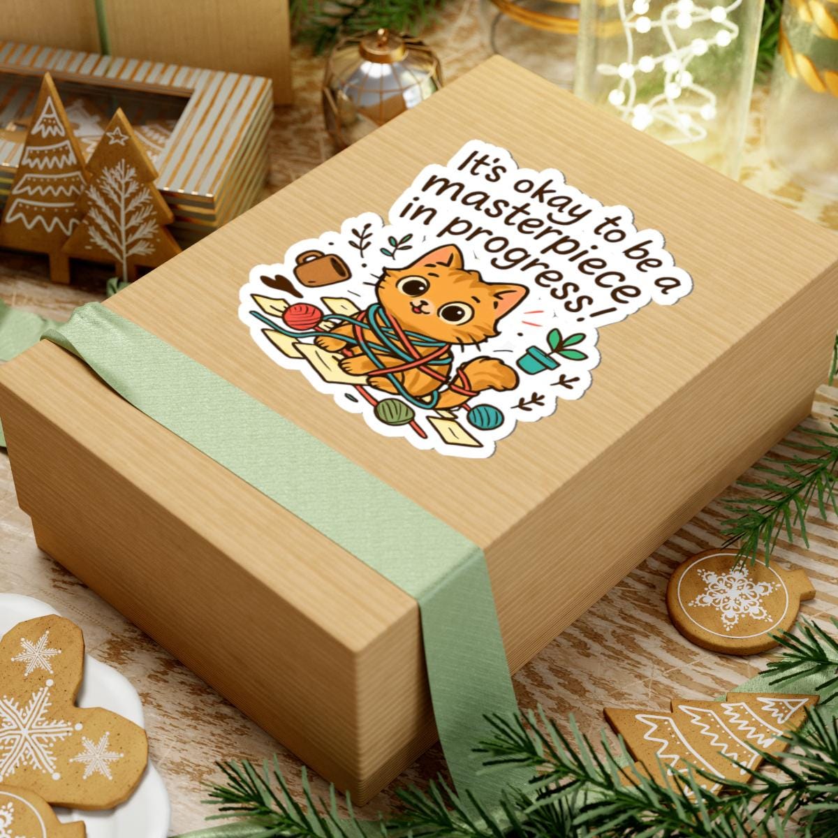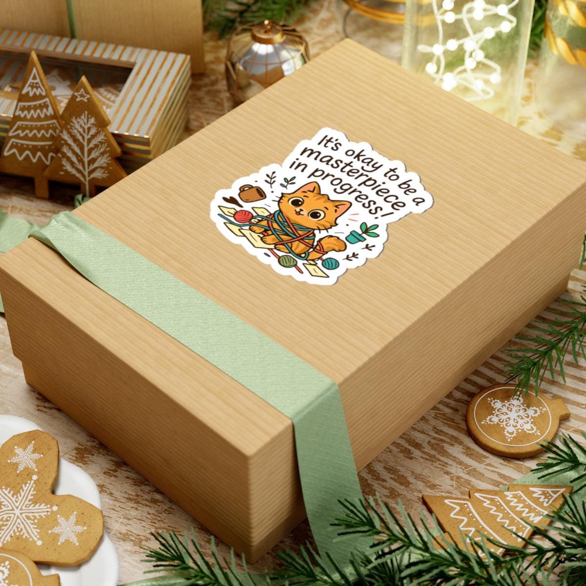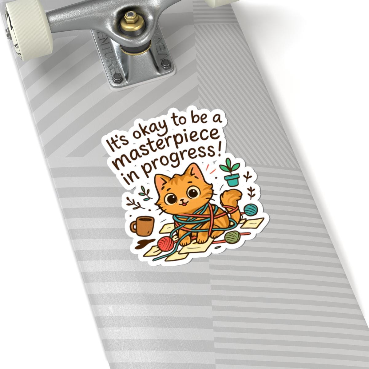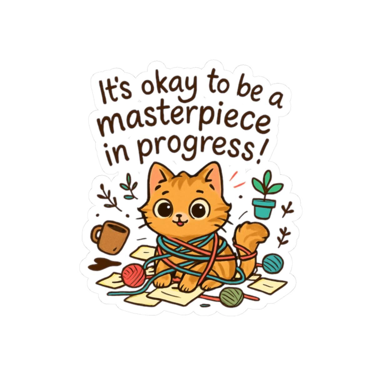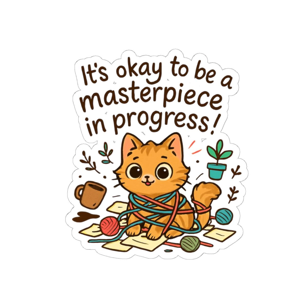 A glossy kiss-cut vinyl sticker featuring an adorable orange kitten tangled in yarn with the uplifting phrase “It’s okay to be a masterpiece in progress!” Warm, hand-drawn colors pop against the clean white border, creating a playful, cozy vibe. Stick this on laptops, journals, water-bottle-ready surfaces, or anywhere you want a small reminder to be gentle with yourself. The scratch-resistant glossy finish catches light and keeps the illustration bright, while the strong permanent adhesive ensures it stays put on smooth, flat surfaces. Comes in white or transparent backing and multiple sizes to match your preferred placement.