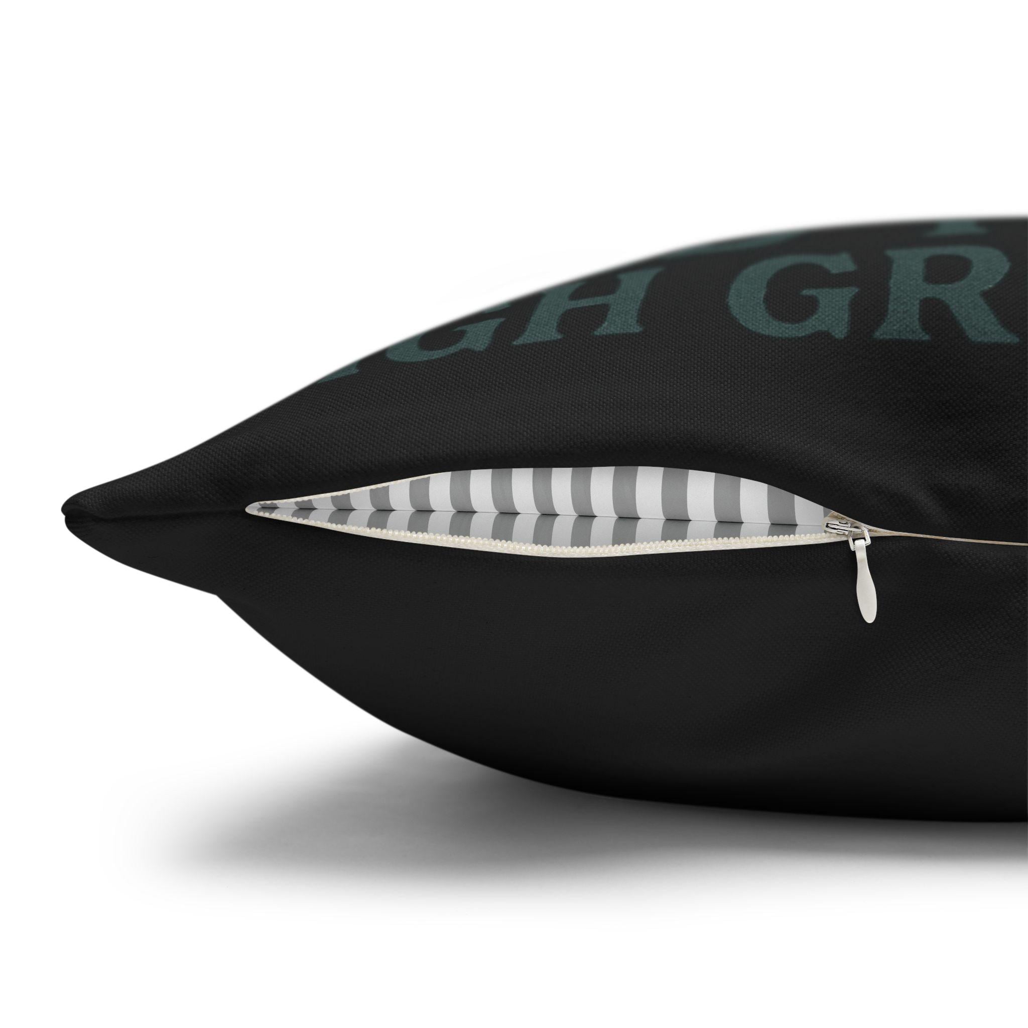 A cozy square poly canvas pillowcase printed front and back with a hand-drawn mountain scene and the phrase “Find Your High Ground.” The muted teal and cream palette sits on a deep charcoal background, bringing a calm, outdoorsy vibe to sofas, reading nooks, and camper bunks. The fine-weave polyester canvas has a soft yet structured feel that holds the art’s crisp lines and vintage-style texture. The zipper is discreet and metal, keeping the look seamless while making the cover easy to remove for spot cleaning. This pillowcase is for anyone who finds peace on trails, craves cabin-style accents, or wants a quiet reminder to seek higher ground in everyday life.