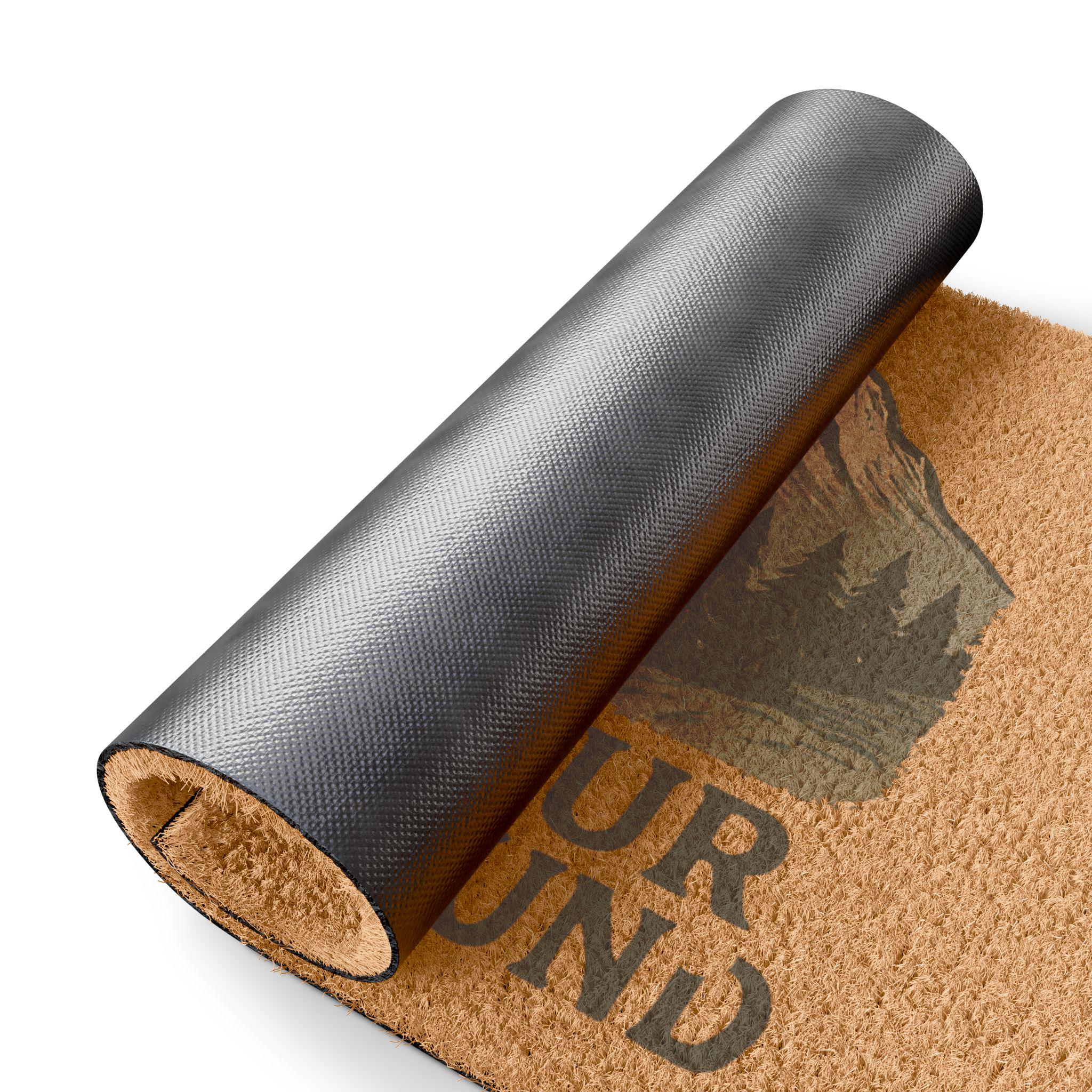 Rustic and grounding, this coir doormat greets guests with an illustration of towering peaks, a winding trail, and the words “Find Your High Ground.” The natural coconut fiber surface traps dirt and debris while the durable black vinyl backing keeps the mat firmly in place on porches and entryways. Sized to fit standard doorways, it’s made from grade-A tufted coir and assembled in the USA from globally sourced parts — built to handle outdoor weather while keeping a warm, nature-inspired welcome at your threshold.