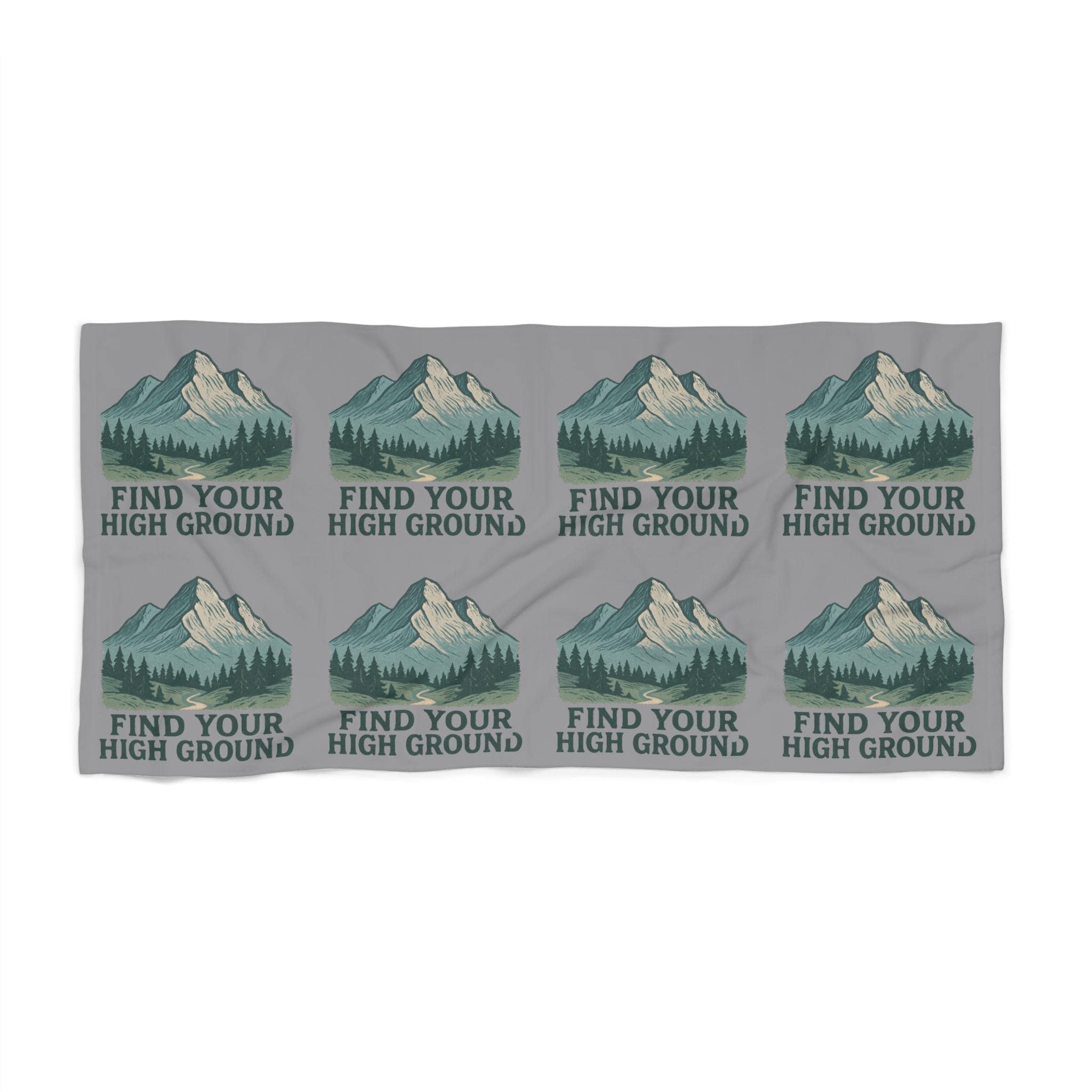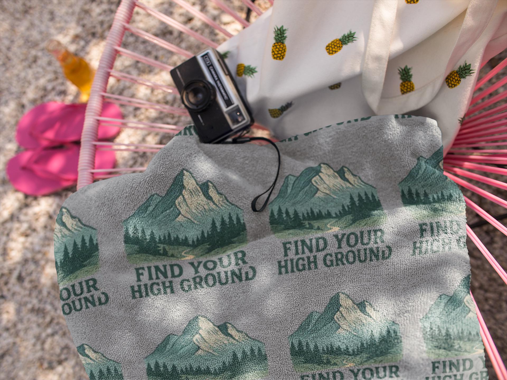 A coastal-meets-mountain beach towel that balances soft, absorbent comfort with a bold outdoorsy graphic. The design repeats a calming mountain scene with the phrase "Find Your High Ground," giving this towel a quiet, adventurous spirit—great for days when you want the beach to feel like a stretch of open trail. The cotton loop backing feels plush against skin and soaks up water efficiently, while the polyester printed face preserves the detailed, fade-resistant artwork and dries quickly between dips. Lightweight enough to pack, substantial enough to lounge on, this towel brings a restful, nature-driven mood to beach days, lake trips, and post-swim moments at the pool.