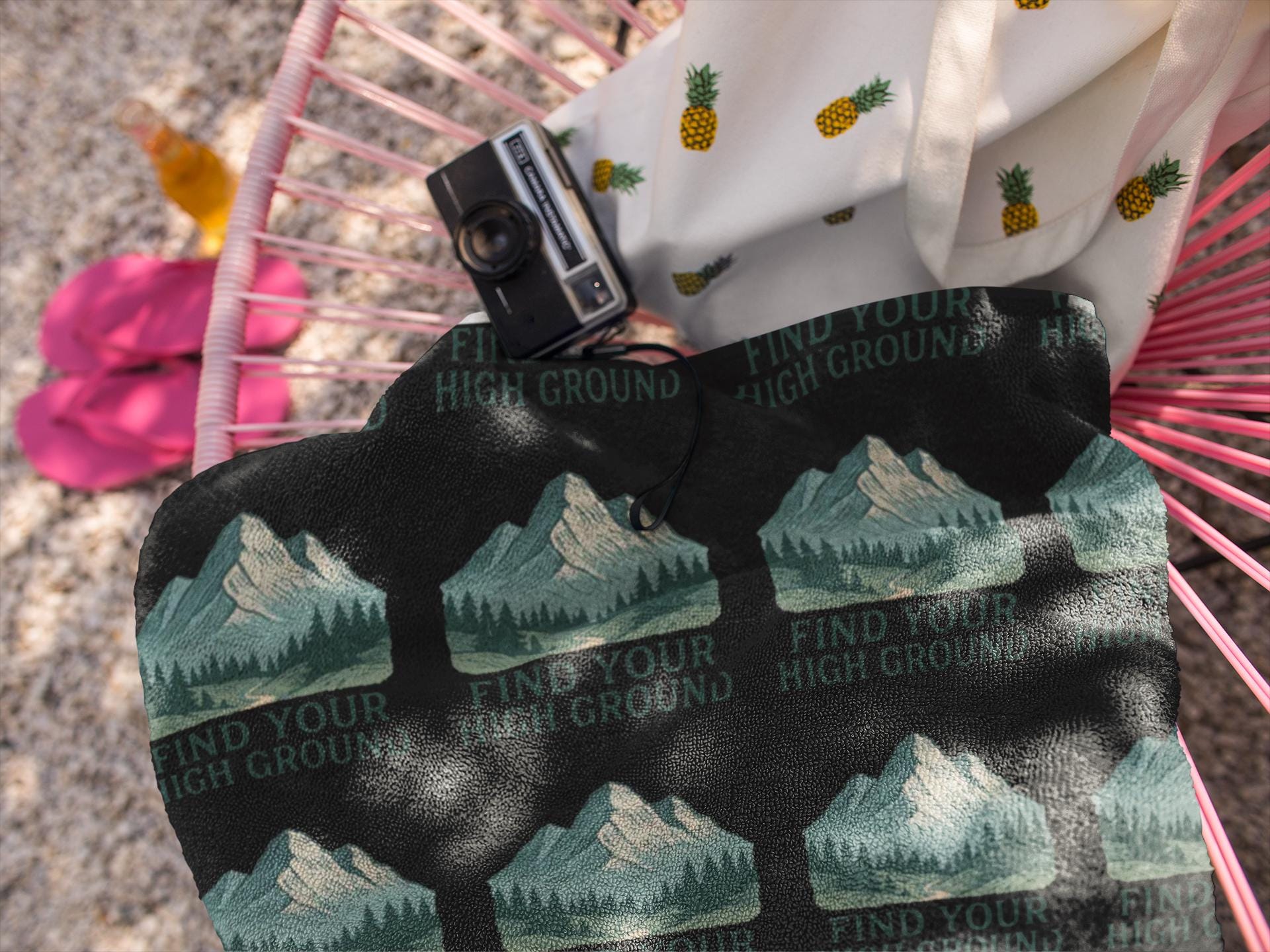 A lightweight, quick-dry beach towel that feels like a little piece of mountain air at the shoreline. The front displays a repeating vintage mountain illustration in muted teal and cream on a deep charcoal field, with the quiet motto “Find Your High Ground” woven into the pattern. Flip it over to a soft white cotton loop backing that soaks up salt and sweat and stays comfortable against skin. Available in two generous sizes, it lays flat on sand or wraps around shoulders for cool evenings. The design’s calm, outdoorsy energy makes it easy to bring a woodland state of mind to surfside afternoons, camping trips by the lake, or slow mornings on a balcony with a strong coffee.