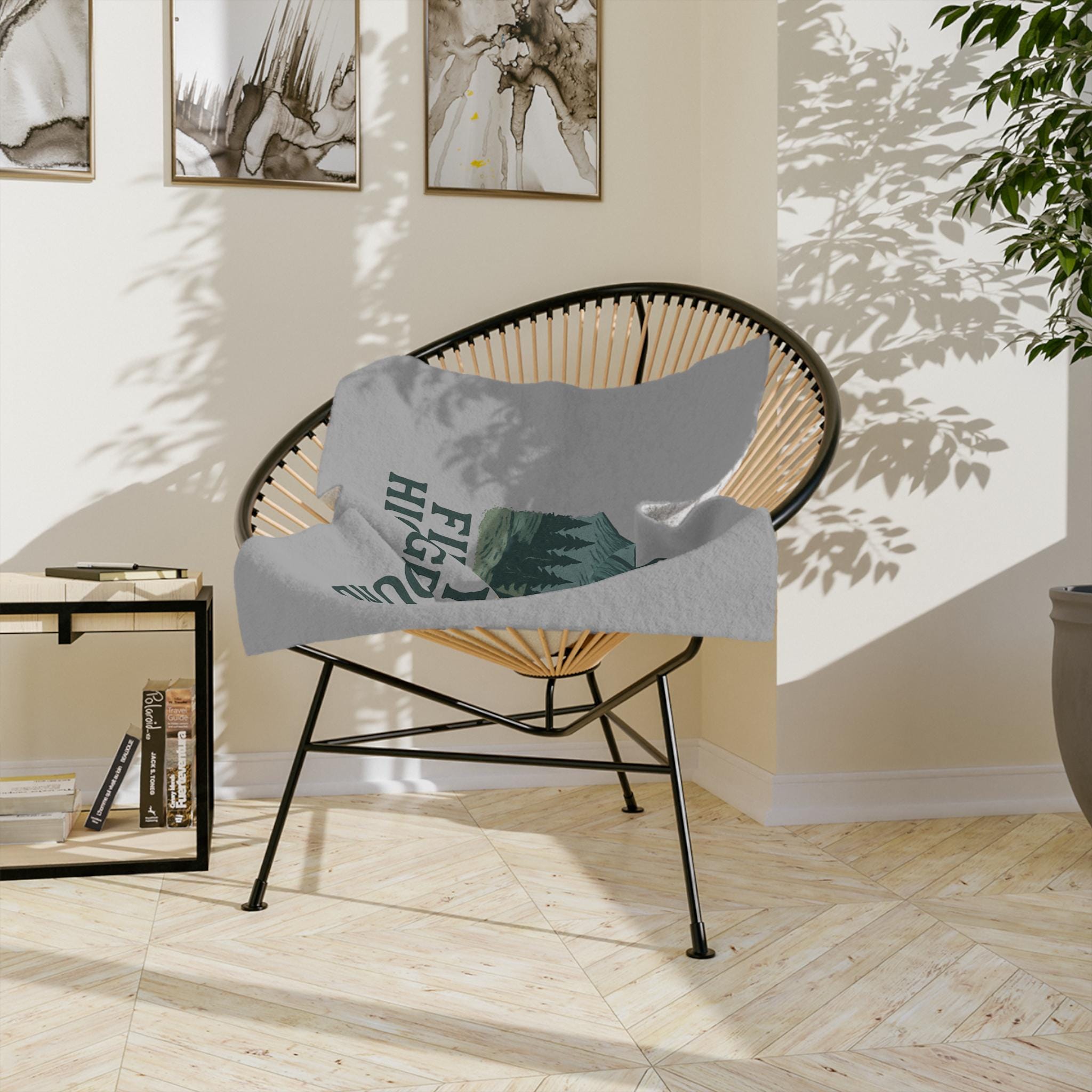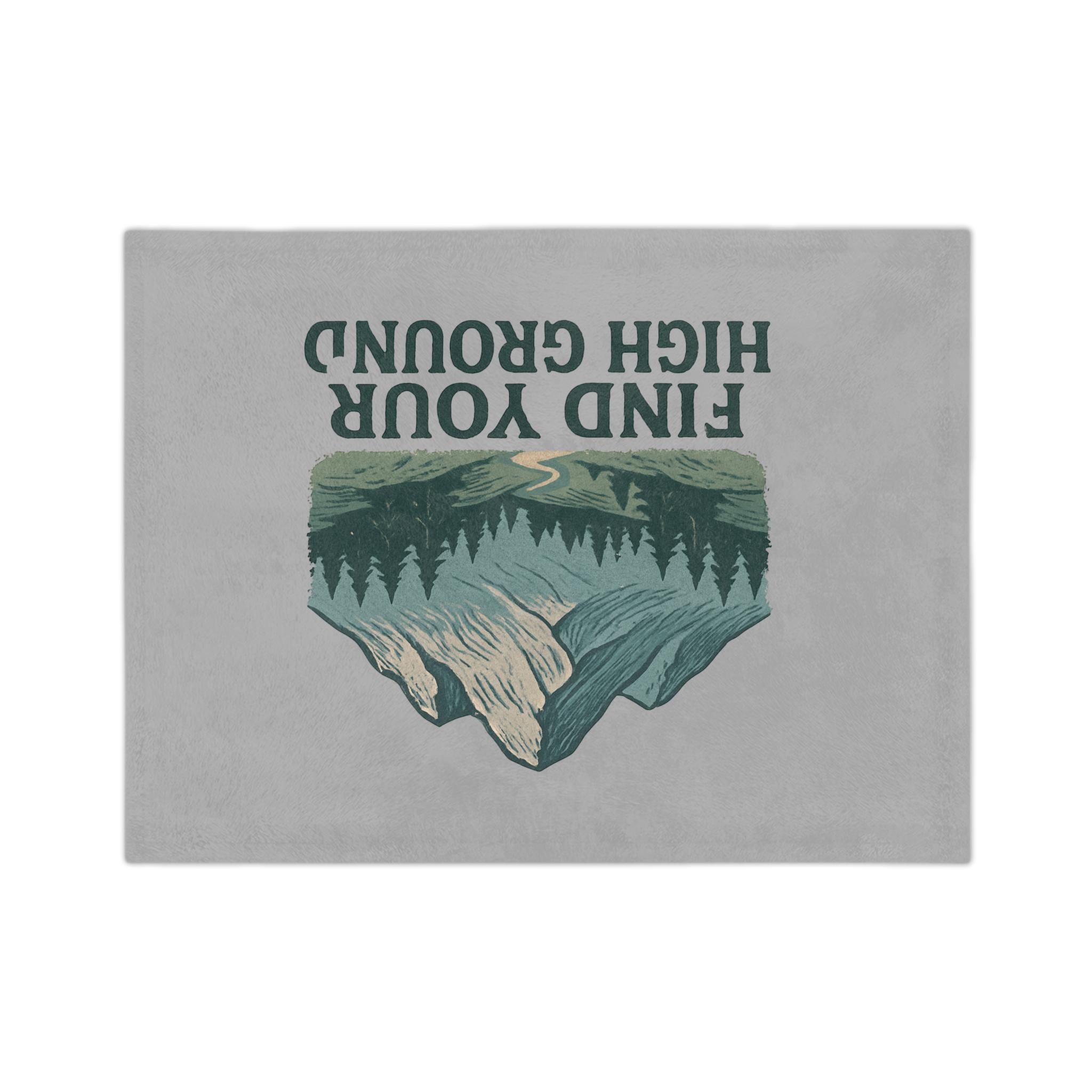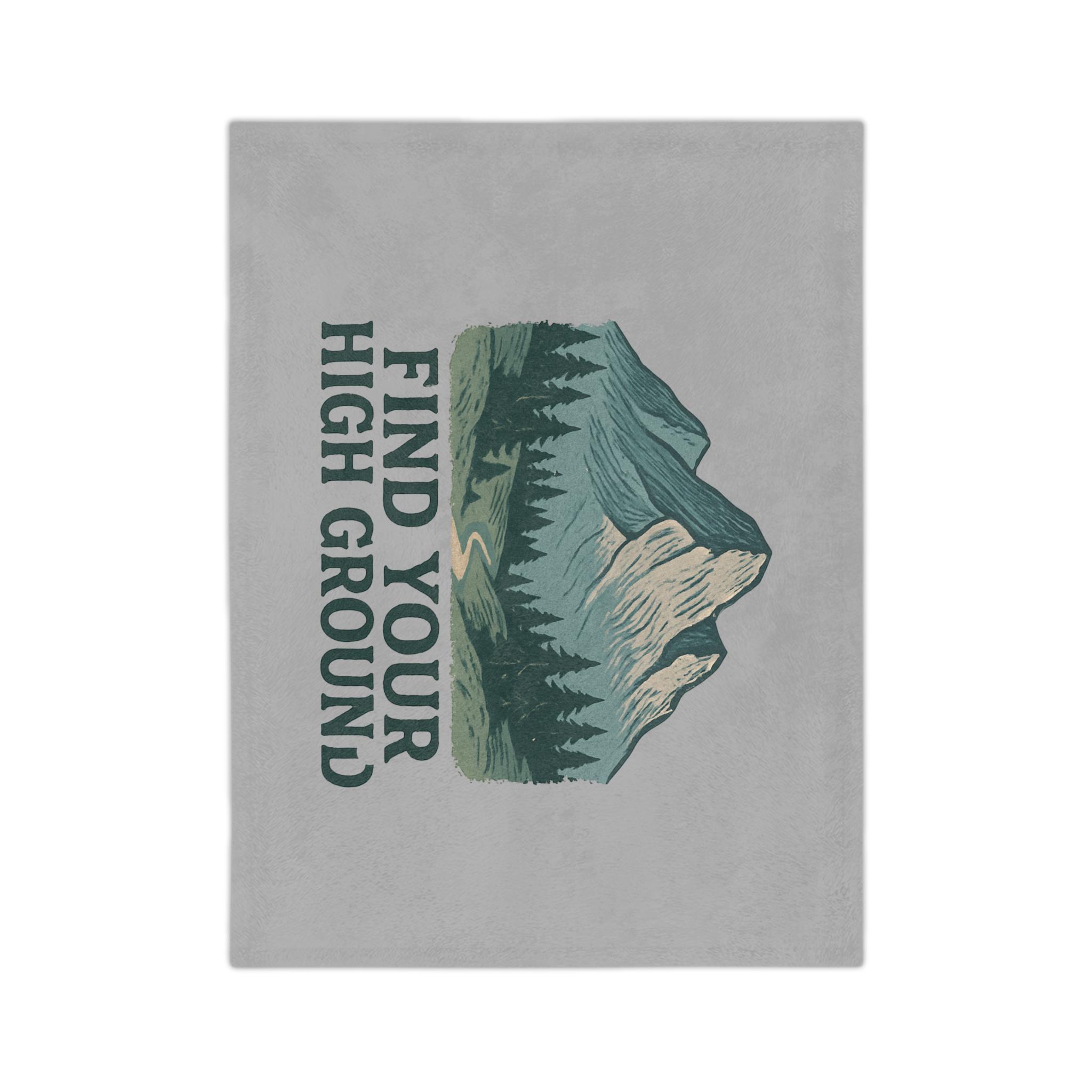 A plush velveteen microfiber blanket that brings the calm of mountain mornings to your living room. The soft, brushed surface holds a crisp, vintage-inspired illustration of pine-lined peaks and the uplifting line “Find Your High Ground.” It’s lightweight yet cozy — great for curling up with a book, stretching out on a rooftop at dusk, or layering on chilly cabin nights. The muted, nature-driven palette and stitched hem give it a finished, outdoorsy feel that blends with rustic and modern decor alike.