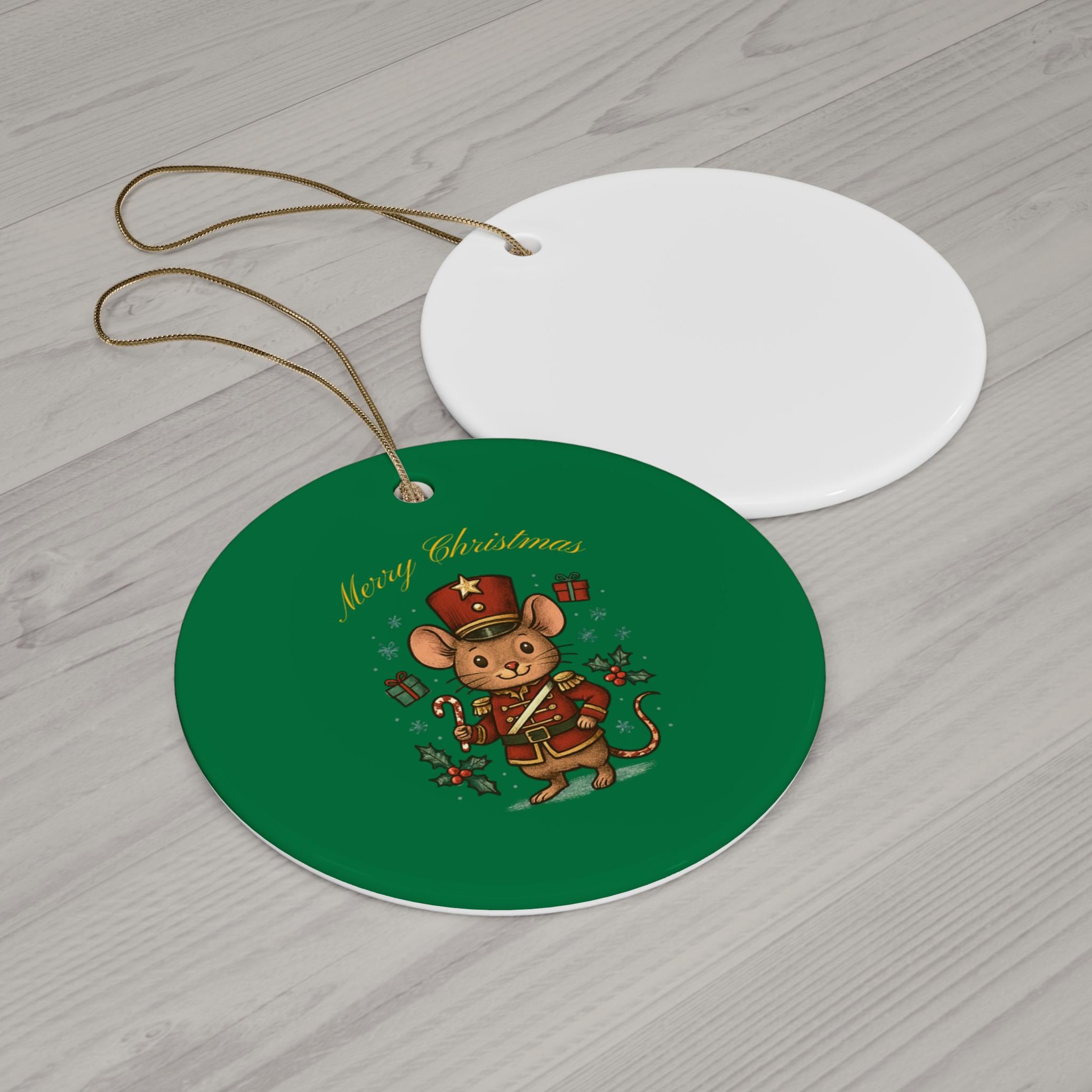 Tiny and bright — a hand-held moment of holiday cheer. This ceramic ornament settles into a tree branch or windowsill and brings a playful, vintage-inspired warmth with a little Christmas mouse rendered on a crisp star silhouette. The glossy surface catches twinkle lights and the gold hanging string adds a soft, old-fashioned shimmer. Hang it among family heirlooms or give it to someone who collects quirky seasonal pieces; it leans cozy, nostalgic, and a little mischievous — like finding a secret note in a stocking on chilly mornings.