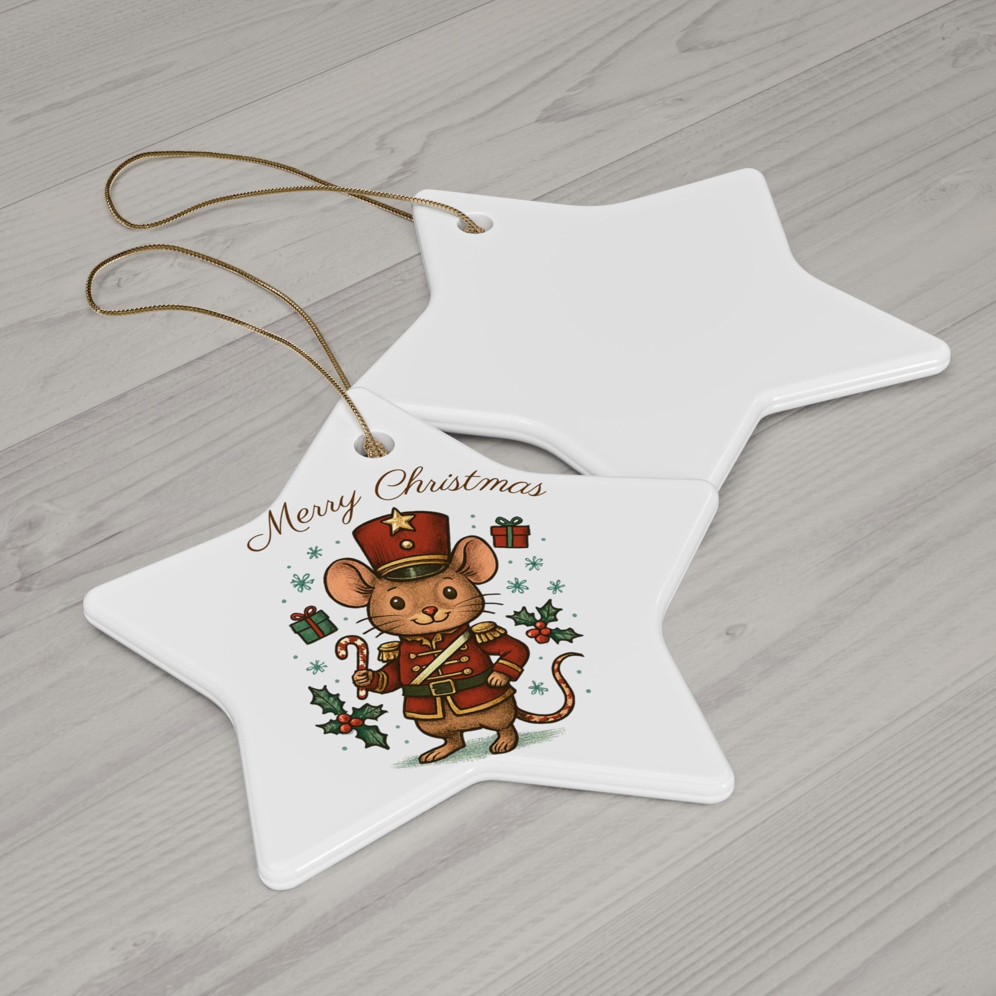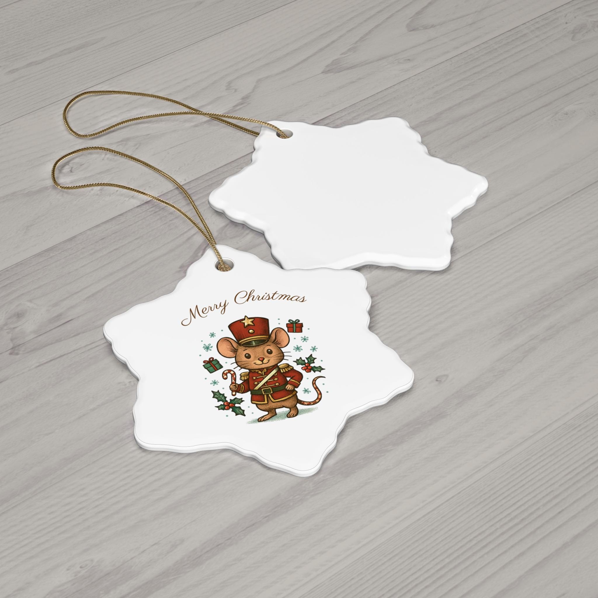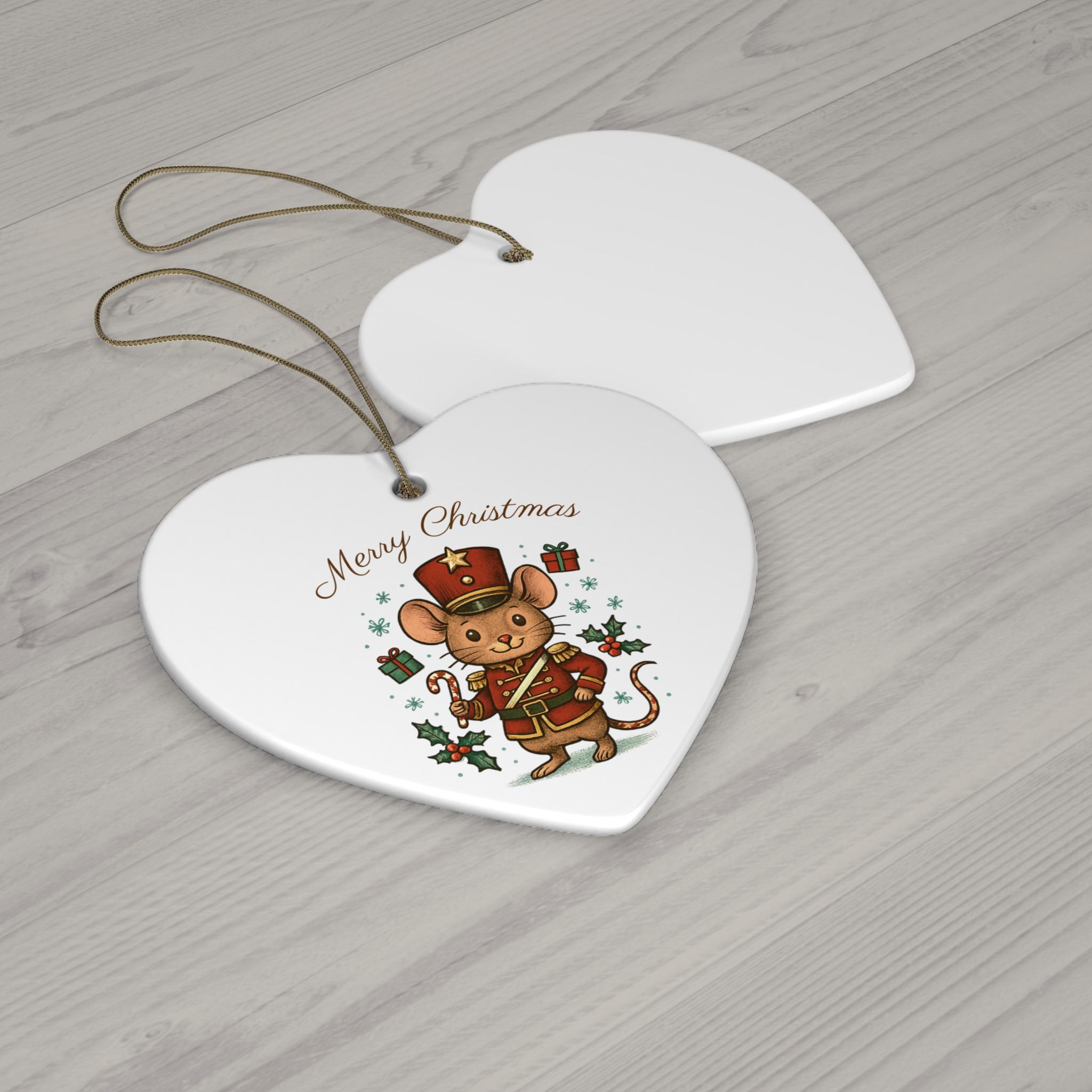 A small, joyful ceramic ornament that brings a touch of storybook holiday cheer to your tree. Hand-finished in bright, glossy colors, this white ceramic piece features a merry mouse dressed as a nutcracker — a playful, nostalgic take on seasonal decorations. Light catches the smooth glaze as the mouse stands proud in miniature uniform details, creating a warm, whimsical accent among pine and twinkle lights. Each ornament arrives ready to hang with a gold-toned string, and the compact, durable ceramic holds its color year after year. Choose from Snowflake, Star, Heart, or Circle shapes to match your tree’s mood or to tuck into a stocking with a note. The single-sided print keeps the design crisp on display, turning a simple branch into a tiny scene that sparks smiles and quiet holiday memories.