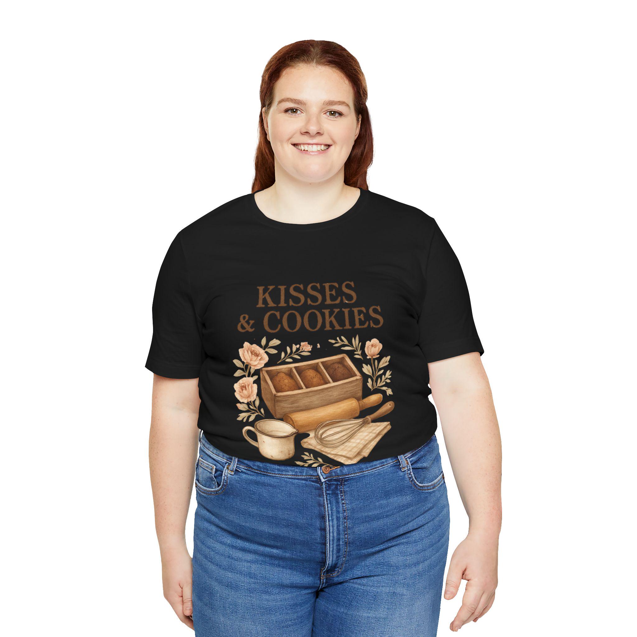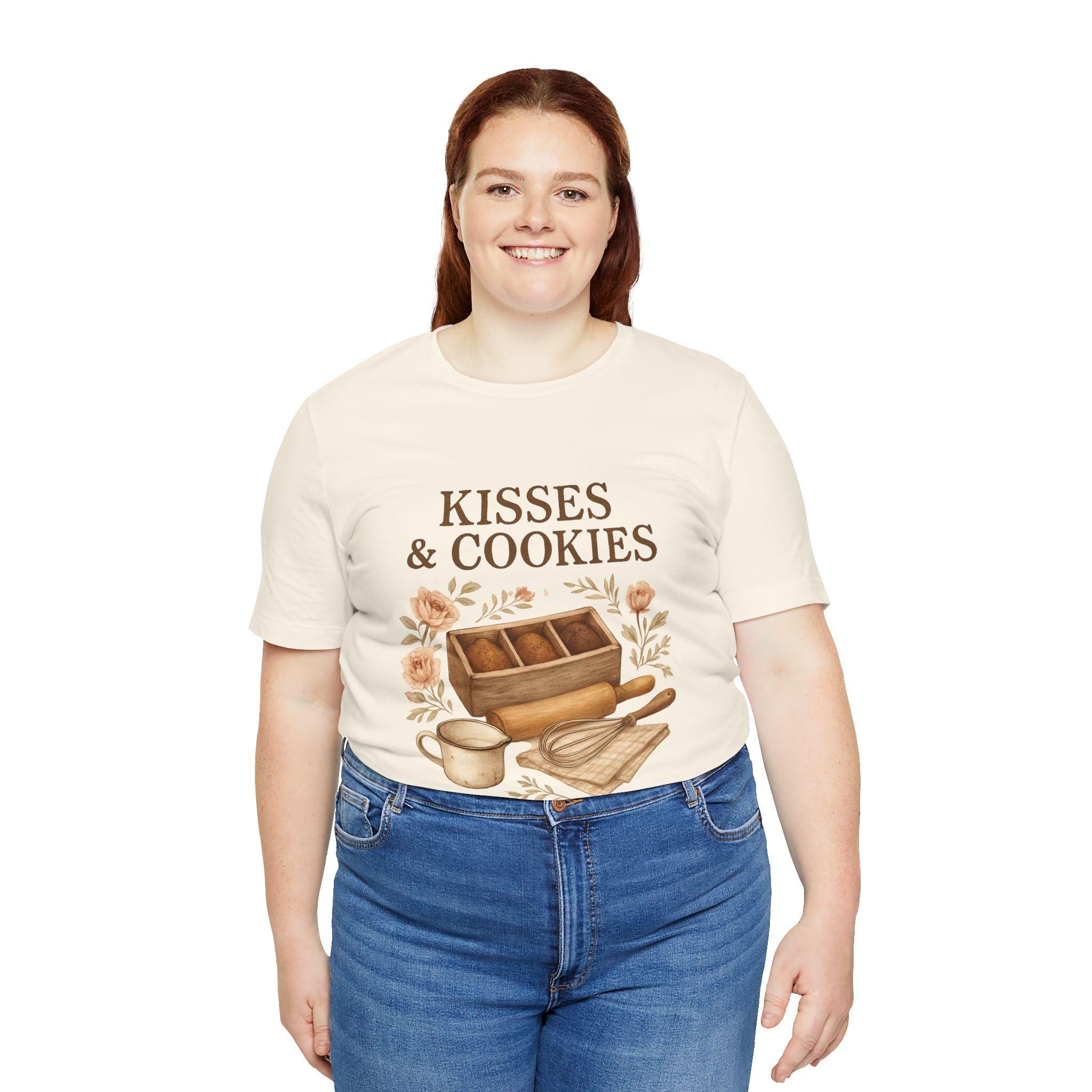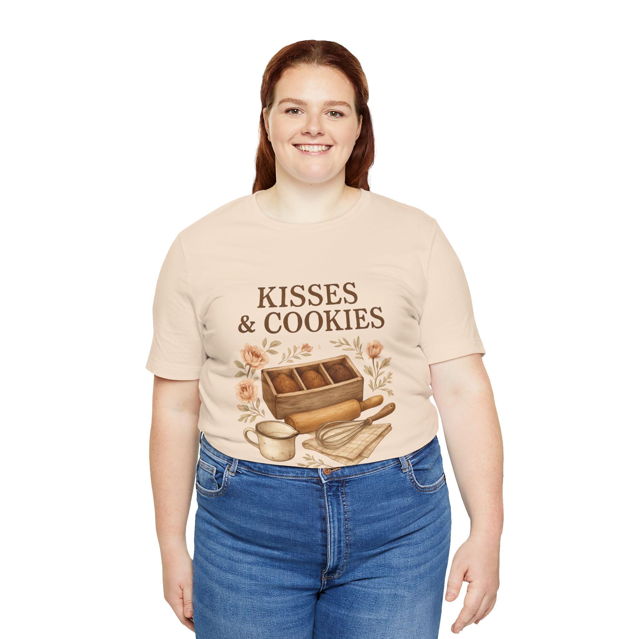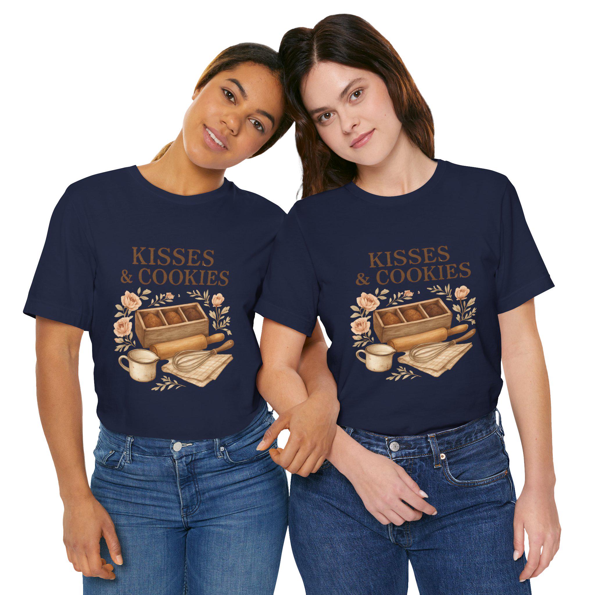 Soft, sunlit kitchens and the warm hush that comes when someone’s baking — this tee carries that quiet, cozy joy. A delicate illustration of a wooden cookie box, rolling pin, measuring cup and linens sits beneath the warm script “KISSES & COOKIES,” evoking afternoons spent with flour on the counter and laughter at the table. Lightweight cotton breathes while you move, and the clean crewneck keeps the look simple so the artwork stays front and center. Wear it for casual mornings with coffee, slow-baked afternoons, or to bring a touch of homey comfort to holiday baking sessions.