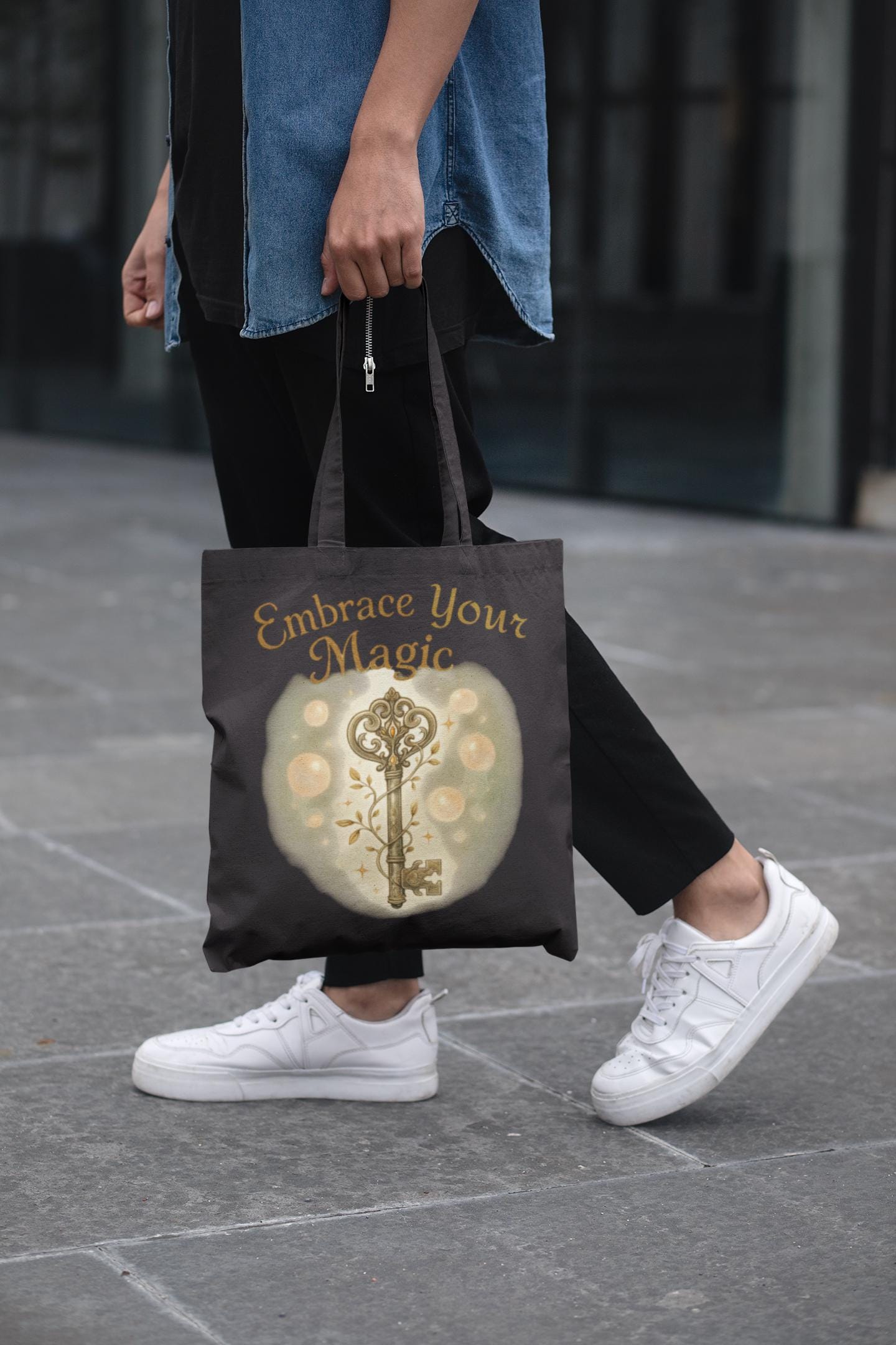 This cotton canvas tote carries a quiet kind of charm — a worn-key sketch and the phrase “Embrace Your Magic” printed in a vintage, hand-drawn style. It feels like the bag you grab when you’re headed out to a small bookstore, a moonlit market, or a friend’s studio: roomy enough for a journal and a thermos, sturdy enough for stacks of paper and daily errands. The natural and black canvas options keep the look grounded; the reinforced fabric handles and heavy-weight cotton mean it will age with character rather than fall apart. For someone who collects small rituals — morning coffee, sketching in the park, late-night letter writing — this tote quietly joins the routine and becomes part of the story.