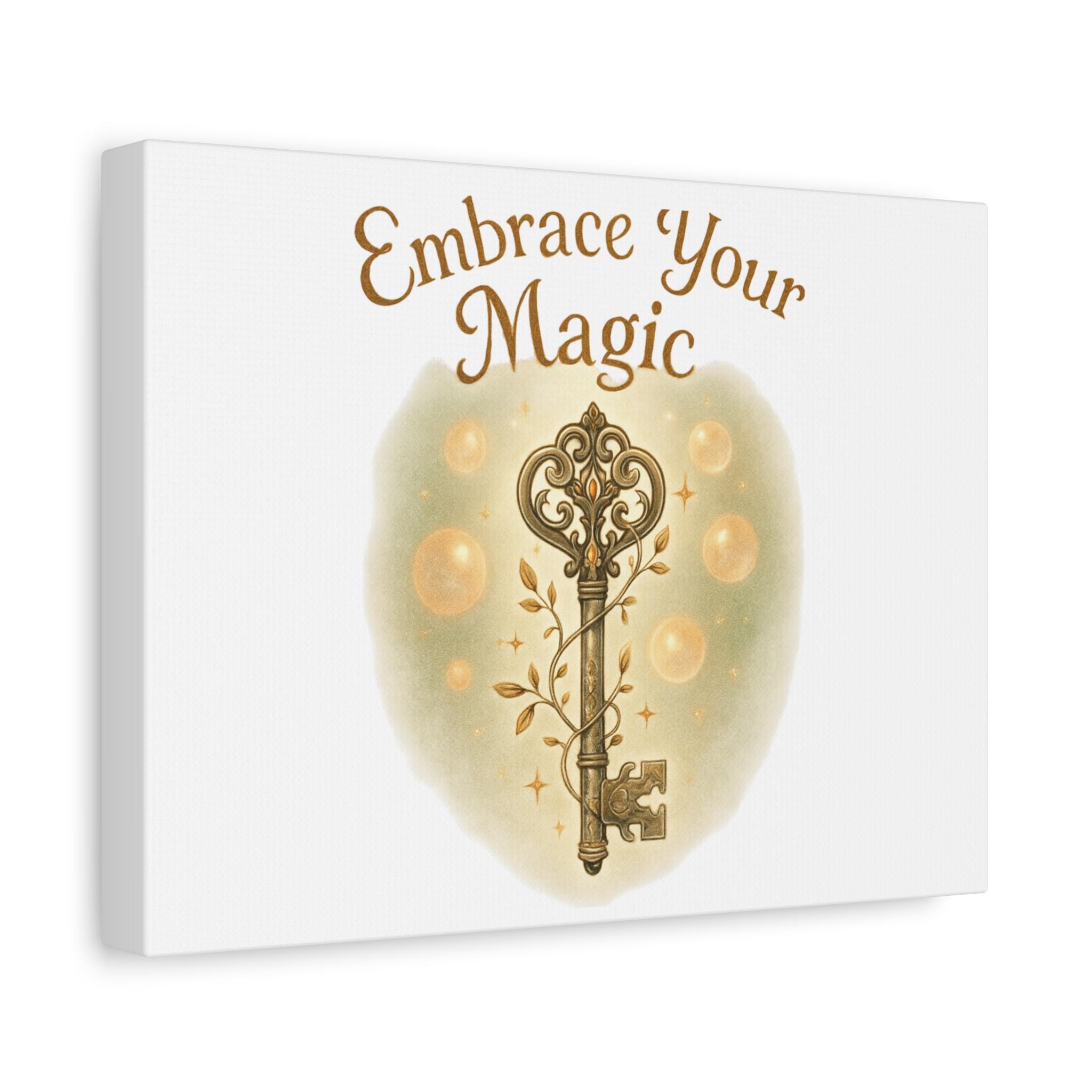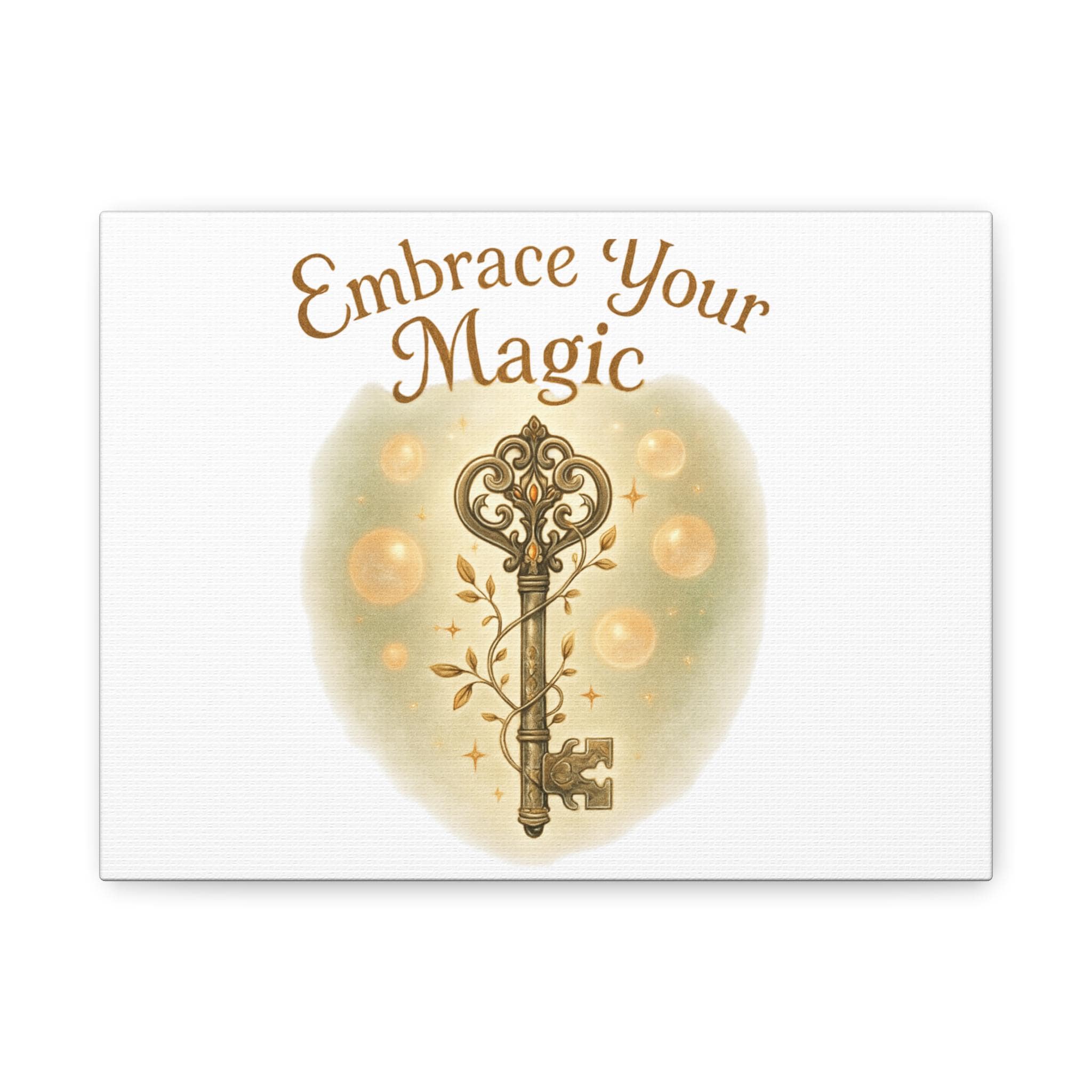 Warm, whimsical wall art that invites a quiet pause. This stretched matte canvas features an antique key entwined with delicate vines and soft golden orbs, topped with the gentle phrase “Embrace Your Magic.” The muted cream and gold palette blends vintage charm with modern minimalism, making it an unobtrusive focal point in a bedroom, reading nook, or creative studio. Printed with UL-certified Greenguard Gold inks on a cotton-poly composite, the image keeps its soft, painterly look without glare. Stretched over a sustainably sourced pine frame and finished with soft rubber dots and a back-hanging system, it arrives ready to display and hold its place on the wall.