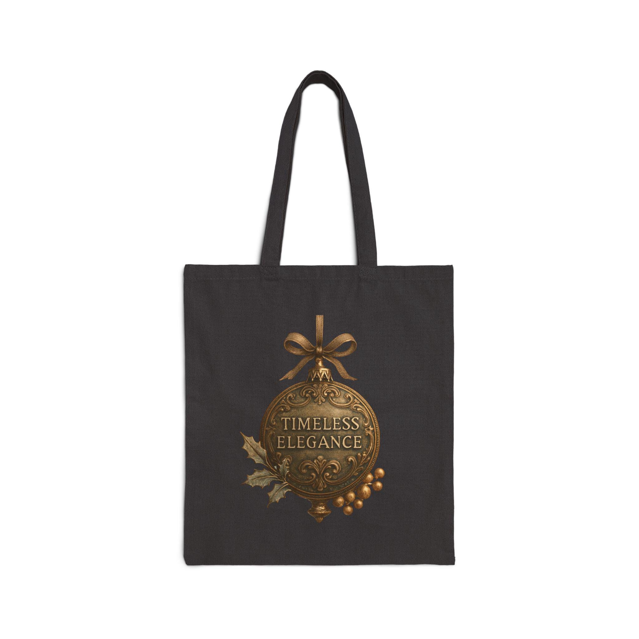 This sturdy cotton canvas tote brings a little vintage holiday charm to everyday errands. The heavy 12 oz fabric feels substantial in hand and holds shape—flat corners give it a clean, structured silhouette that slides easily onto the shoulder. On the front, a warm bronze ornament graphic with delicate holly and a tied bow reads “Timeless Elegance,” lending a nostalgic, handcrafted look that pairs well with slow mornings, market runs, or cozy seasonal gatherings. The reinforced self-fabric handles stand up to frequent use, and the neutral natural or black base keeps the design grounded and wearable year after year. It’s the kind of bag someone reaches for when they want a quiet, classic accent to their day: carrying groceries, books, or a picnic blanket with effortless, low-key style.