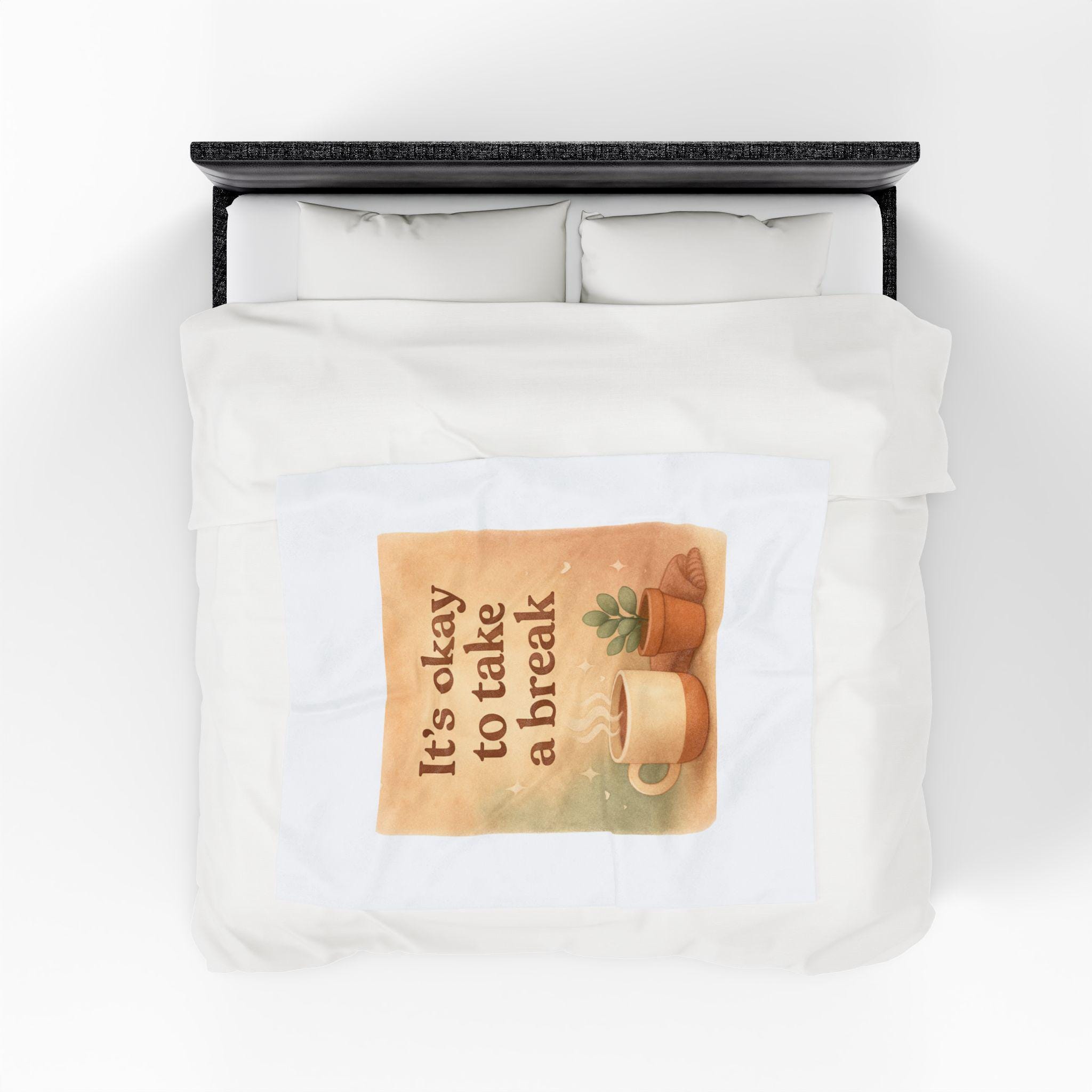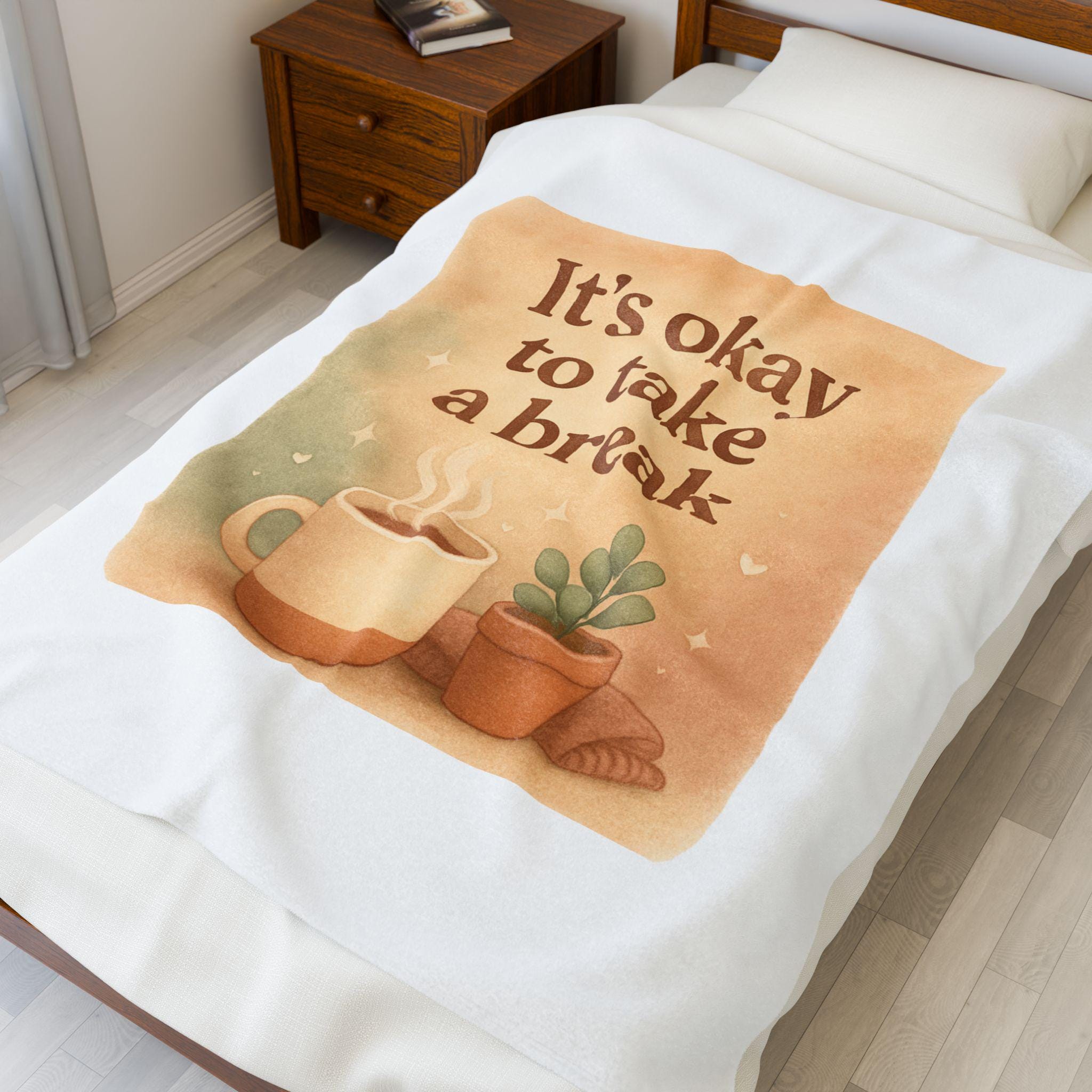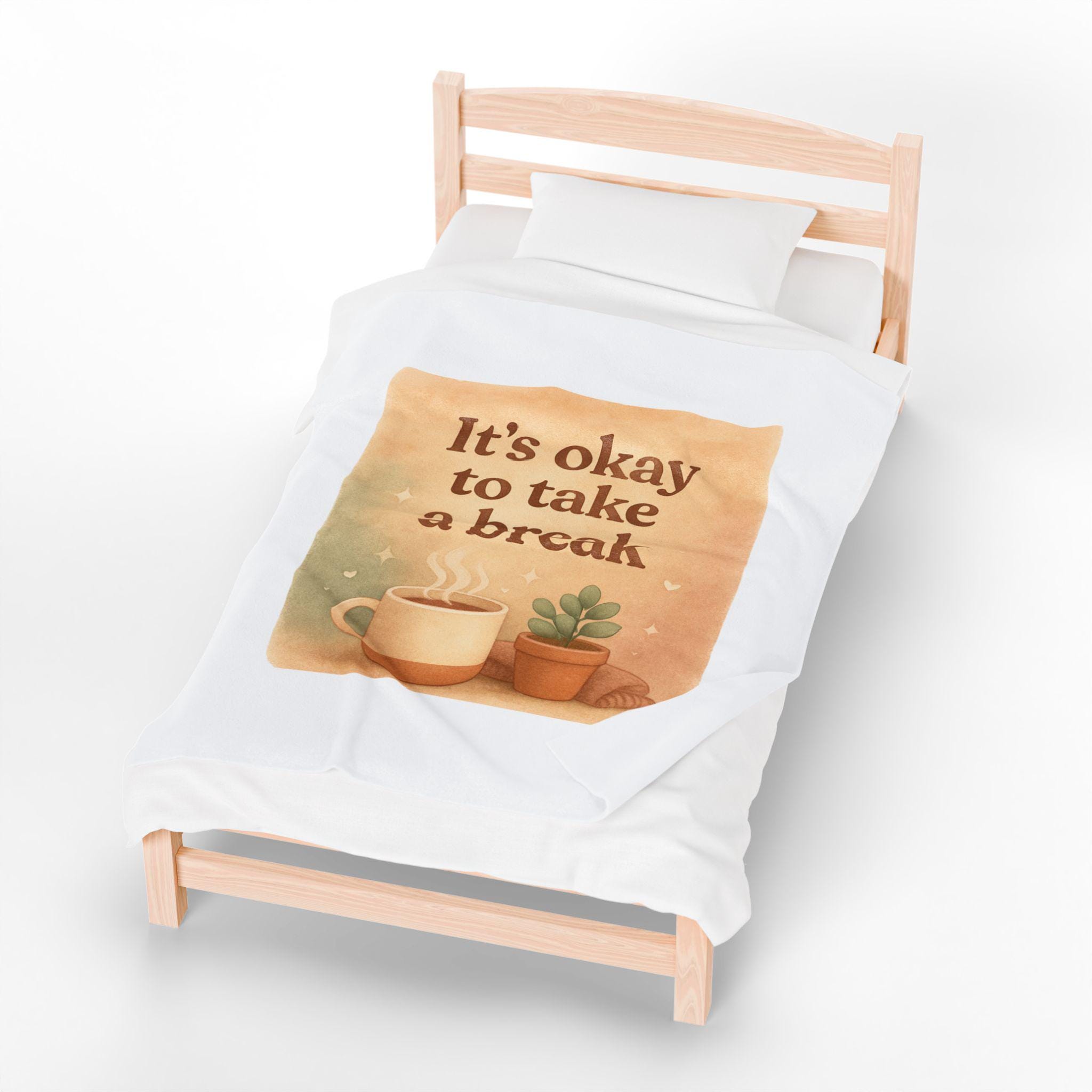 Wrap yourself in a quiet moment. This plush velveteen blanket carries a gentle reminder—"It’s Okay to Take a Break"—framed by steaming coffee and a low-light succulent. The soft, medium-weight fabric settles around your shoulders like a pause: warm, calming, and unexpectedly supportive when the day tips toward too much. It lives on the sofa, draped over a reading chair, or folded at the foot of the bed, ready to hush notifications and invite a slow breath. For anyone who keeps a careful schedule or craves a little domestic calm, this blanket feels like permission to rest—subtle, sincere, and handcrafted in the way it holds color and texture. The printed side keeps the message bright and clear, while the velveteen pile stays plush against skin. Bring one to a late-night work session, a rainy morning with coffee, or a quiet weekend of plant care; it’s the kind of textile that understands small rituals and makes them sweeter.