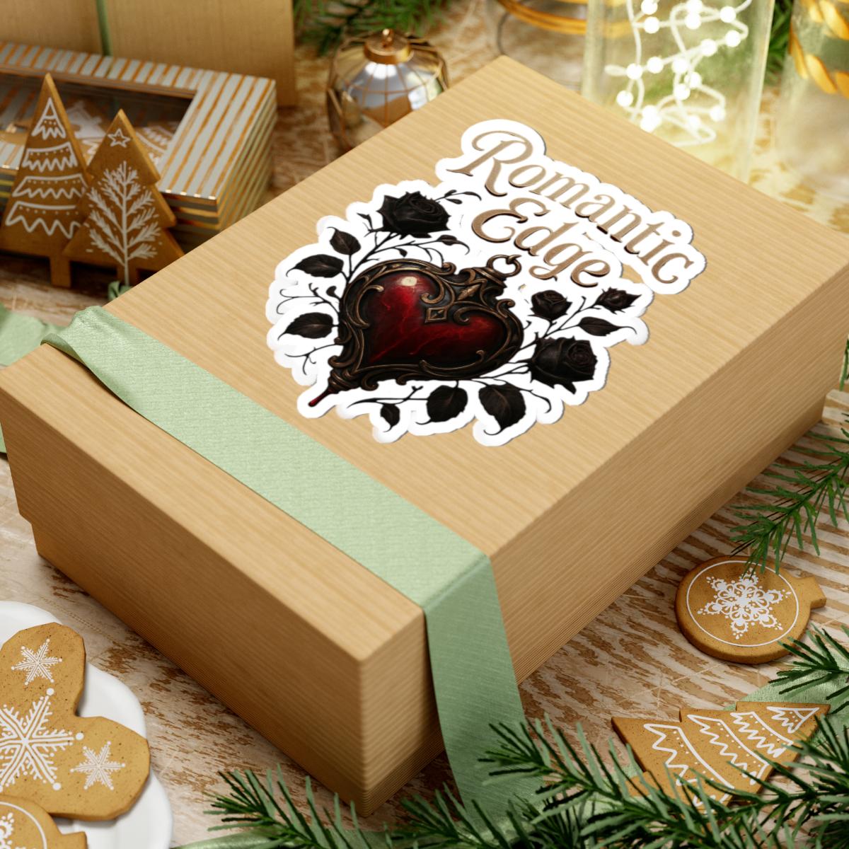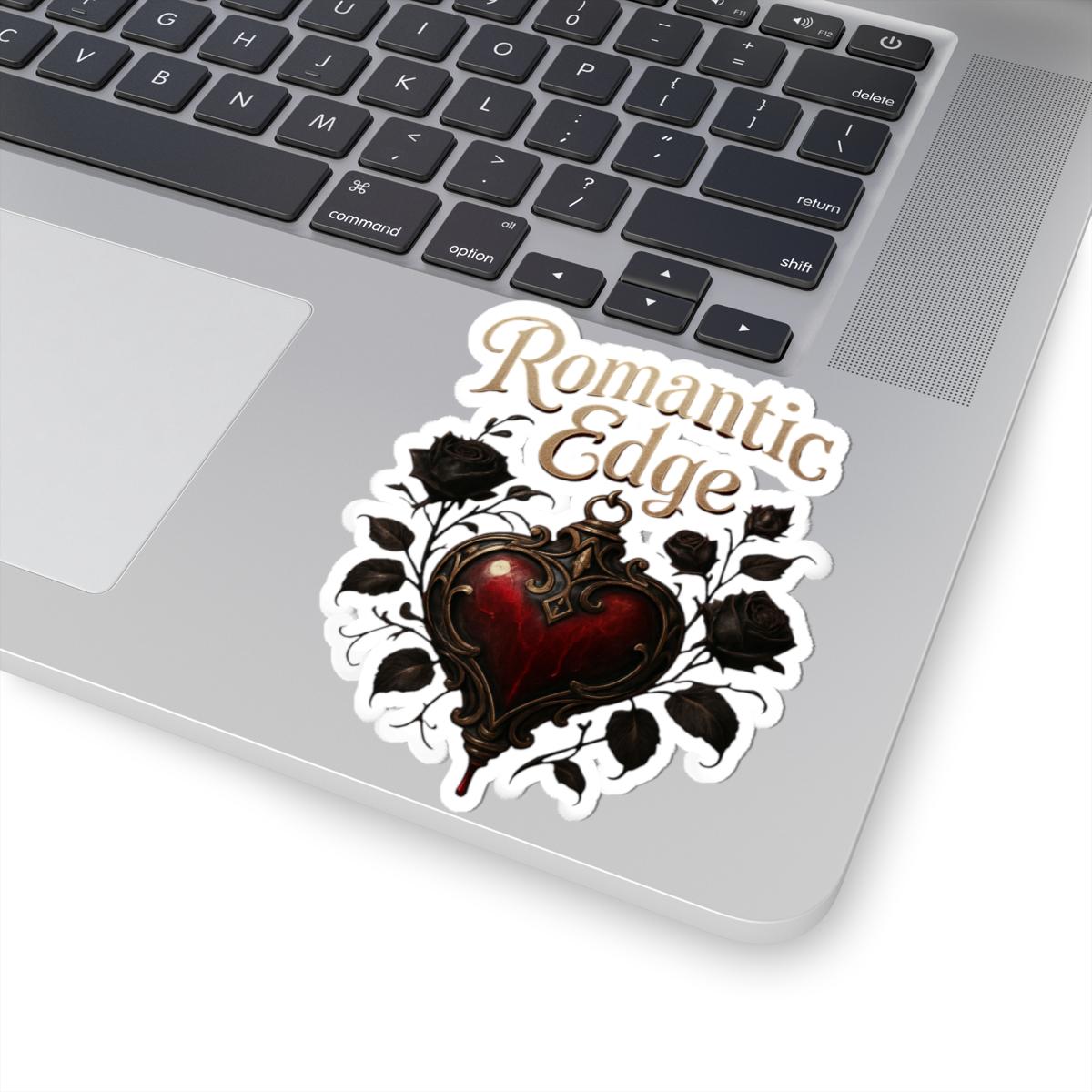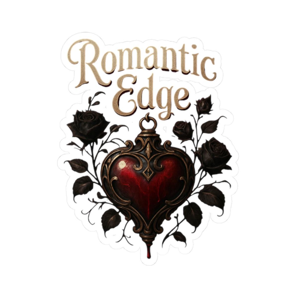 A glossy kiss-cut sticker that brings a dark-romantic vibe to everyday items. The design centers on an ornate, blood-red heart framed by black roses and curling filigree, topped with the flowing script ‘Romantic Edge’. Printed in vivid, eco-solvent inks on durable vinyl, this sticker adds moody, antique charm to laptops, journals, water bottles, and window panes. The glossy finish accentuates deep reds and rich blacks while the permanent acrylic adhesive keeps it firmly in place on smooth, flat surfaces. Choose white or transparent backing and from four sizes to suit your style — a small detail that transforms ordinary surfaces into a statement of gothic elegance.