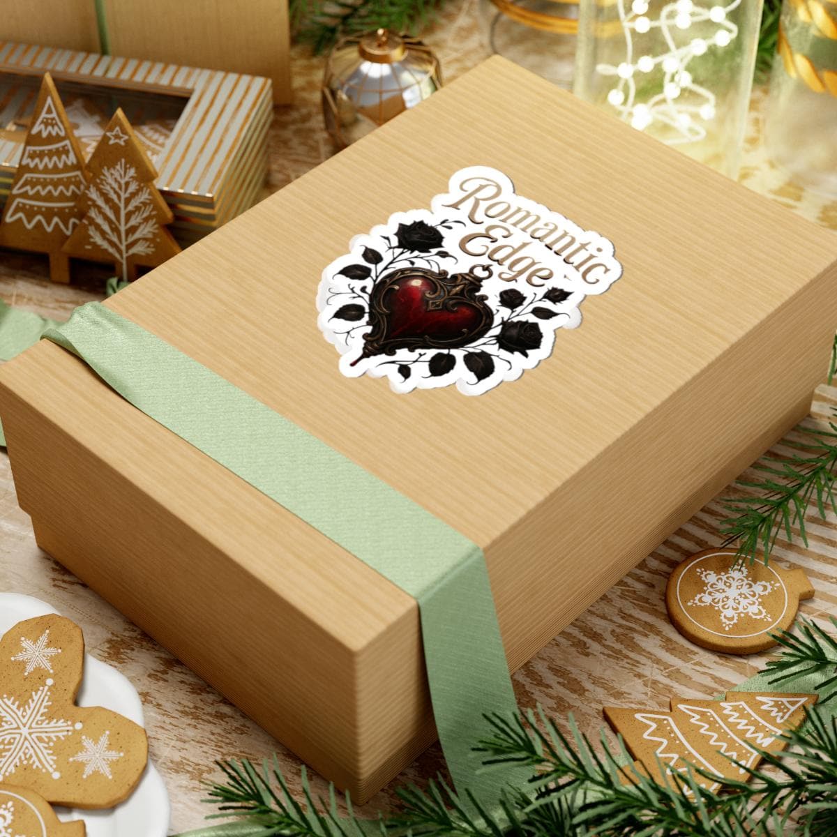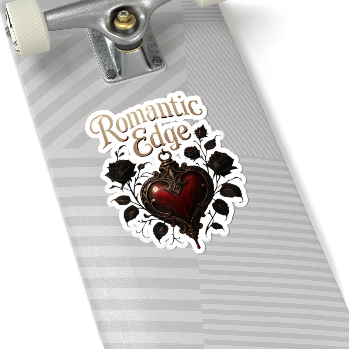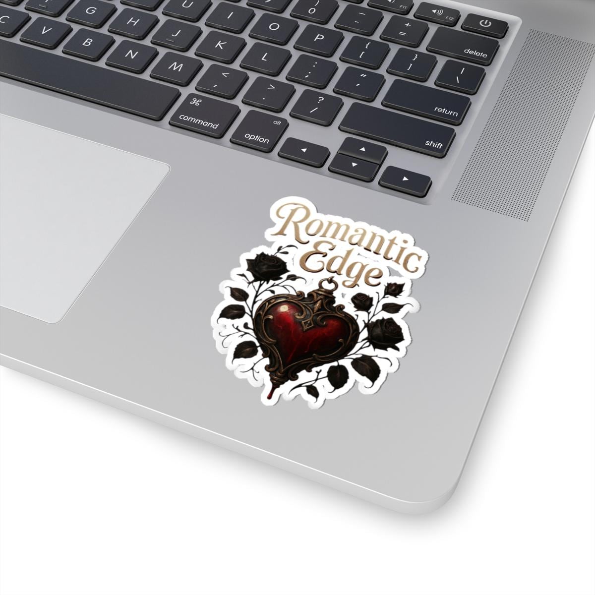 A glossy kiss-cut sticker that brings a dark-romantic vibe to everyday items. The design centers on an ornate, blood-red heart framed by black roses and curling filigree, topped with the flowing script ‘Romantic Edge’. Printed in vivid, eco-solvent inks on durable vinyl, this sticker adds moody, antique charm to laptops, journals, water bottles, and window panes. The glossy finish accentuates deep reds and rich blacks while the permanent acrylic adhesive keeps it firmly in place on smooth, flat surfaces. Choose white or transparent backing and from four sizes to suit your style — a small detail that transforms ordinary surfaces into a statement of gothic elegance.