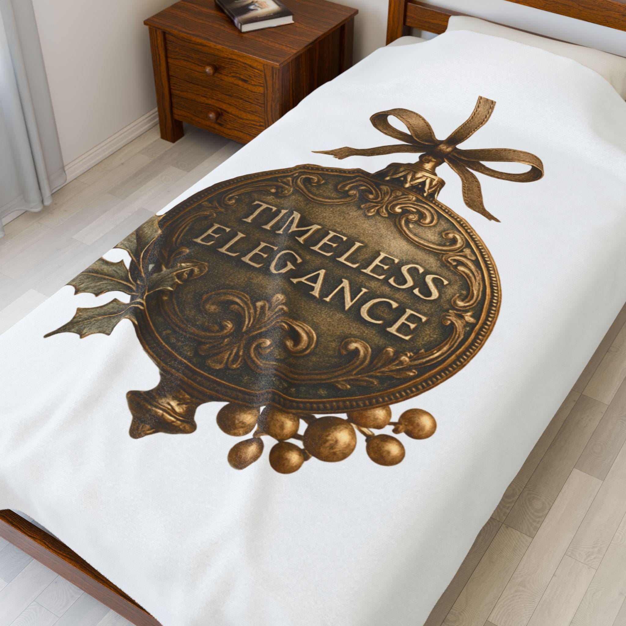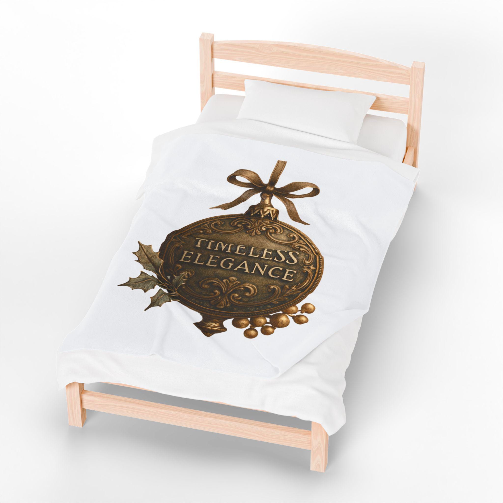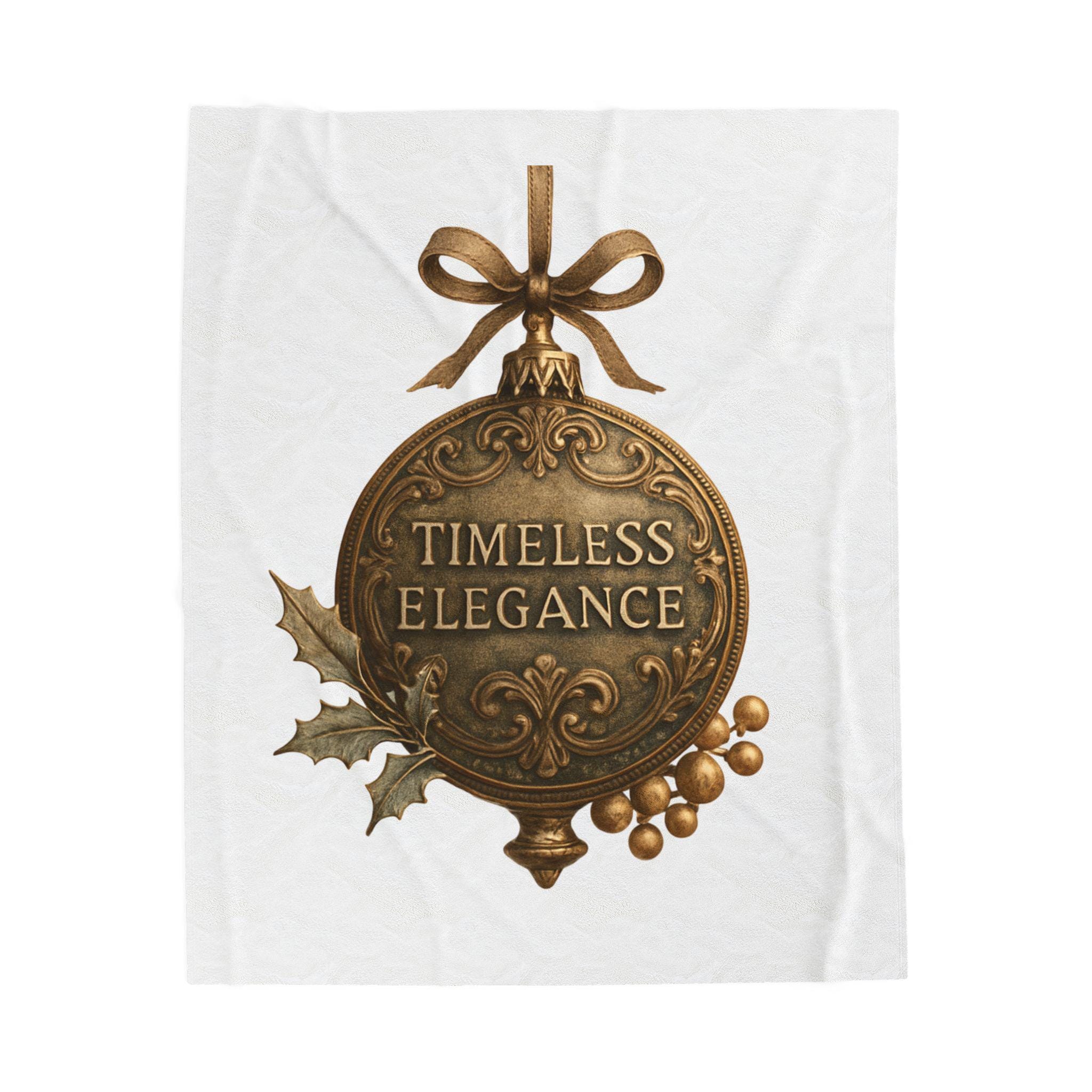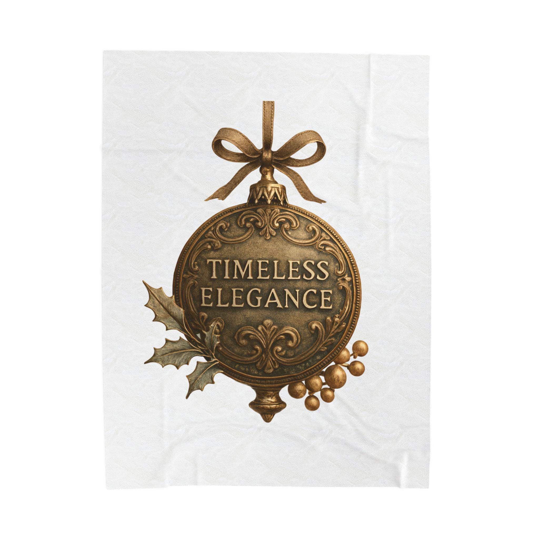 Soft, velvety, and luxuriously warm — this plush blanket wraps you in a quiet, vintage holiday mood. The printed ornament motif reads “Timeless Elegance” in an antique-brass finish, accented with holly leaves and berries and tied with a satin bow. Lightweight but substantial, the fabric drapes smoothly over laps and couches, turning an ordinary evening into a cozy, nostalgic moment. Keep it on the arm of your favorite chair for guests, unfold it across your knees while reading by lamplight, or layer it over bedding for a subtle seasonal touch.