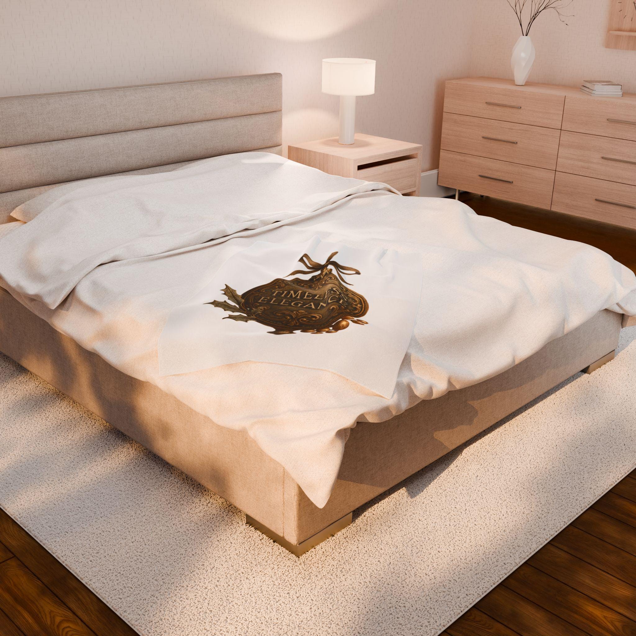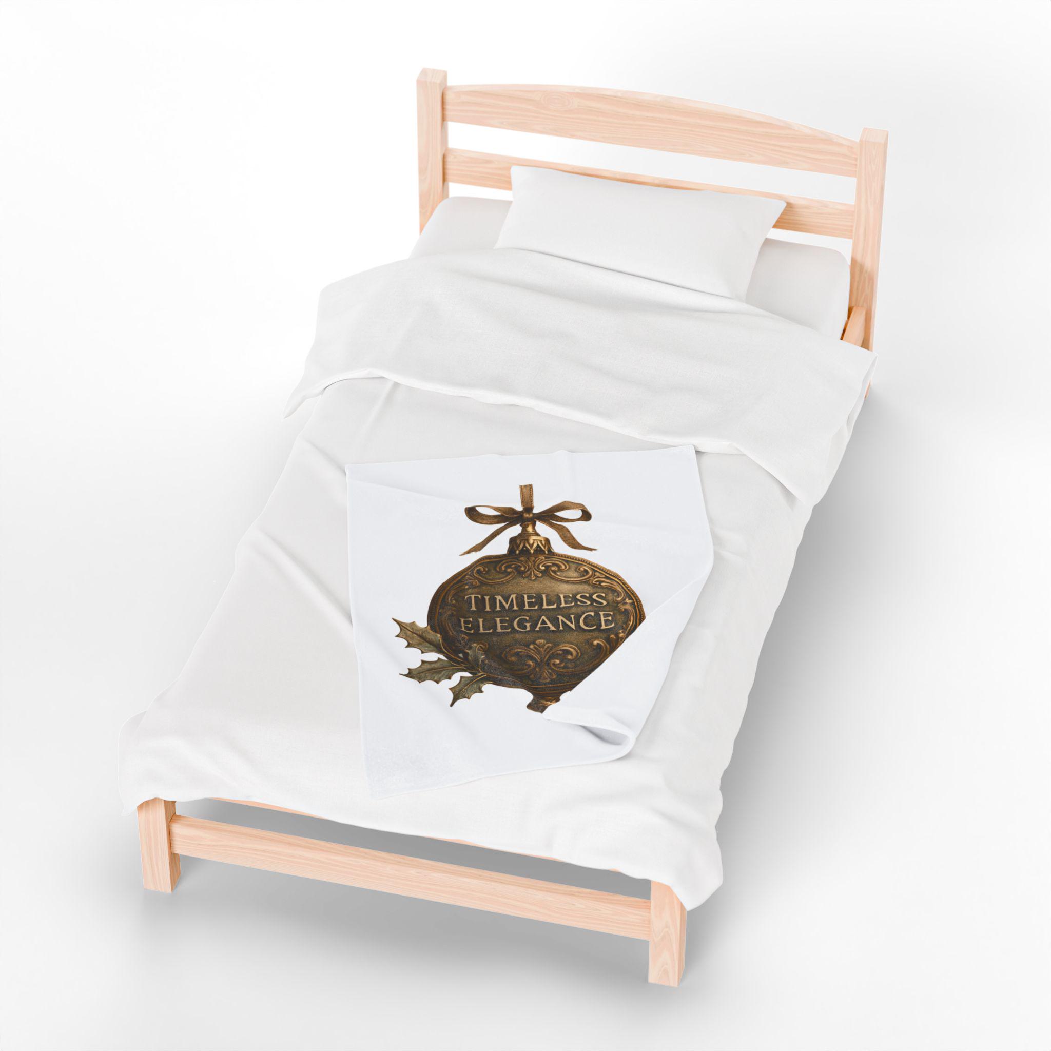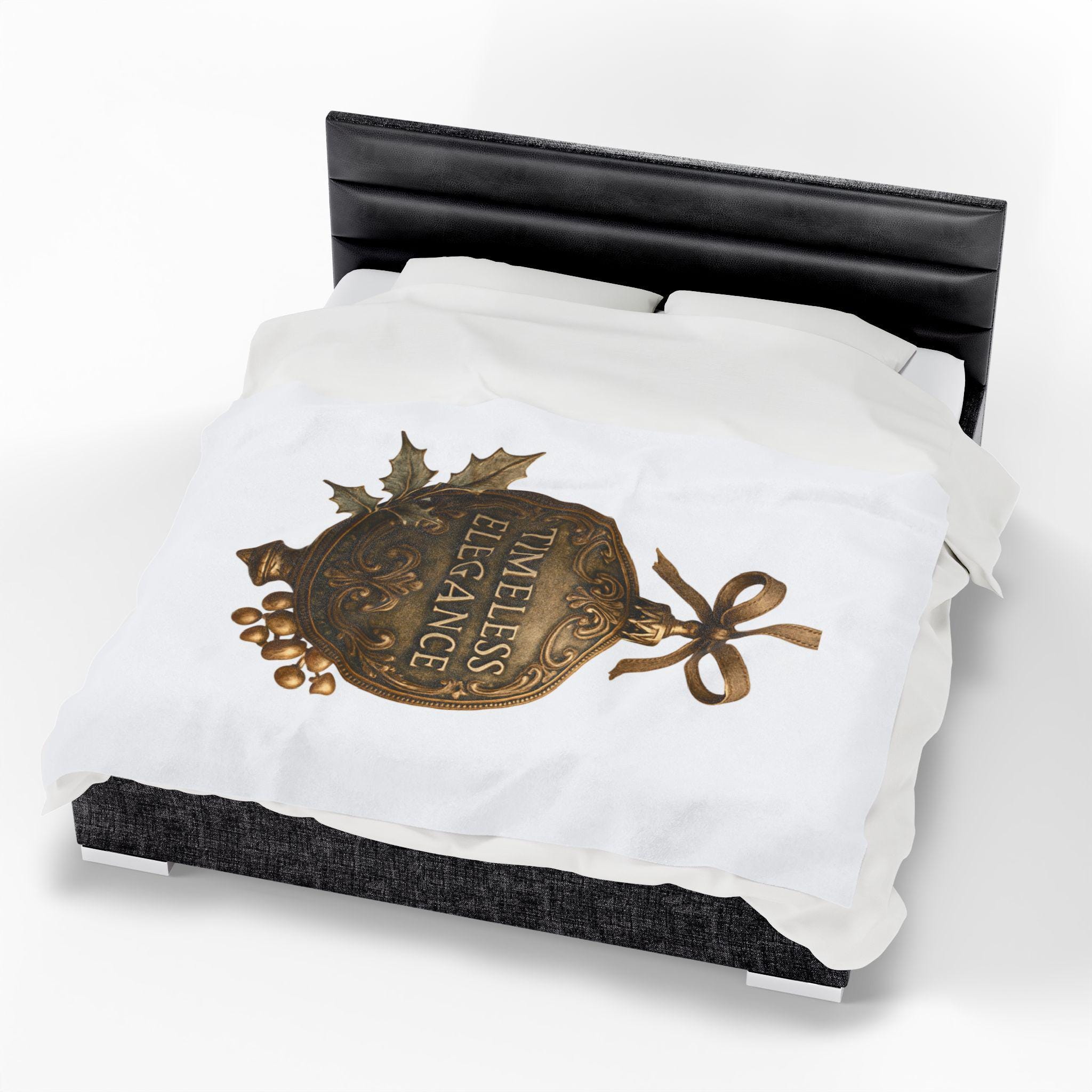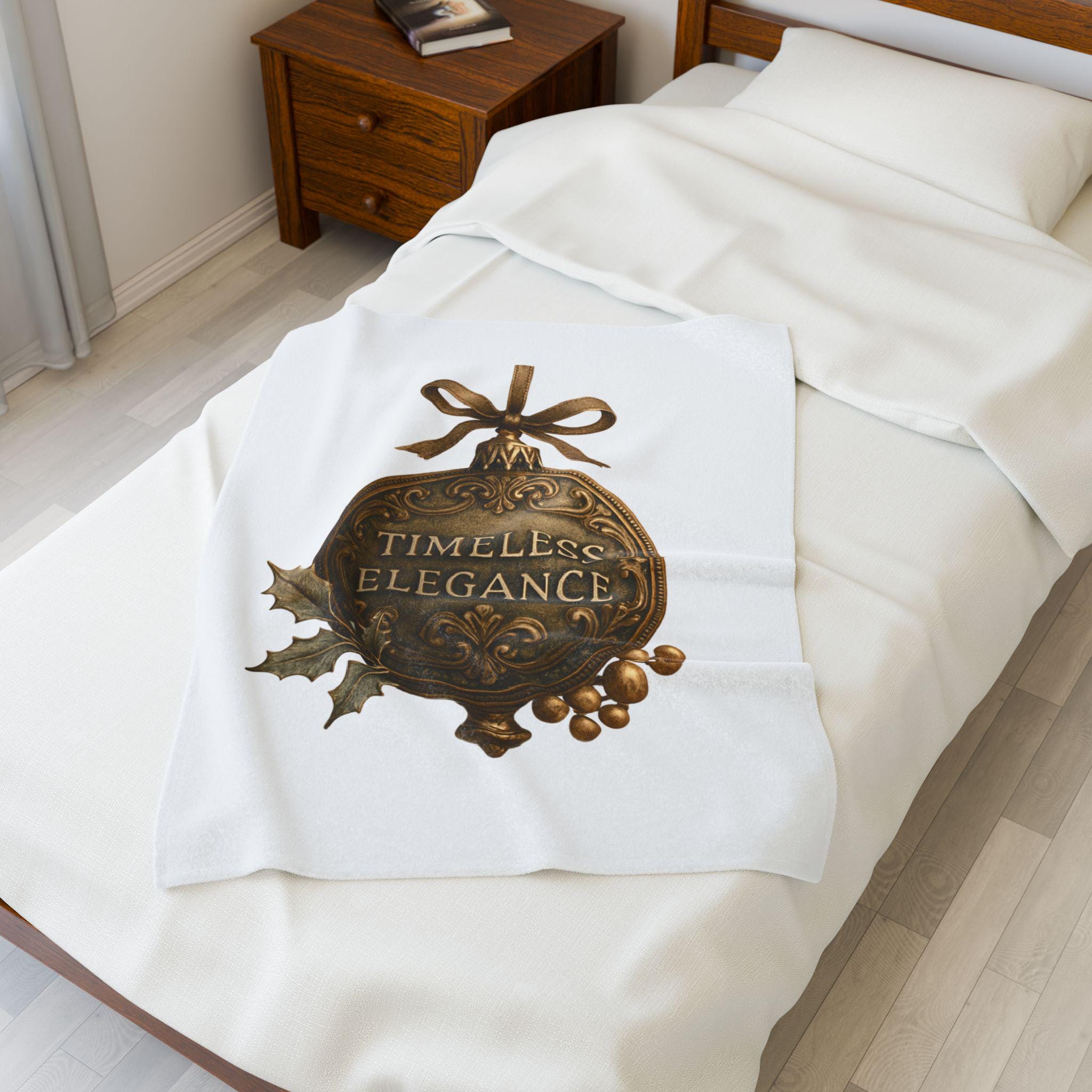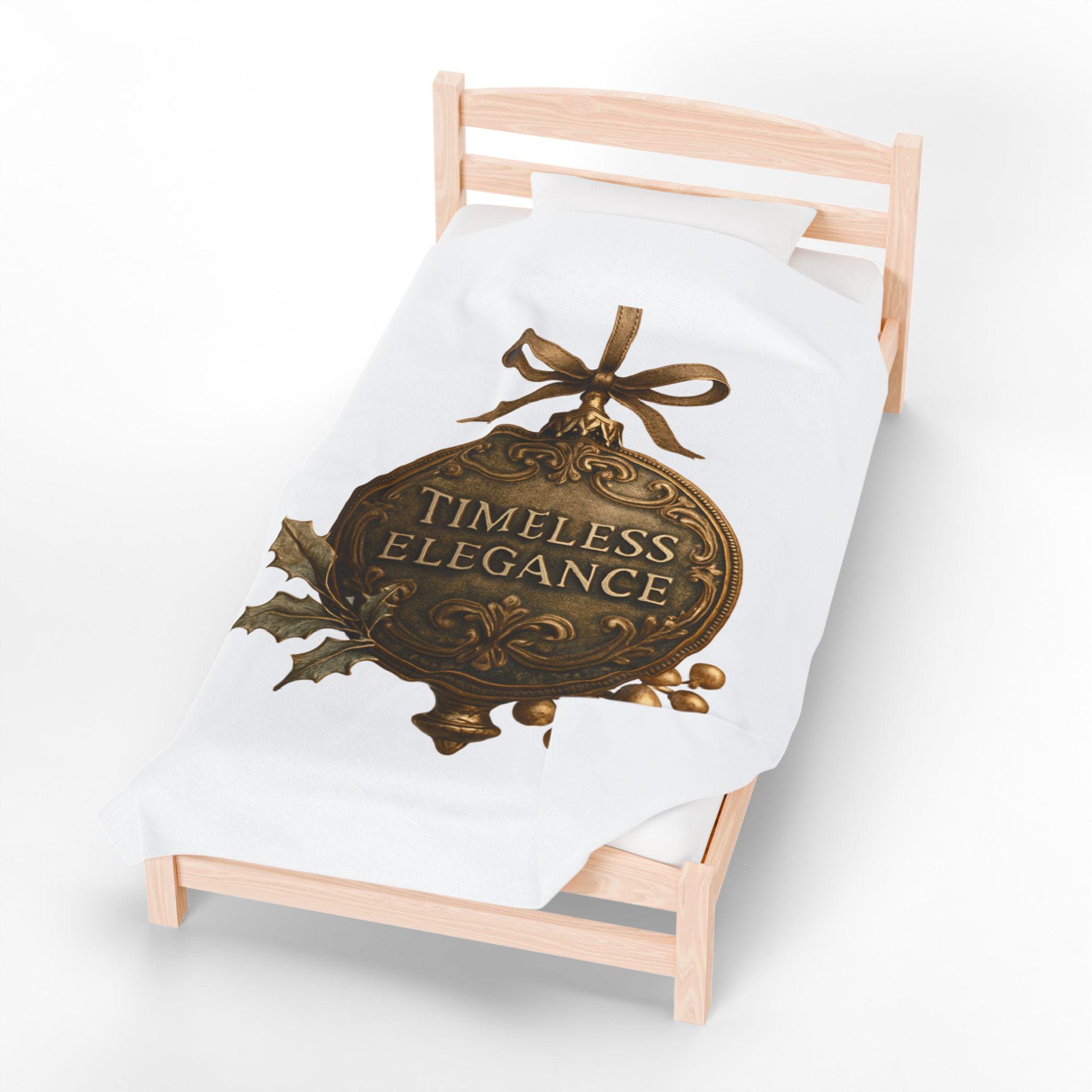 Soft, velvety, and luxuriously warm — this plush blanket wraps you in a quiet, vintage holiday mood. The printed ornament motif reads “Timeless Elegance” in an antique-brass finish, accented with holly leaves and berries and tied with a satin bow. Lightweight but substantial, the fabric drapes smoothly over laps and couches, turning an ordinary evening into a cozy, nostalgic moment. Keep it on the arm of your favorite chair for guests, unfold it across your knees while reading by lamplight, or layer it over bedding for a subtle seasonal touch.