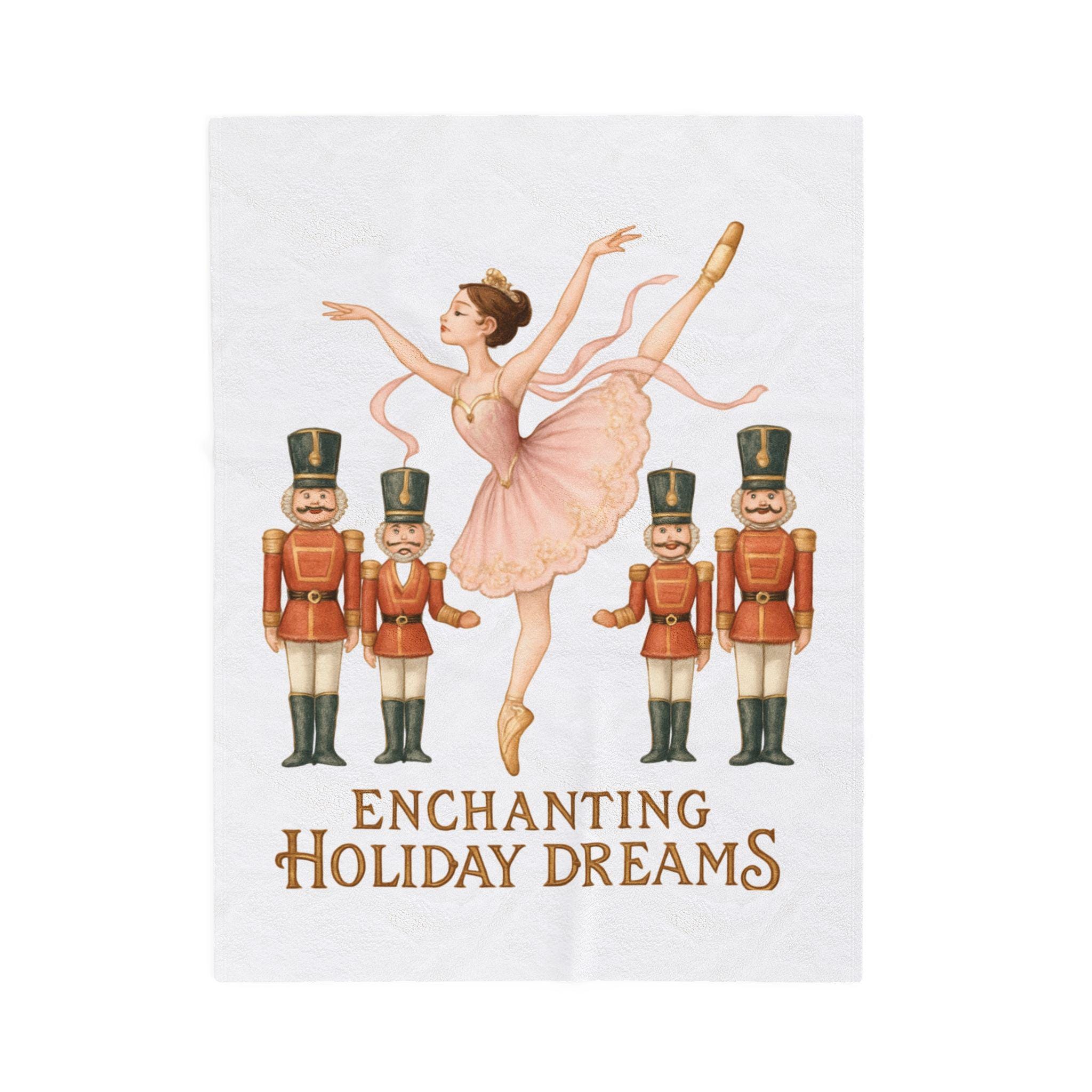 A velvety, nostalgic throw that brings a quiet moment of holiday magic to your living room. Soft and medium-weight, this plush blanket features a vintage-style ballerina and nutcracker illustration with the words “Enchanting Holiday Dreams” in warm, aged lettering. Drape it over the back of a sofa, tuck it around your shoulders during a late-night carol session, or lay it across a guest bed to add a gentle, storybook charm to the season. The single-side, high-detail print keeps the artwork vivid while the fabric stays pill-resistant and soothing against the skin. It’s the kind of blanket that makes slow evenings feel ceremonious and small traditions — reading a holiday story, unwrapping an ornament, sipping cocoa — feel quietly celebrated.