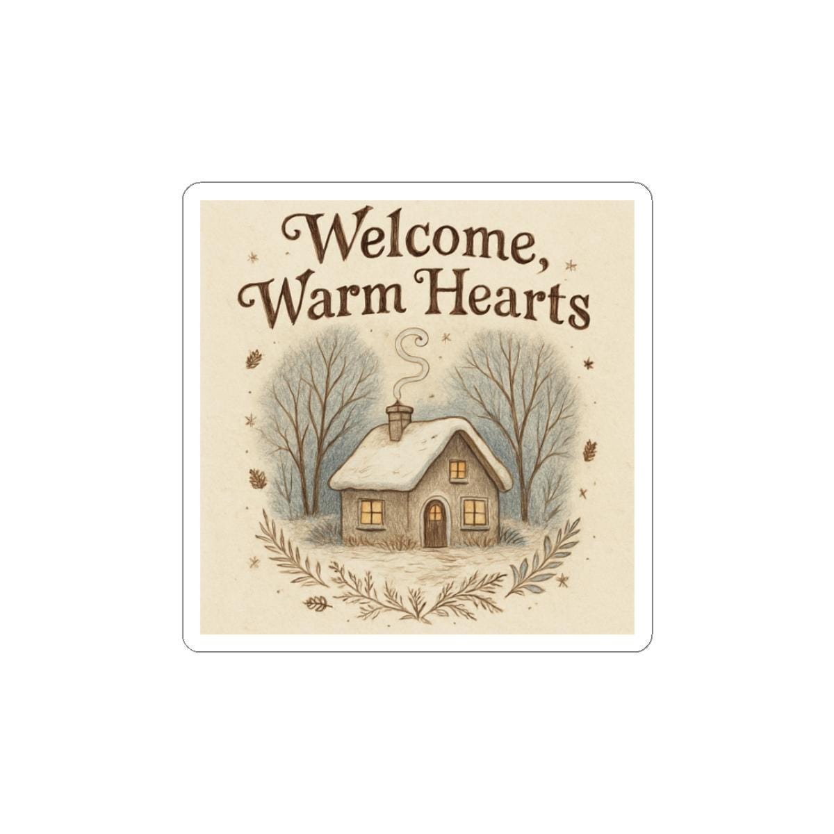 This glossy kiss-cut sticker brings a cozy, vintage winter scene into everyday life. A small snow-dusted cottage glows with warm light beneath the words “Welcome, Warm Hearts,” framed by gentle trees and delicate leaf flourishes. The muted beige and soft blue palette feels like a handwritten note from a welcoming home, adding a quiet, nostalgic touch to laptops, journals, windows, or any smooth surface. It sticks smoothly and stays put, brightening spaces with a handcrafted, hearthside charm that invites pause and comfort.