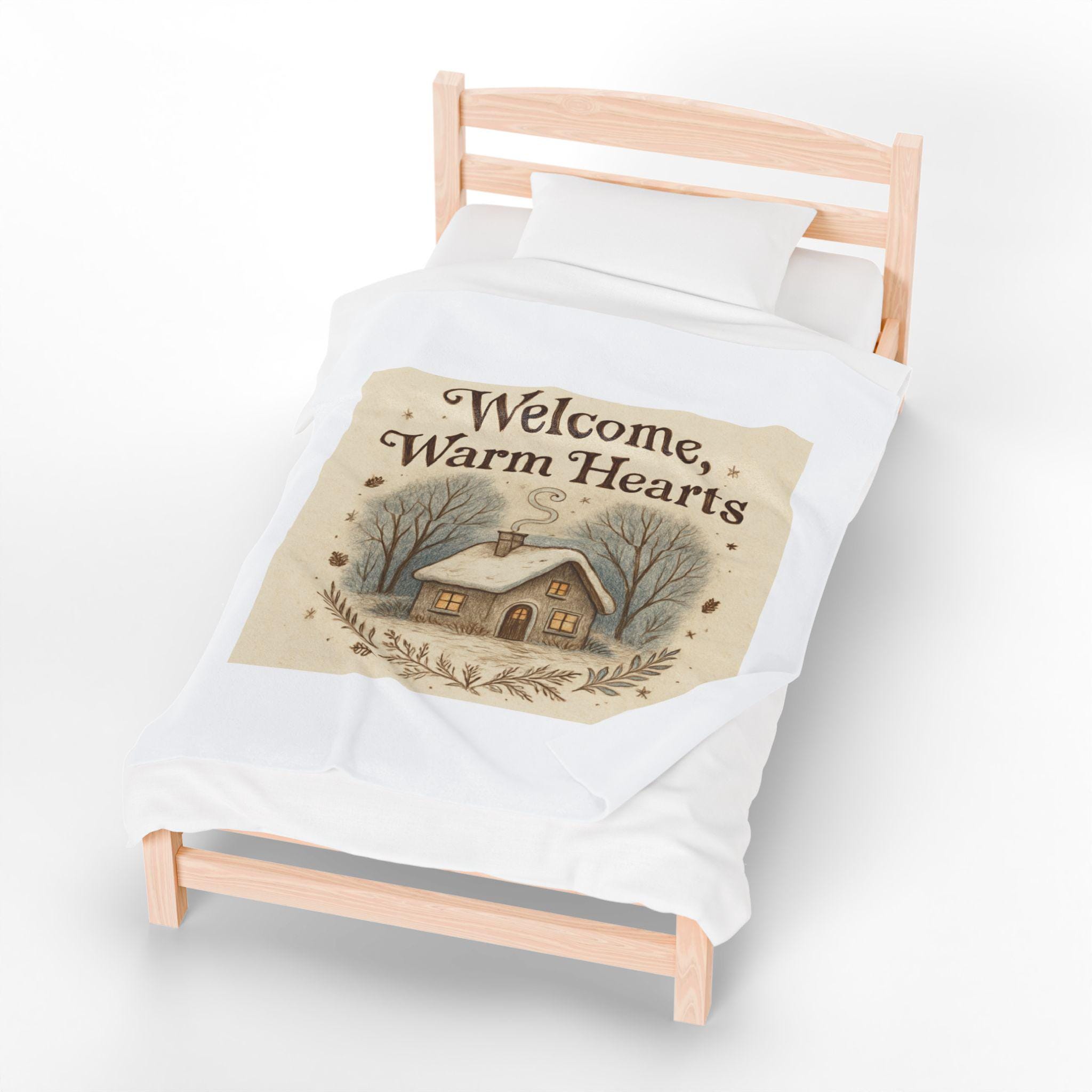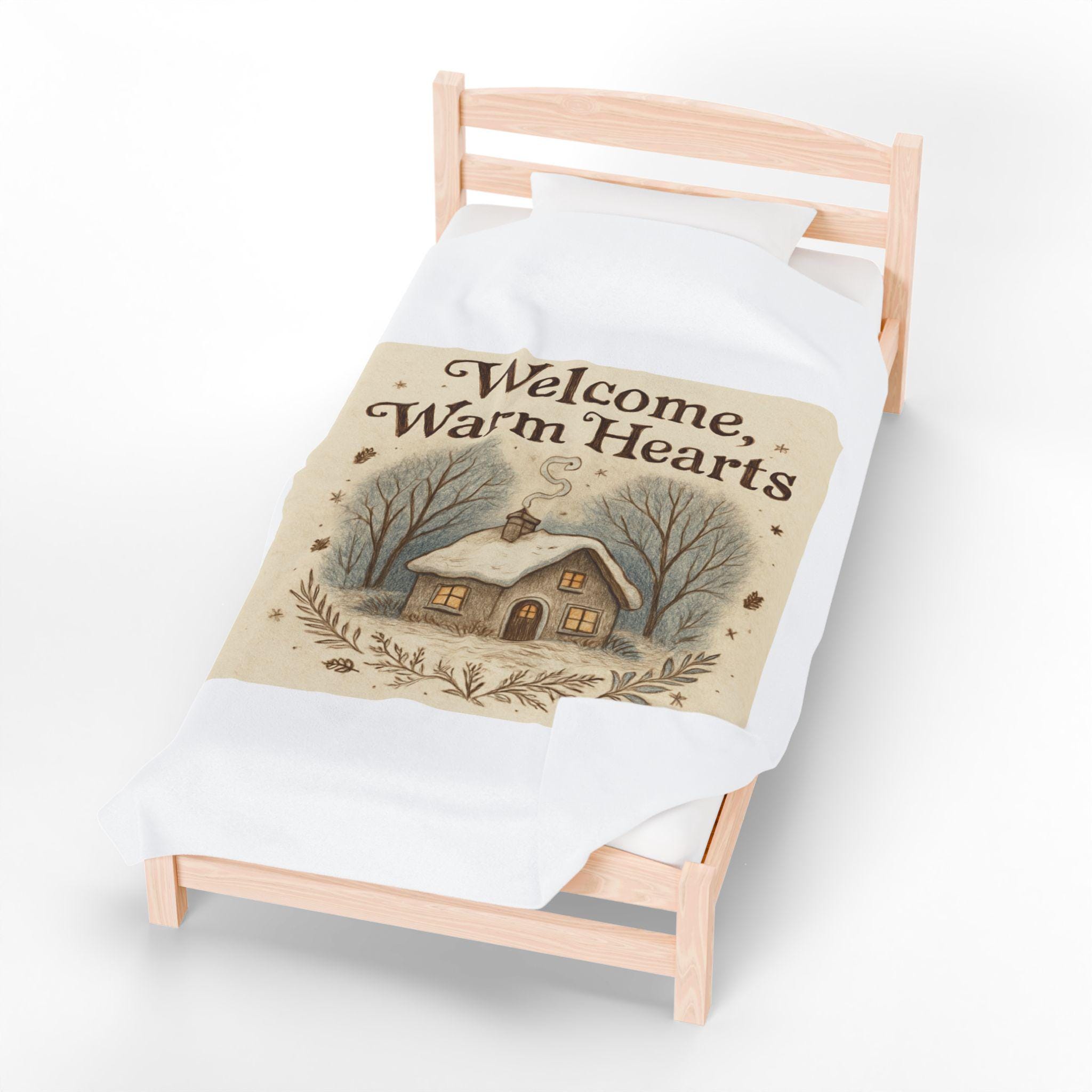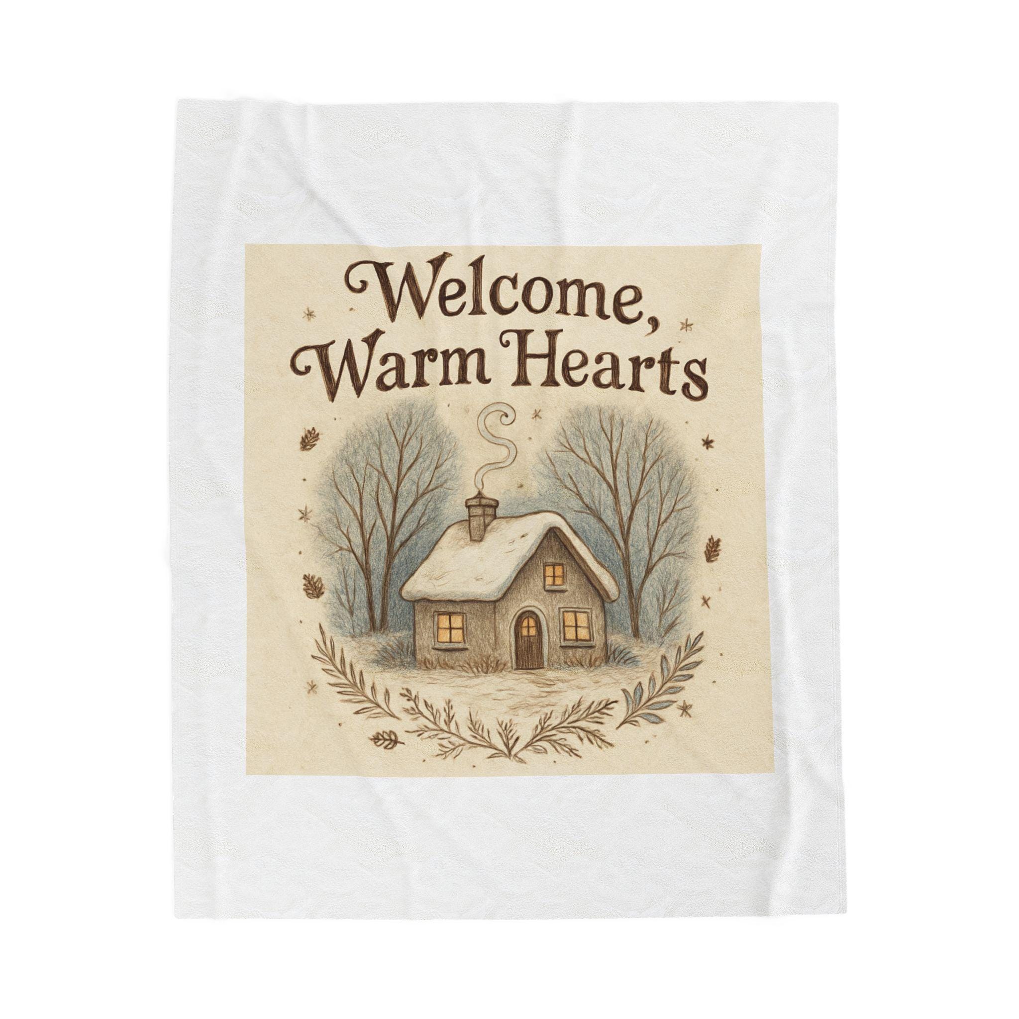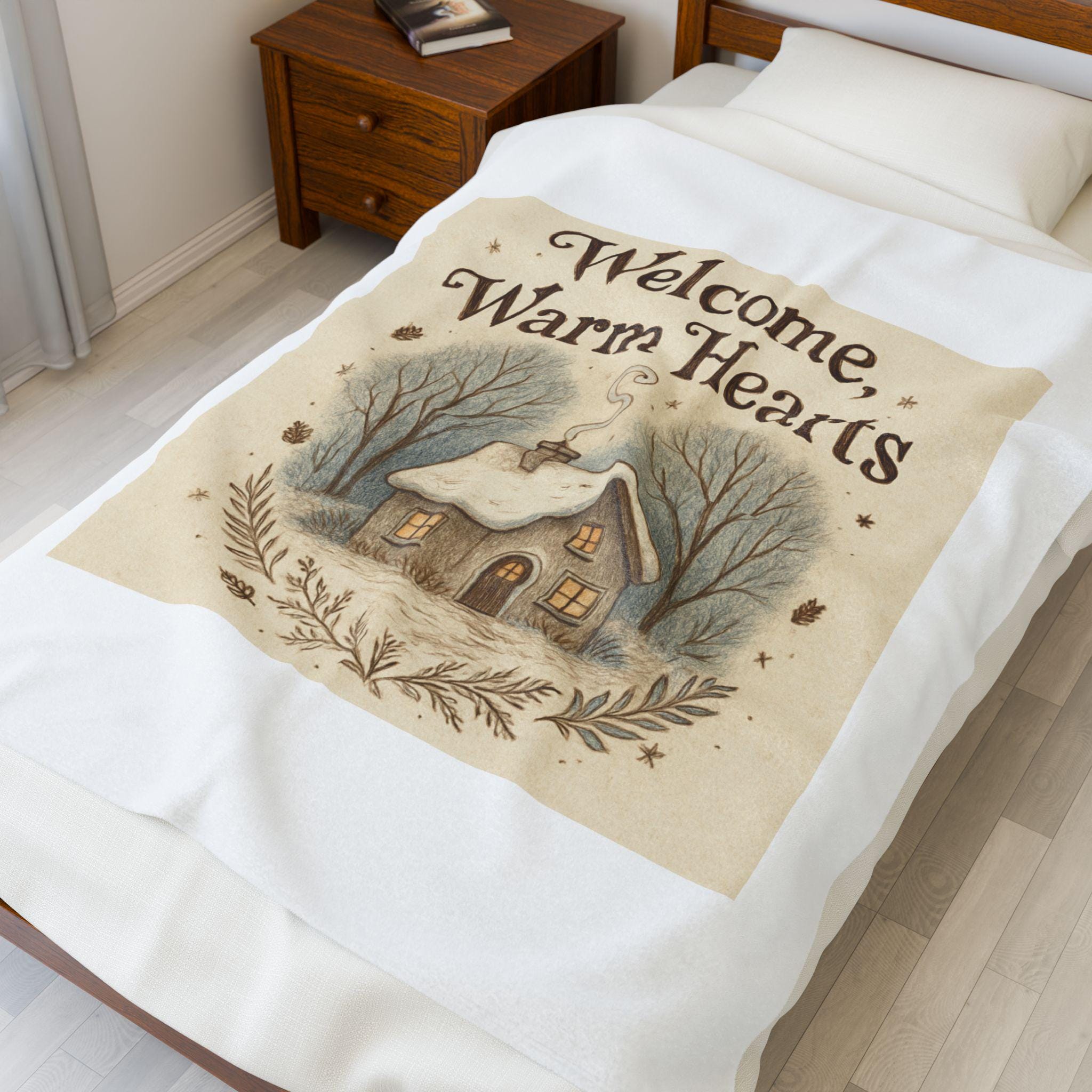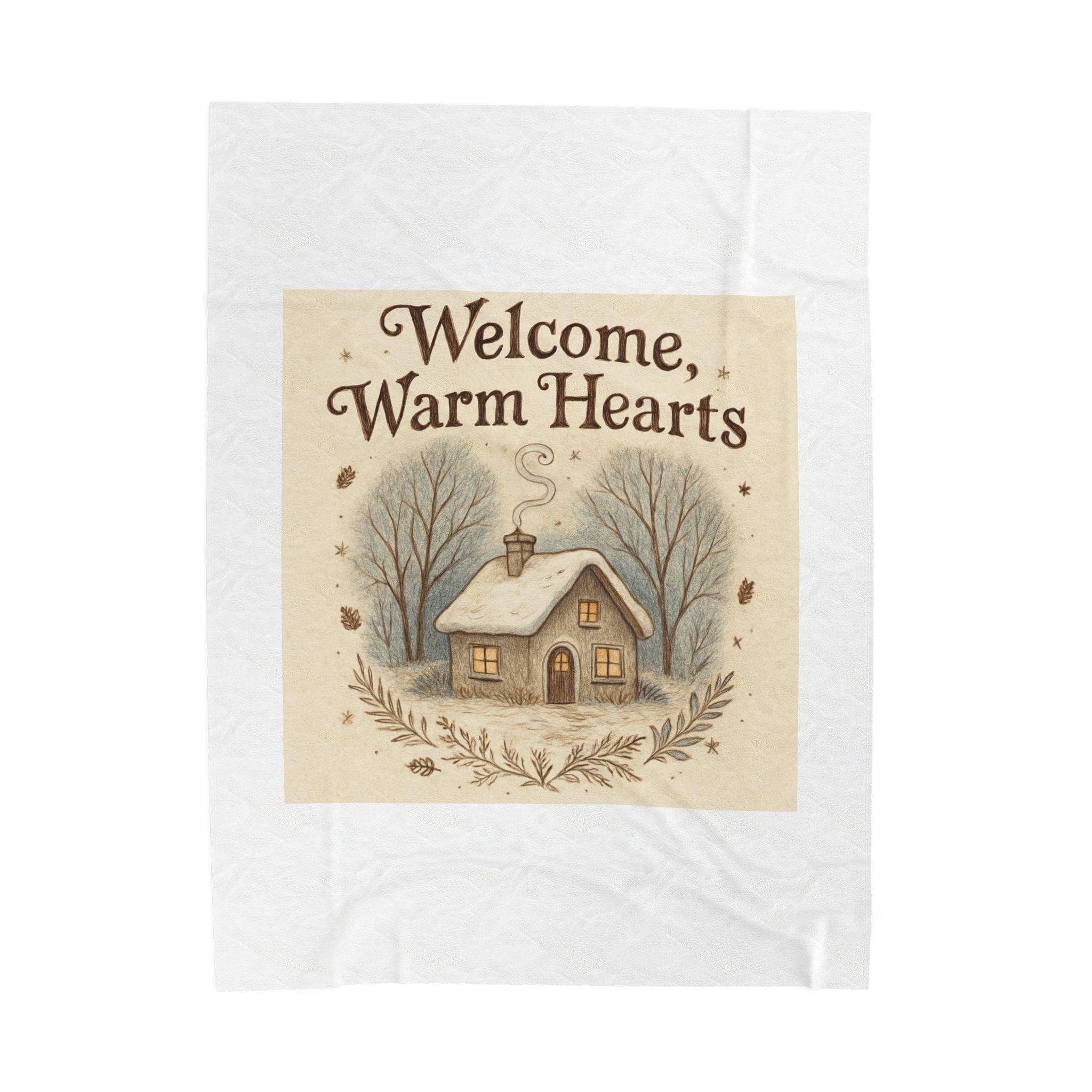 Welcome Warm Hearts cottage scene Velveteen Plush Blanket | cozy winter home decor