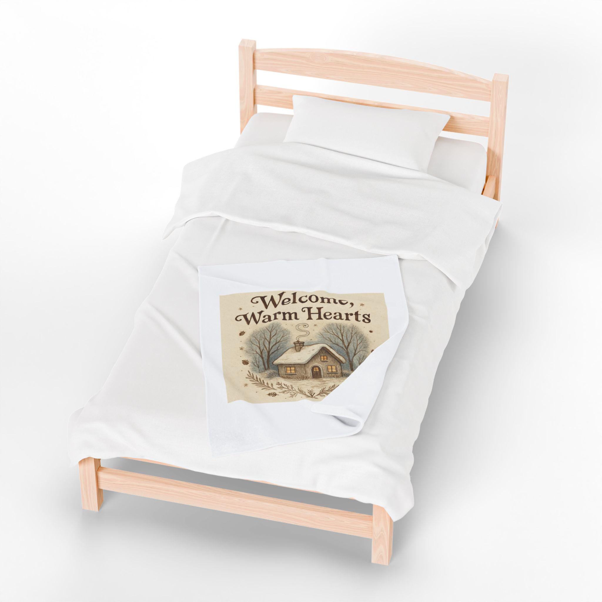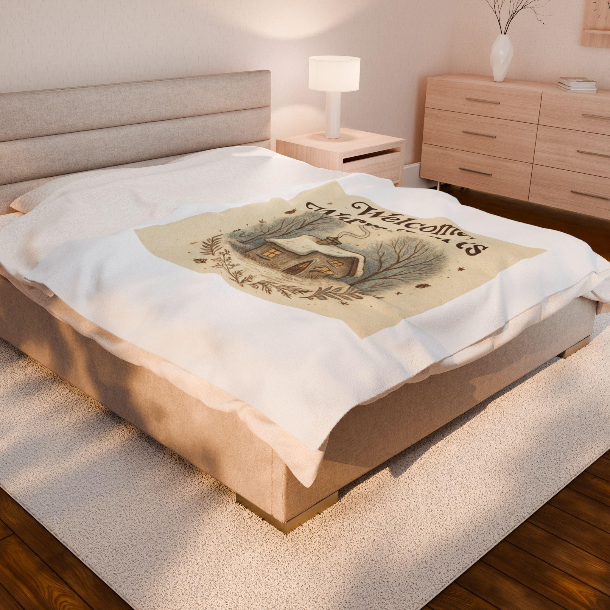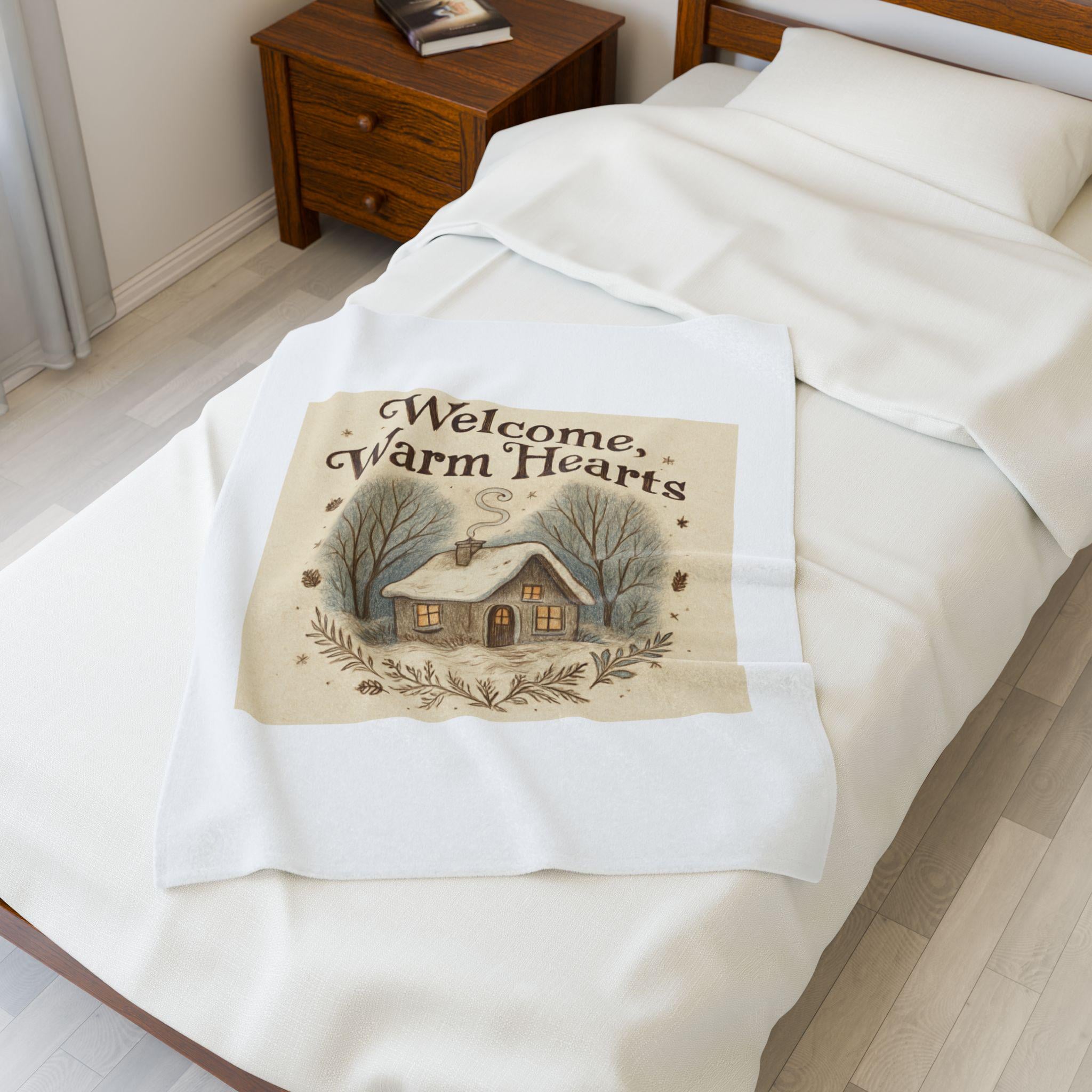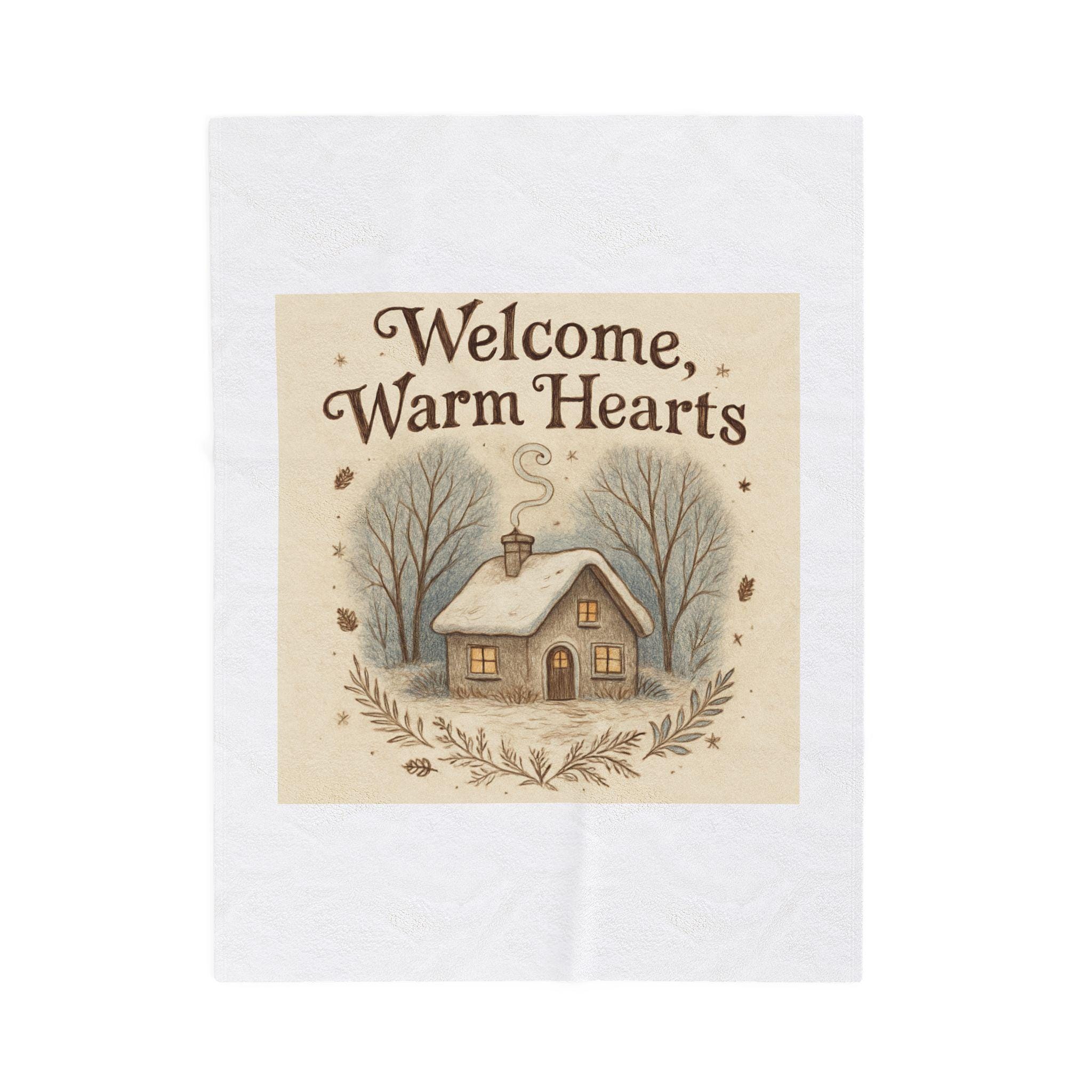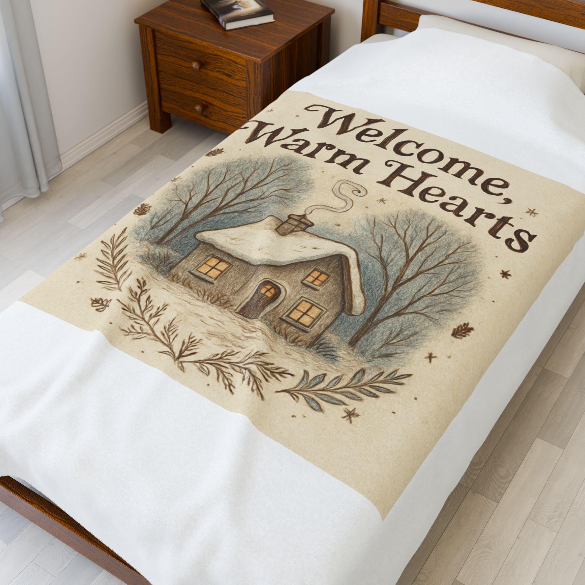 Welcome Warm Hearts cottage scene Velveteen Plush Blanket | cozy winter home decor