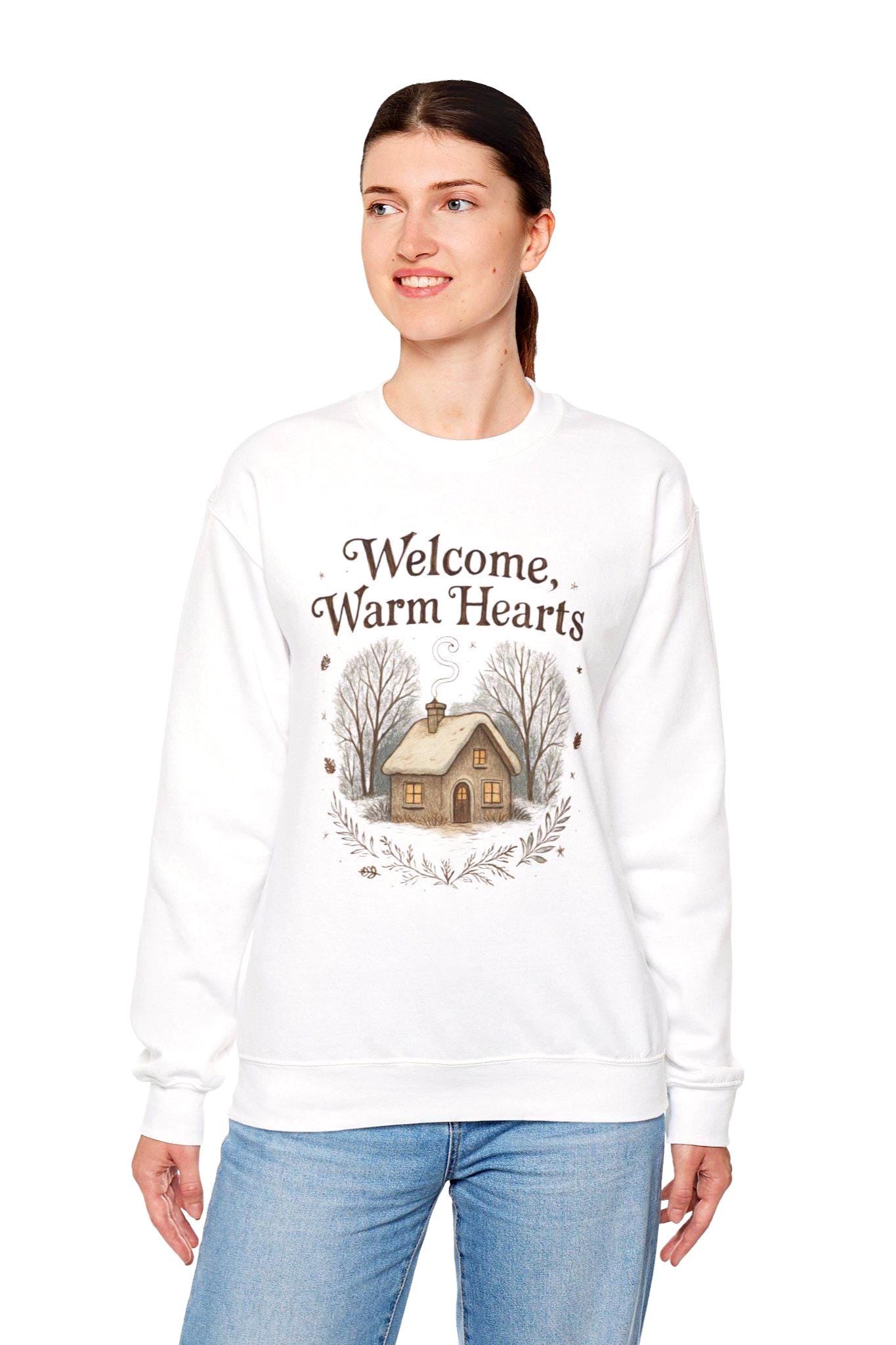Welcome Warm Hearts cabin illustration Sweatshirt | cozy winter cottage design