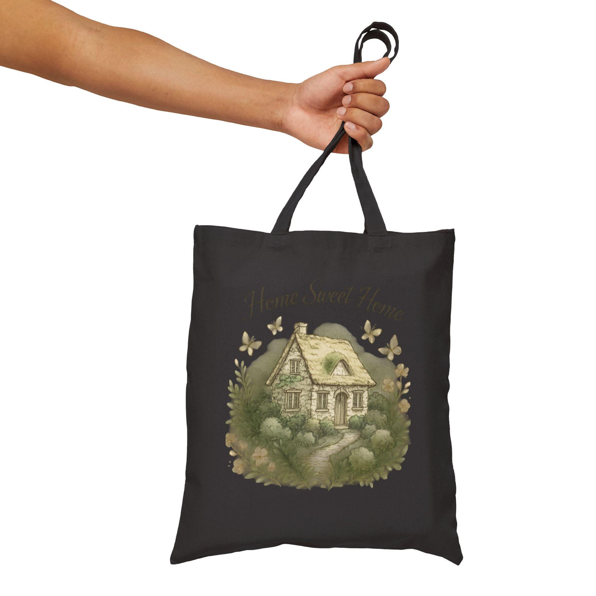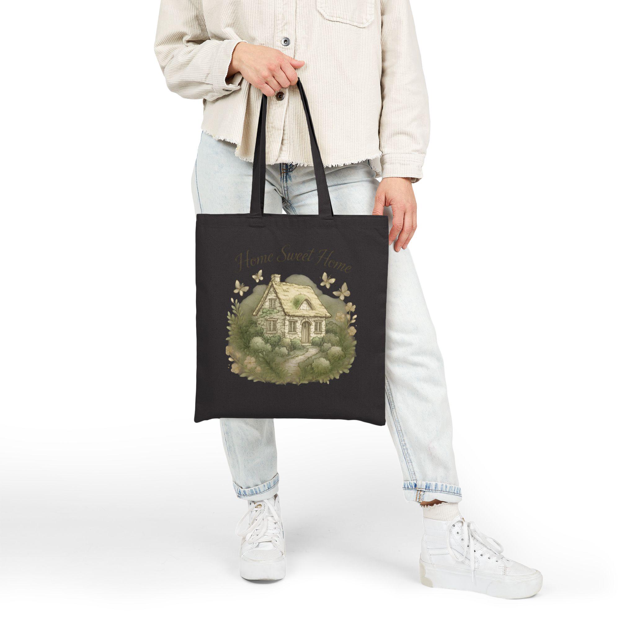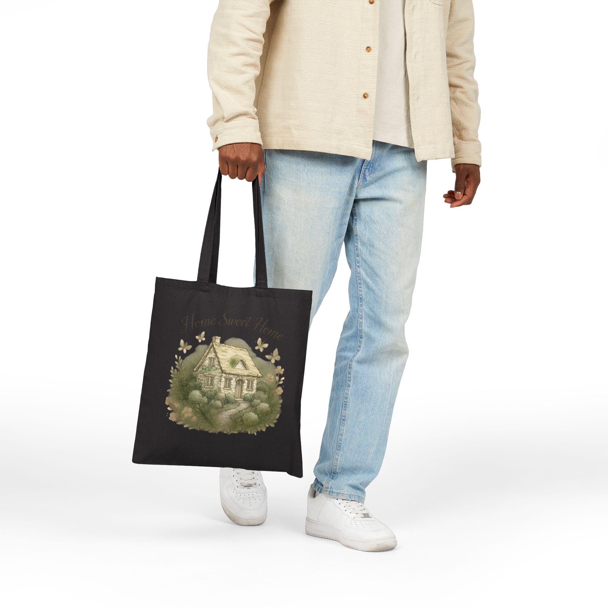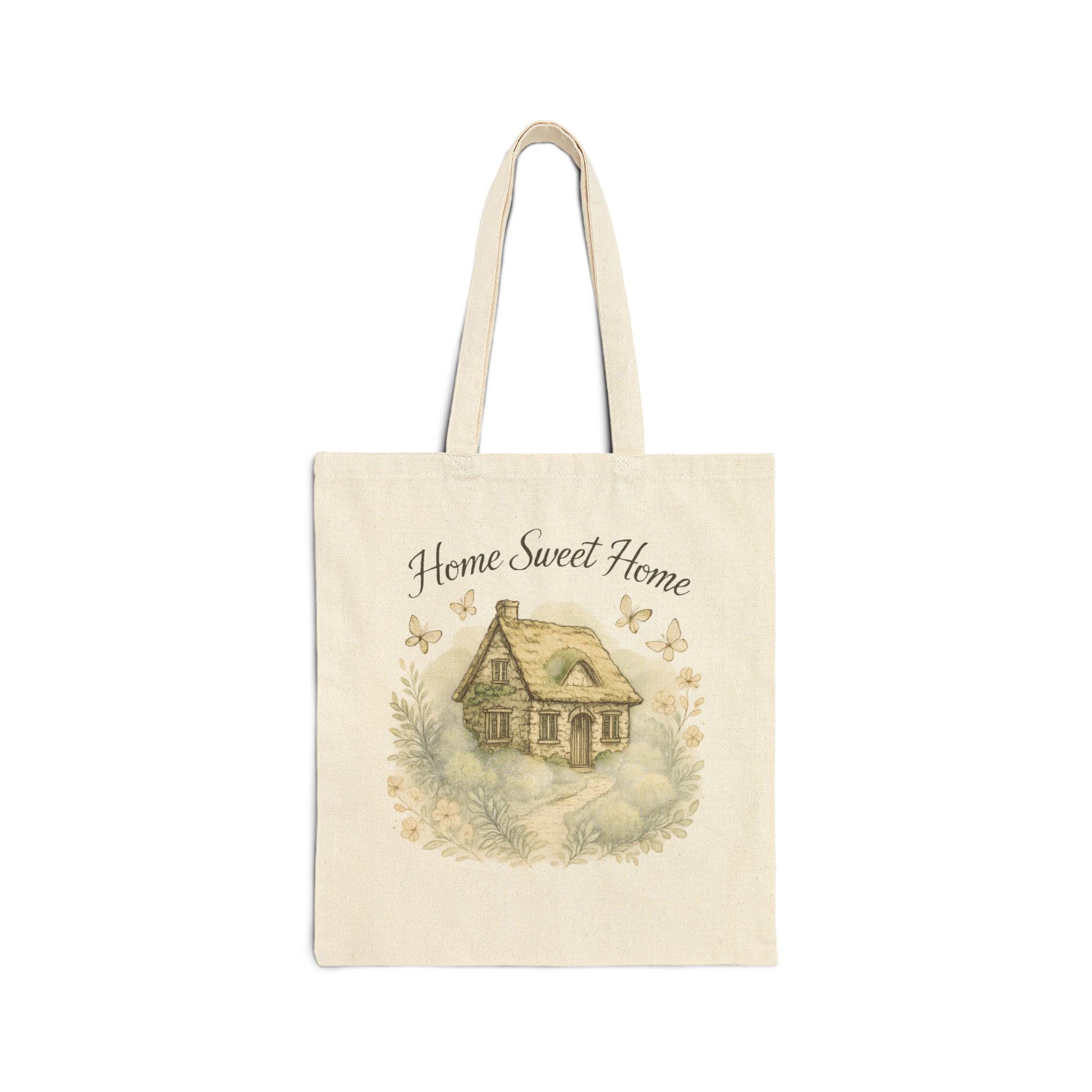 This cotton canvas tote carries a quiet, homespun feeling wherever you go. Printed with a soft watercolor cottage and the words “Home Sweet Home,” the natural canvas has a warm, lived-in look that settles into everyday life. The heavy-weight fabric holds its shape while the reinforced self-fabric handles make city commutes, farmers’ market runs, and weekend errands feel steady and intentional. It’s understated, cozy, and built to be used — bring it along to grocery runs, library visits, or as a gentle reminder of home on morning coffee walks.