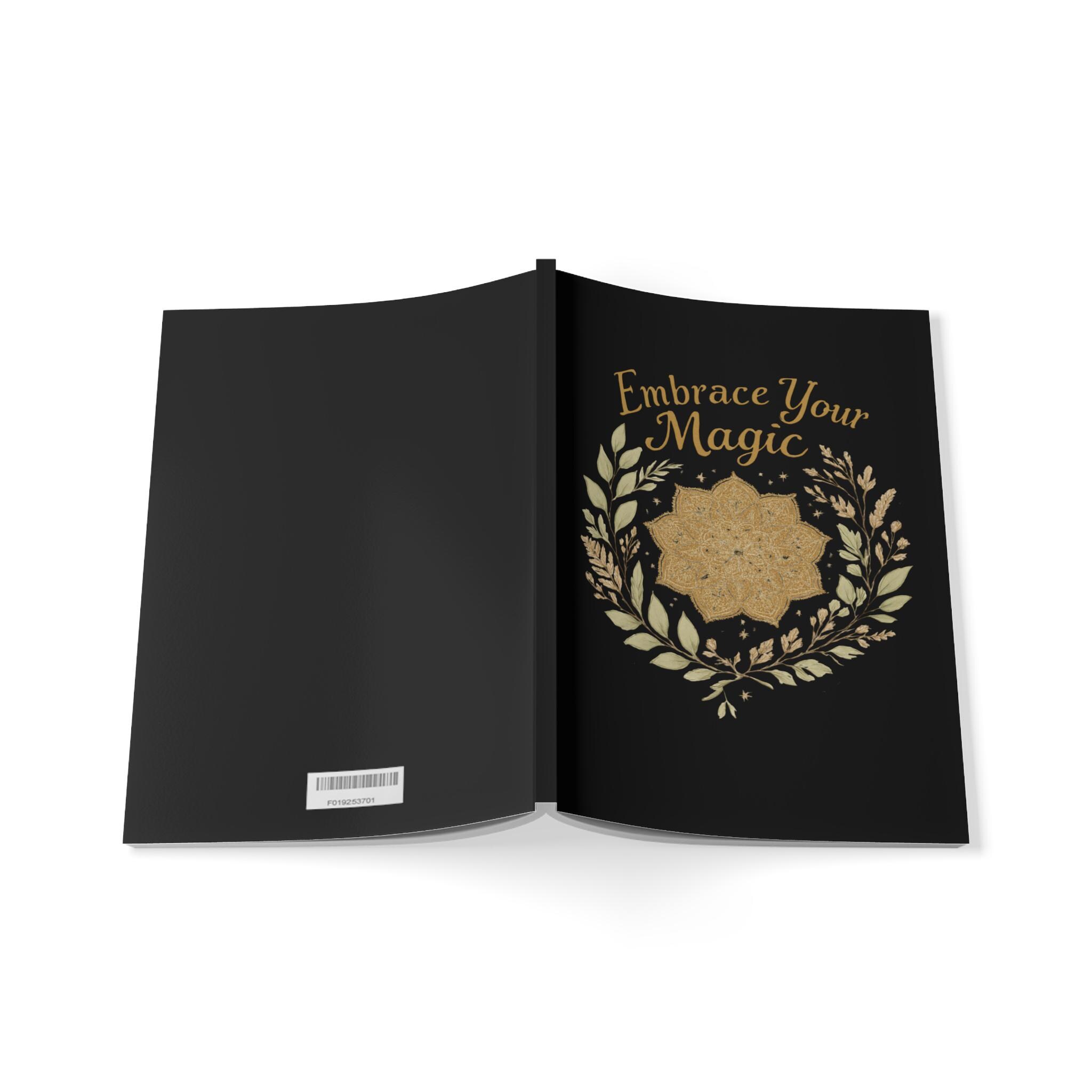 A5 softcover notebook designed for quiet moments of reflection and creative spark. The matte laminated cover is printed front and back in rich, saturated inks; a gilded mandala and hand-lettered message — "Embrace Your Magic" — sits against a deep black field, framed by delicate botanical laurel accents. Inside, 150 pages (90gsm lined paper) give every thought room to breathe and the perfect-binding spine lets the book open flat for easy note-taking, journaling, sketching, or list-making. Compact and light, it slips into bags or onto bedside tables so it's always close when inspiration arrives.