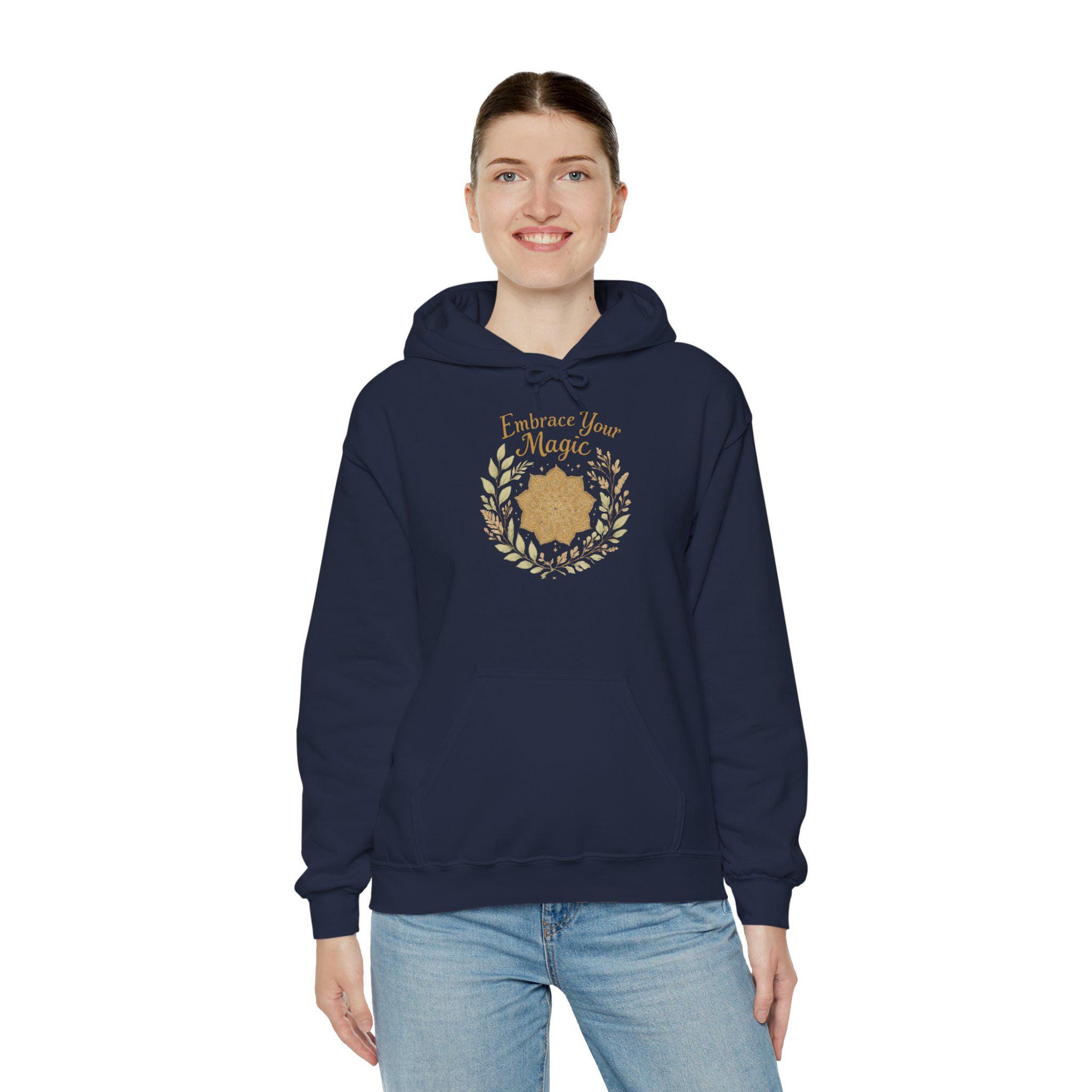 Soft, warm, and quietly magical — this hooded sweatshirt wraps you in calm. A delicate gold mandala sits within a gentle laurel wreath, topped with the whisper: “Embrace Your Magic.” It reads like a small, daily reminder: slow down, breathe, and meet yourself with kindness. The roomy kangaroo pocket and color-matched drawcords give it an effortless, lived-in feel. Wear it to morning rituals, late-night journaling sessions, or when you need a little confidence for running errands. The subtle embroidery-ready chest area means the piece can feel handcrafted and personal — like something carried forward through seasons of small rituals. Product features - Cozy 50/50 cotton–poly blend for warmth and softness - Kangaroo pouch pocket to keep hands warm - Adjustable drawstring hood with color-matched cord - Double-lined hood and classic fit for durability and comfort - DTF/DTG-friendly printing with optional embroidery placement Care instructions - Tumble dry: medium - Iron, steam or dry: low heat - Do not dryclean - Machine wash: cold (max 30C or 90F) - Non-chlorine: bleach as needed