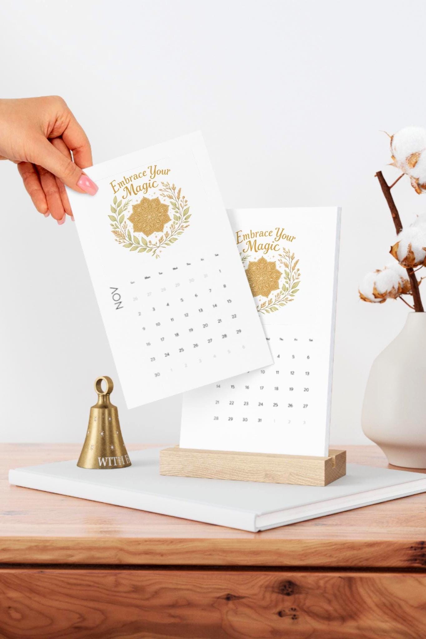 Vertical 2026 Desk Calendar -Motivational Mandala & Sage Wreath with Oak Wood Stand Decor