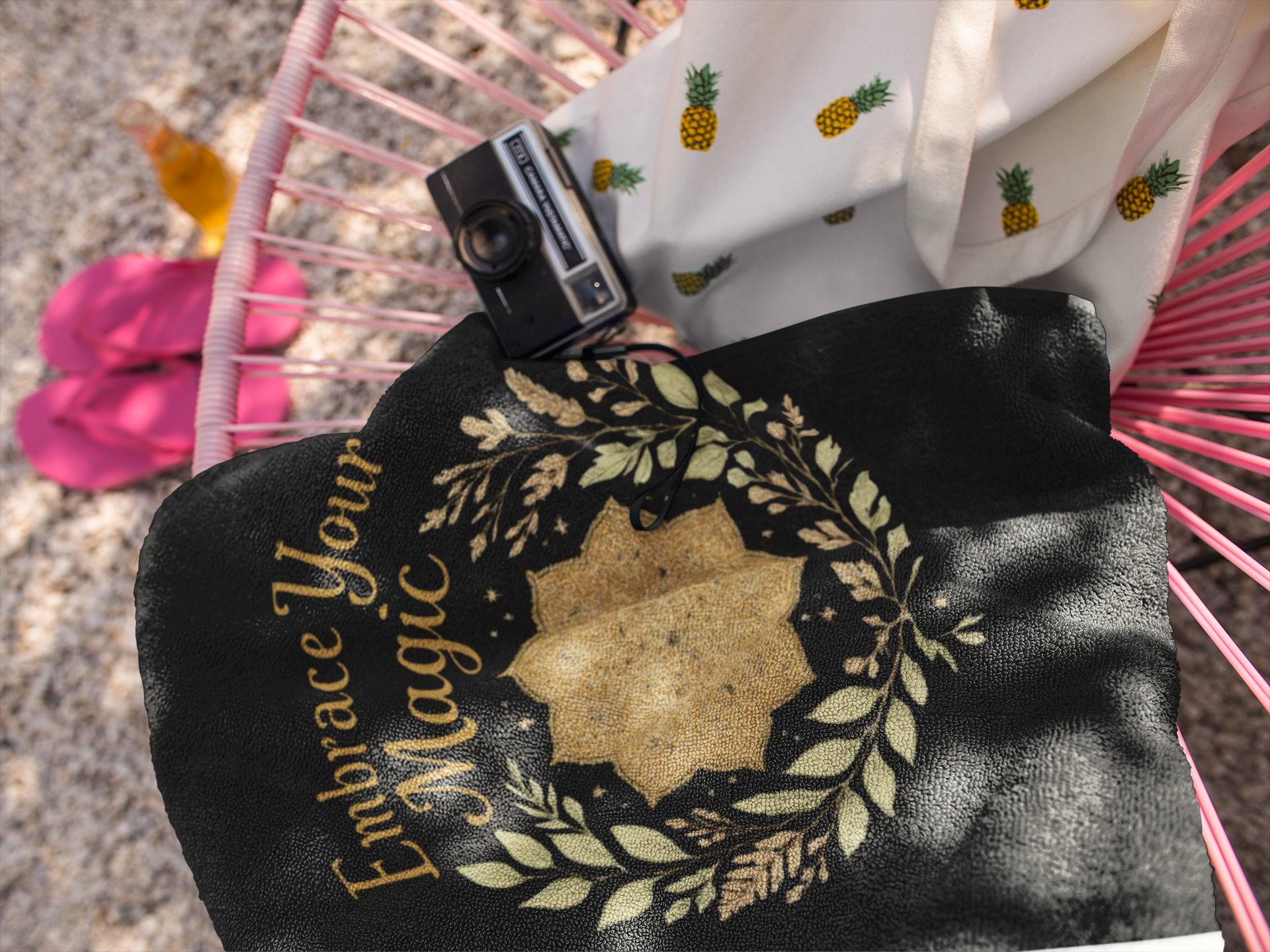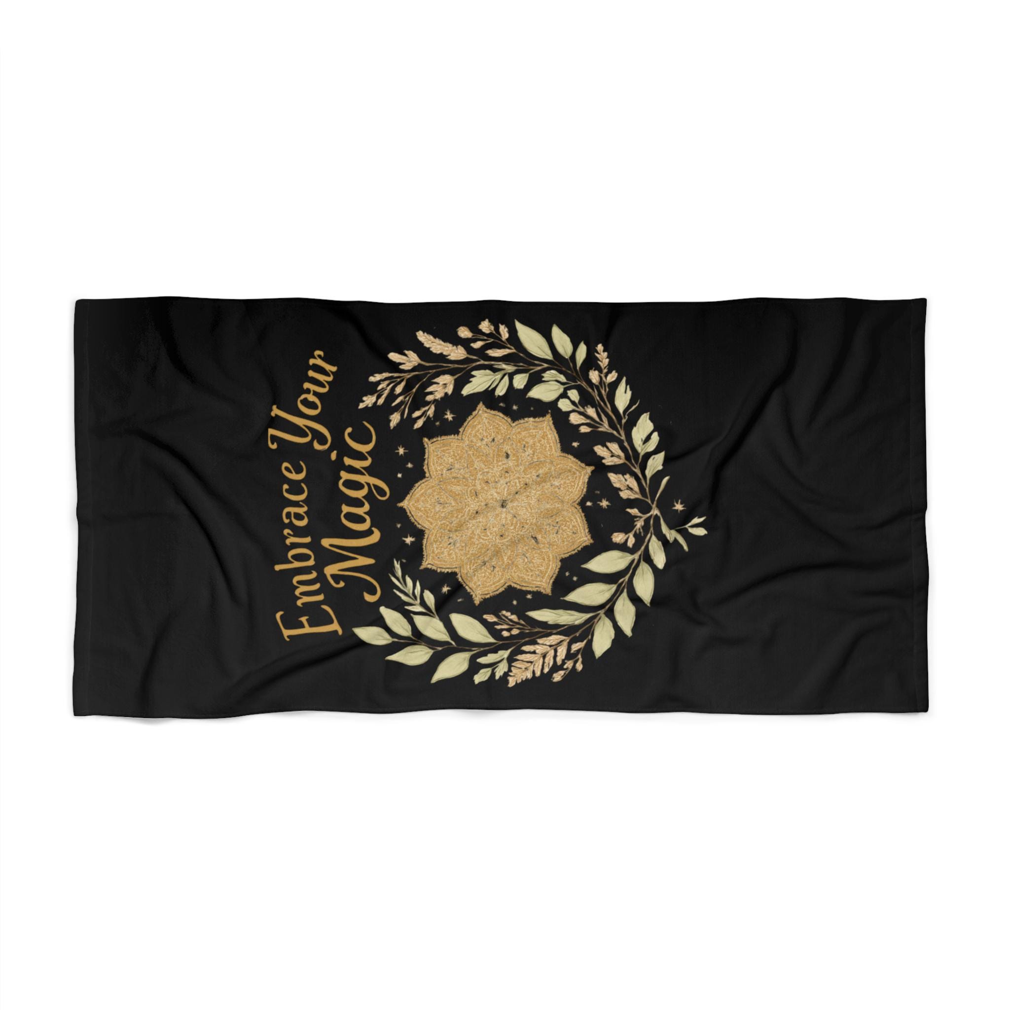 Soft, absorbent beach towel with a single-sided, artful print that invites calm and confidence. The black background makes the gold botanical wreath and centered mandala pop — the phrase "Embrace Your Magic" flows along the side in warm, hand-lettered type. Lightweight polyester on the front holds vivid color and dries quickly, while the cotton loop backing feels cozy against skin and soaks up water. Available in two generous sizes for lounging or wrapping up after a swim. Durable hemmed edges keep the towel intact through repeated use and washes.
