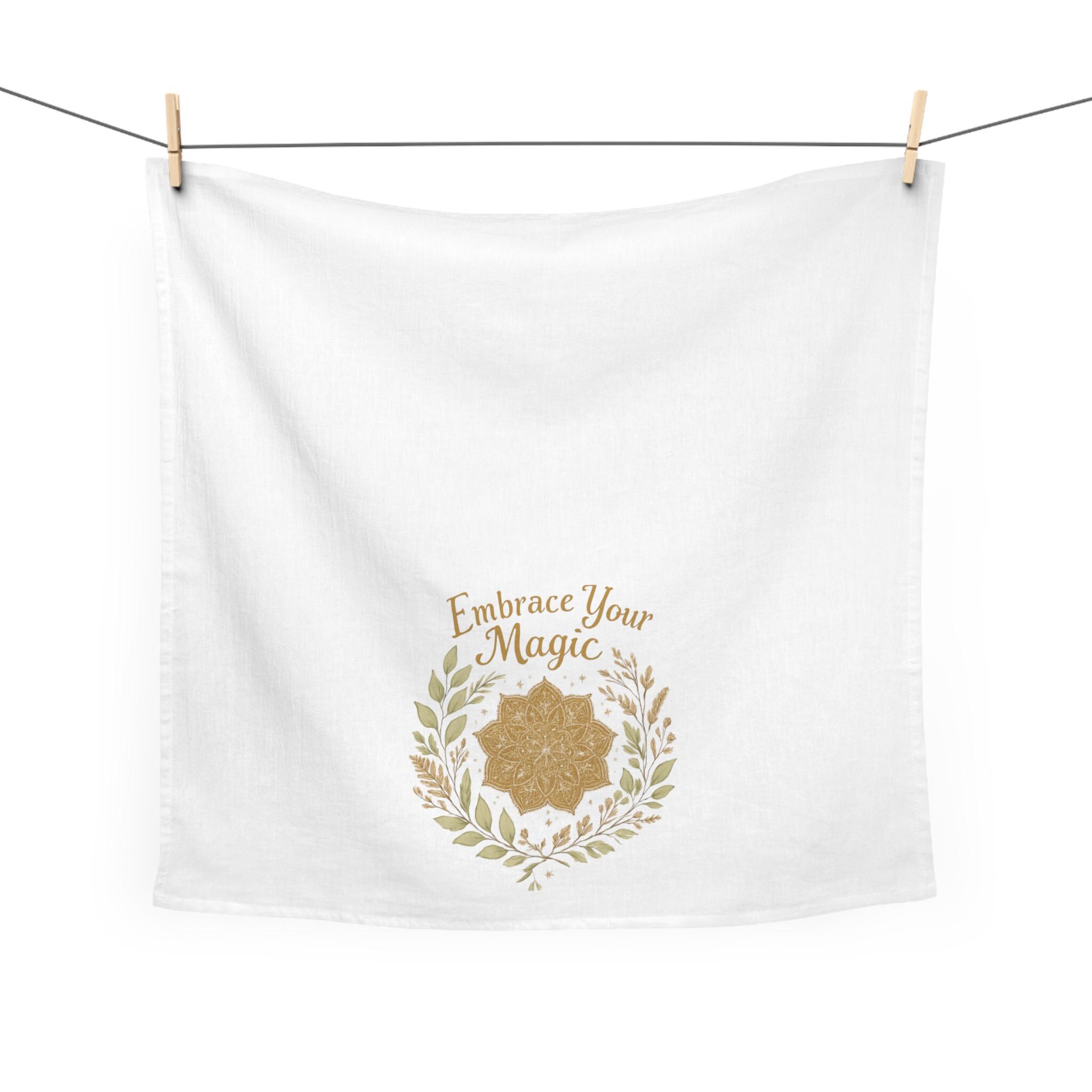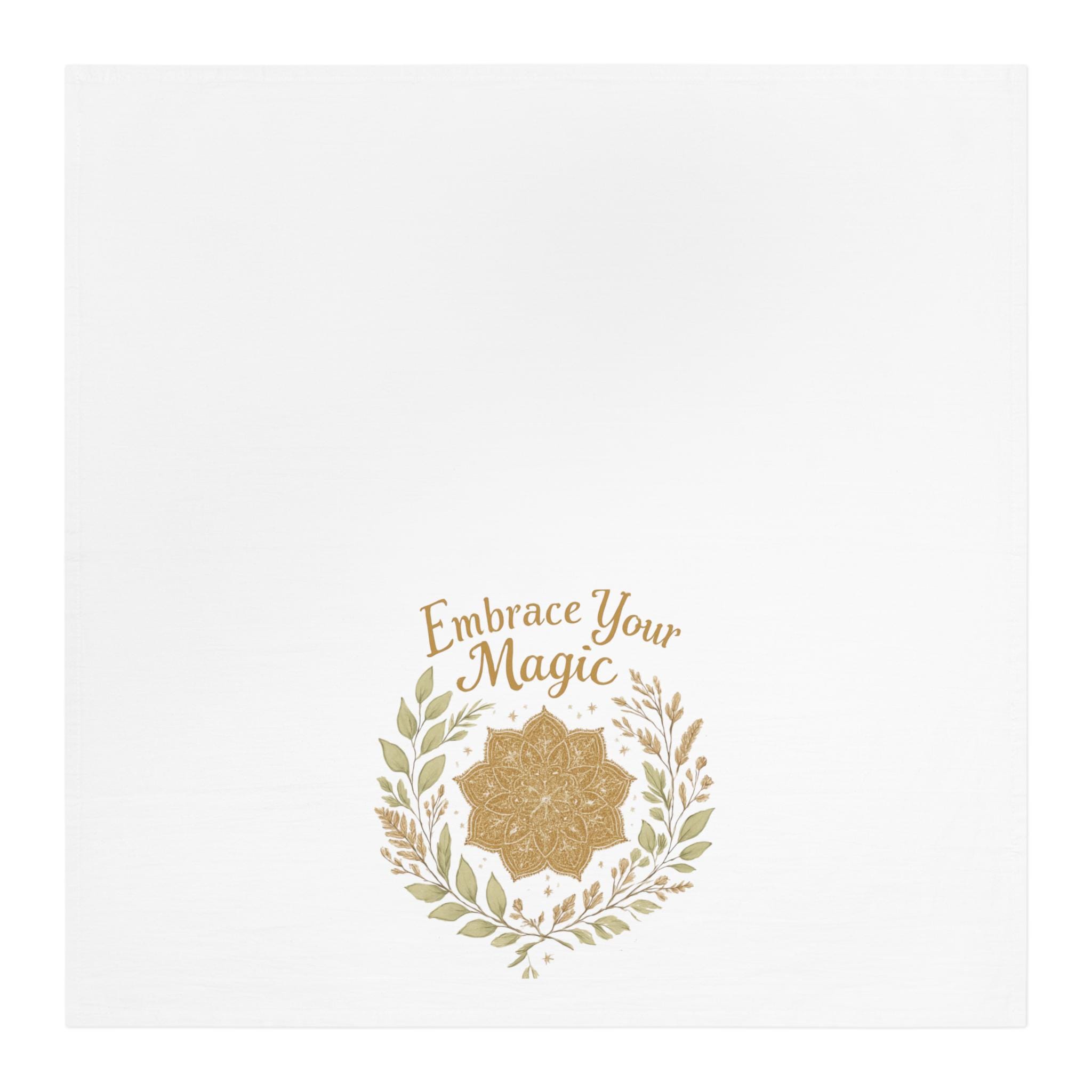 Soft, linen-bright cotton printed with a gentle, nature-inspired message: “Embrace Your Magic.” A warm gold mandala blooms at the center, framed by hand-drawn olive and sage foliage. The cloth feels light in your hands and moves easily—great for wiping up a spill, drying delicate glassware, or folding onto a shelf where it becomes a small, steady reminder to slow down. It brings a quiet, botanical calm to morning routines and evening rituals alike.