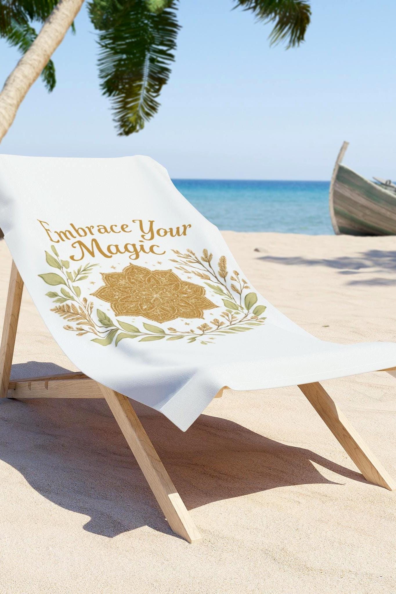 Lightweight and sun-warmed, this beach towel carries a calm, sunlit energy. A hand-drawn mandala blooms in golden tones, framed by delicate olive and sage leaves, with the hopeful phrase “Embrace Your Magic” arcing beside it. The single-sided print sits on a smooth polyester face that shows color and detail beautifully, while a soft cotton-loop backing gives sit-down comfort and real absorbency. It lays flat on sand or a chair, folding into your weekend ritual as you read, stretch, or watch the tide. Bring a little quiet confidence to beach days, lake afternoons, and slow summer mornings—the design feels like a small reminder to breathe, notice, and lean into your own warmth.