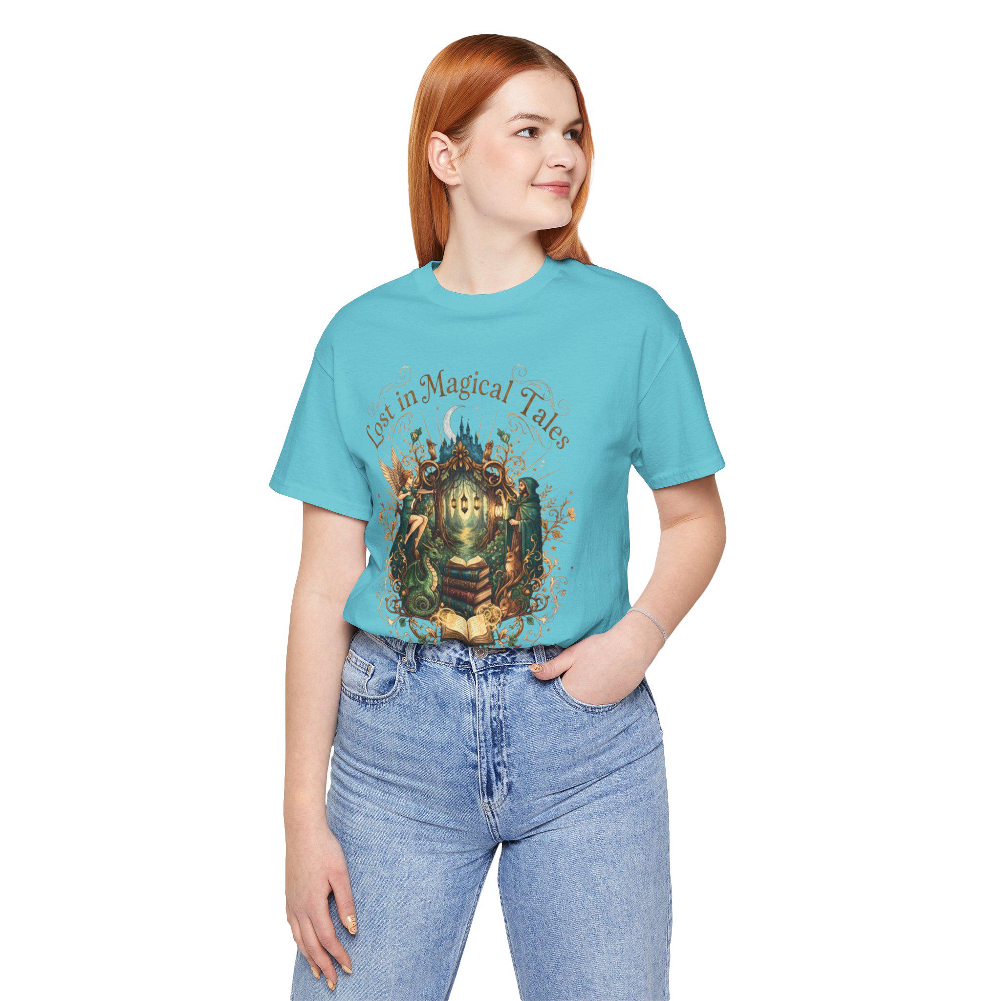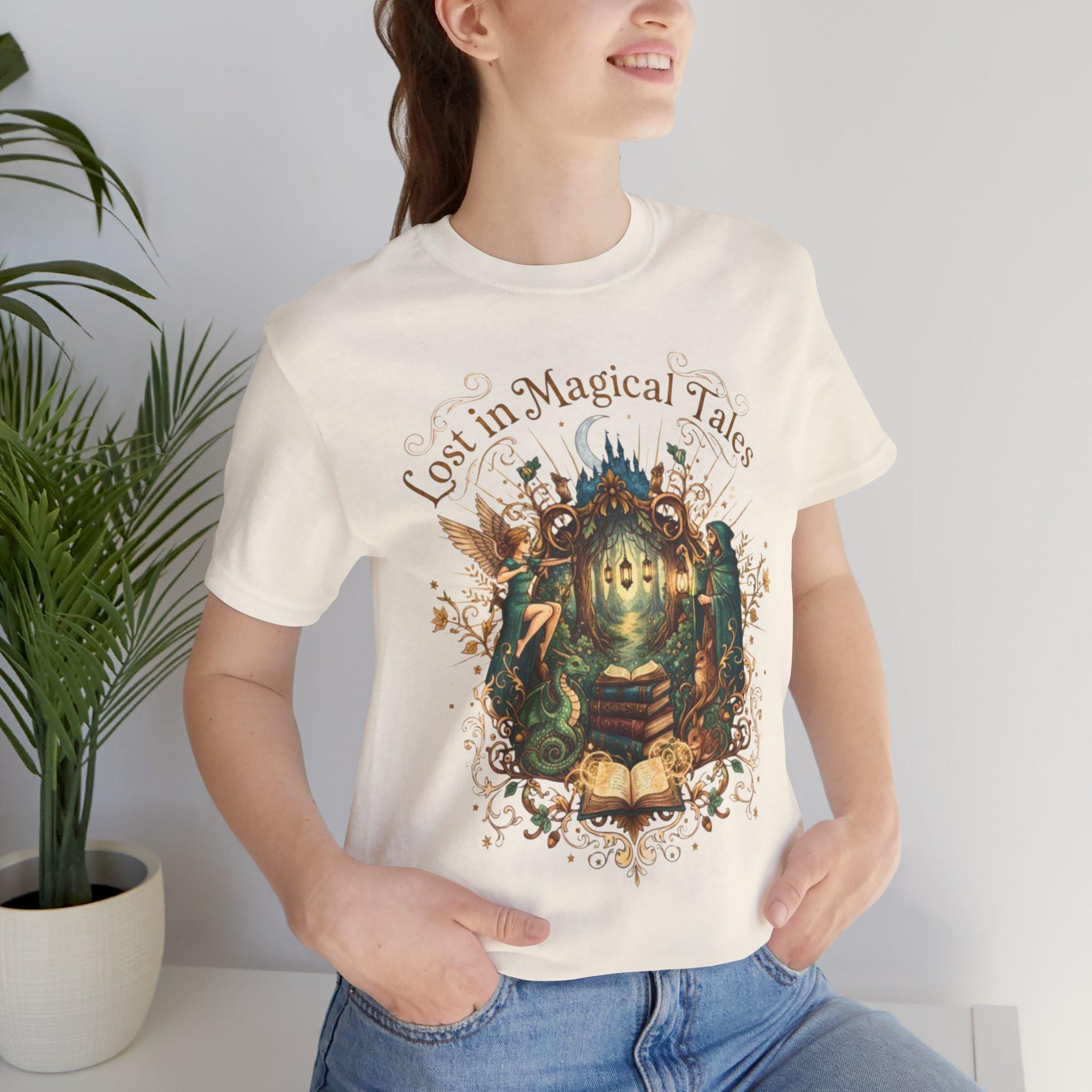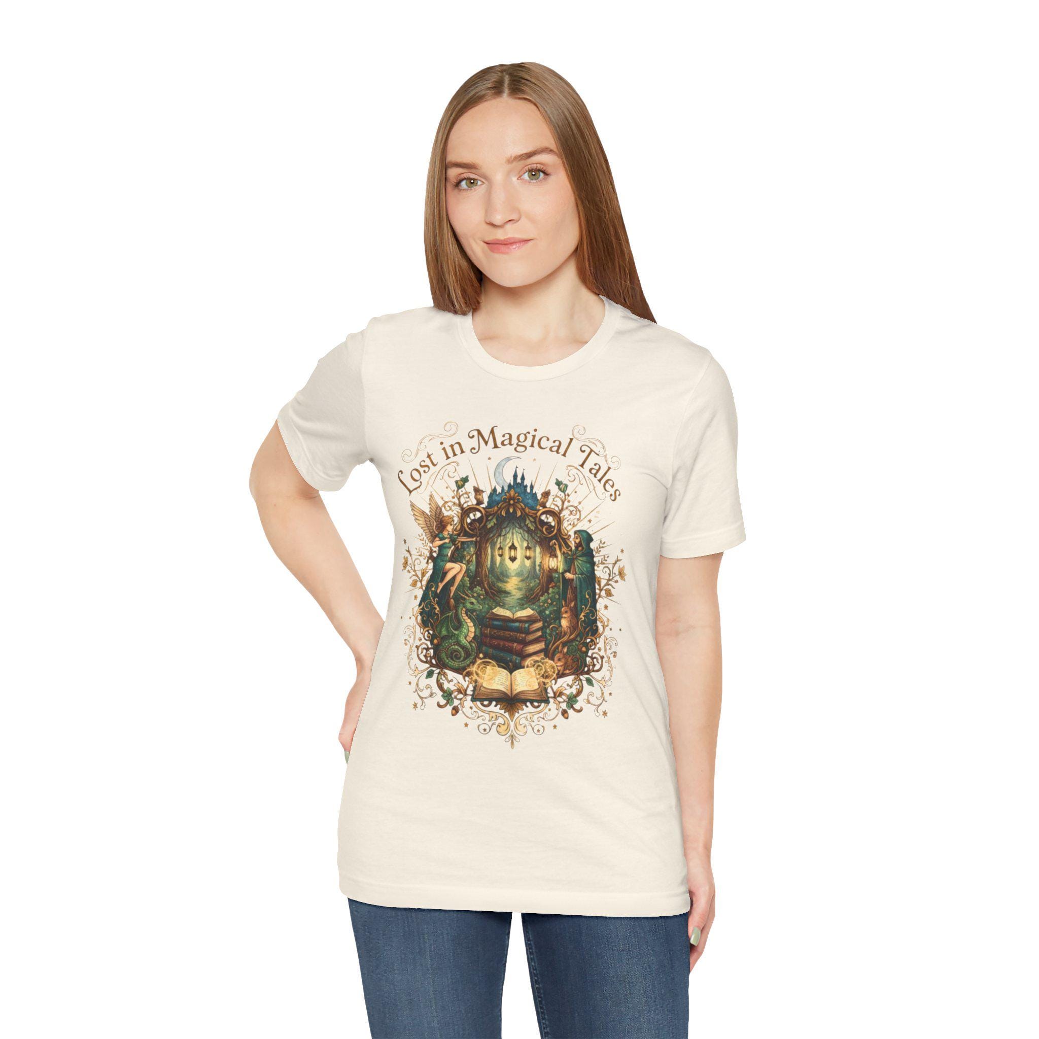 Walk into a story with this lightweight Bella Canvas tee, where soft airlume cotton meets an illustrated doorway to wonder. The design centers on an ornate, storybook portal framed by books, foliage, and warm metallic tones that read like a page lifted from a beloved fantasy novel. It lays comfortably against the skin and layers easily under jackets or over long sleeves, so the art can travel from quiet coffee-shop mornings to evening book-club hangs. Wear it when you want your outfit to whisper ‘adventure’—to readers who seek cozy worlds, to librarians who love a secret shelf, to festival wanderers chasing fairy‑market light. The retail crew neckline keeps the look tidy and easy to accessorize; the tear-away label and stable shoulder tape keep it comfortable for long days of searching shelves and stories.