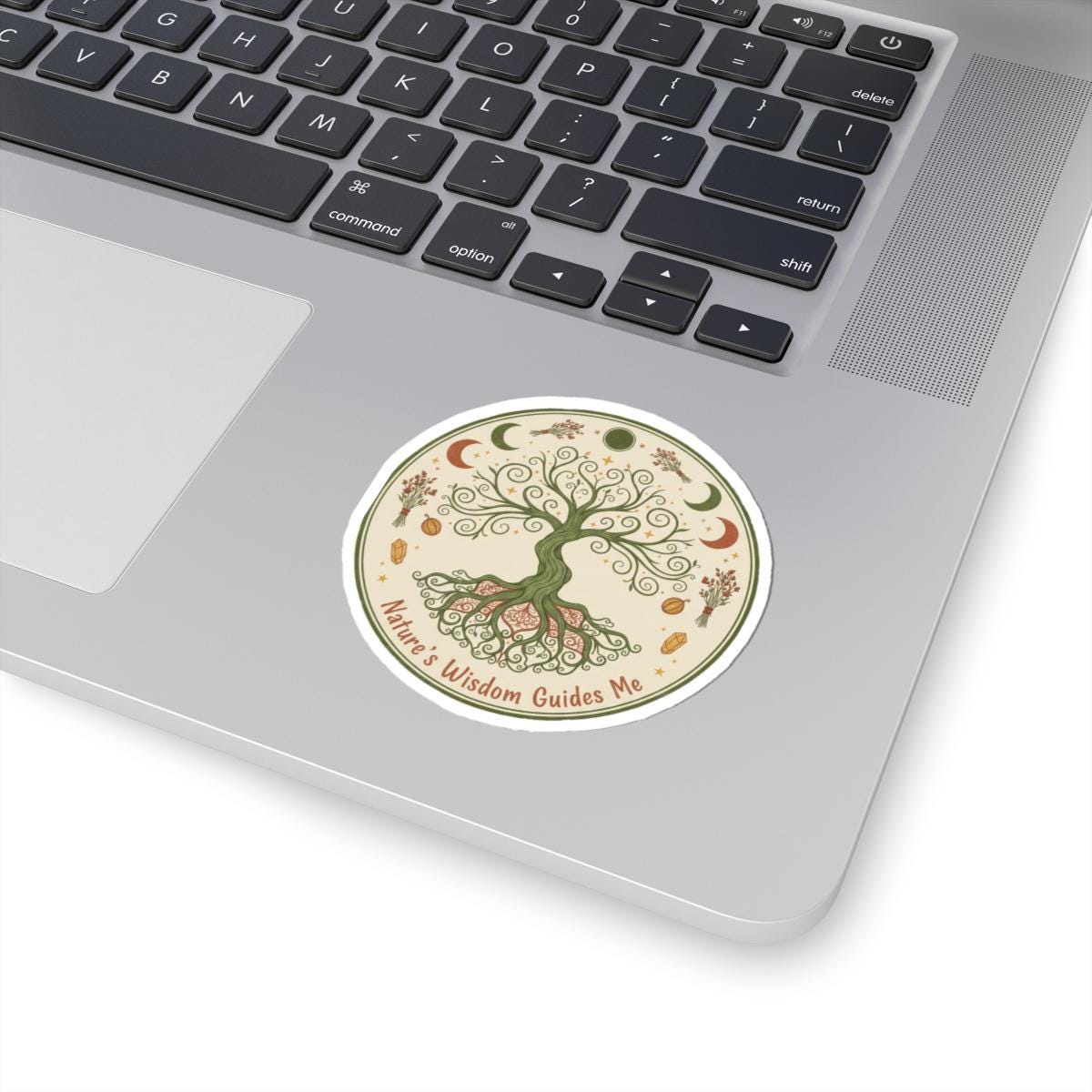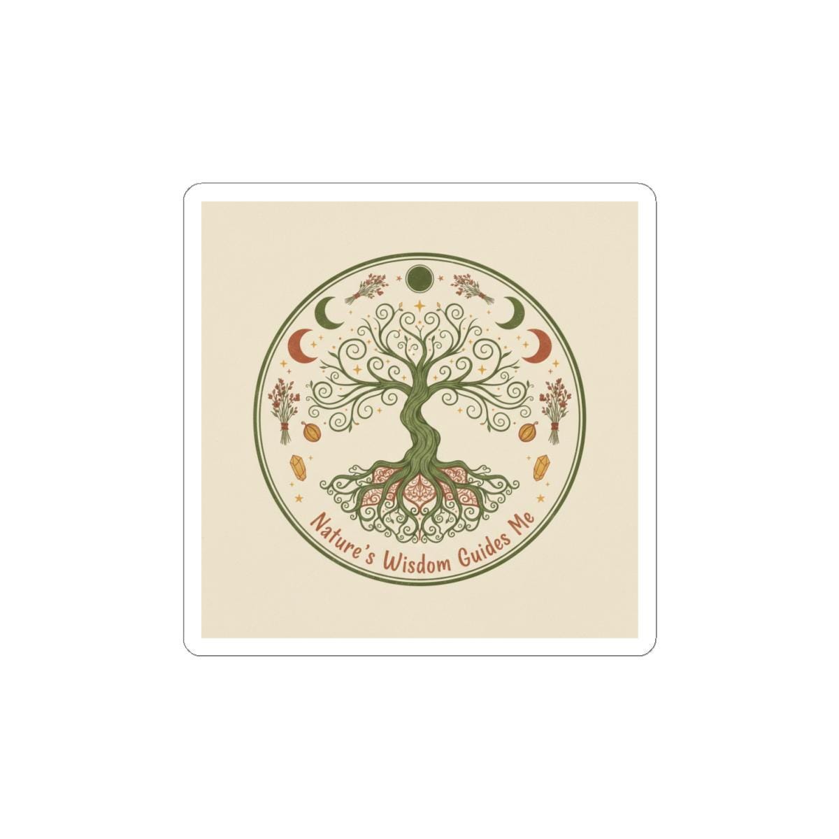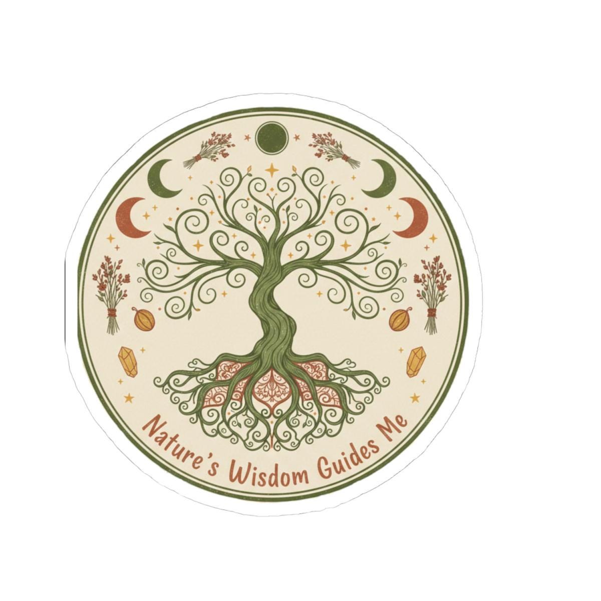 A glossy kiss-cut vinyl sticker featuring an earthy Tree of Life motif surrounded by moons, stars, herbs, and seeds. Soft cream and muted green tones create a calm, cottagecore vibe that reads like a tiny talisman: “Nature’s Wisdom Guides Me.” It clings smoothly to laptops, journals, water-resistant phone cases, or windows, adding a subtle, nature-first accent to everyday items. The finish catches light without overwhelming the delicate linework, so the design feels both handcrafted and durable—an intimate reminder to slow down and listen to the natural world.